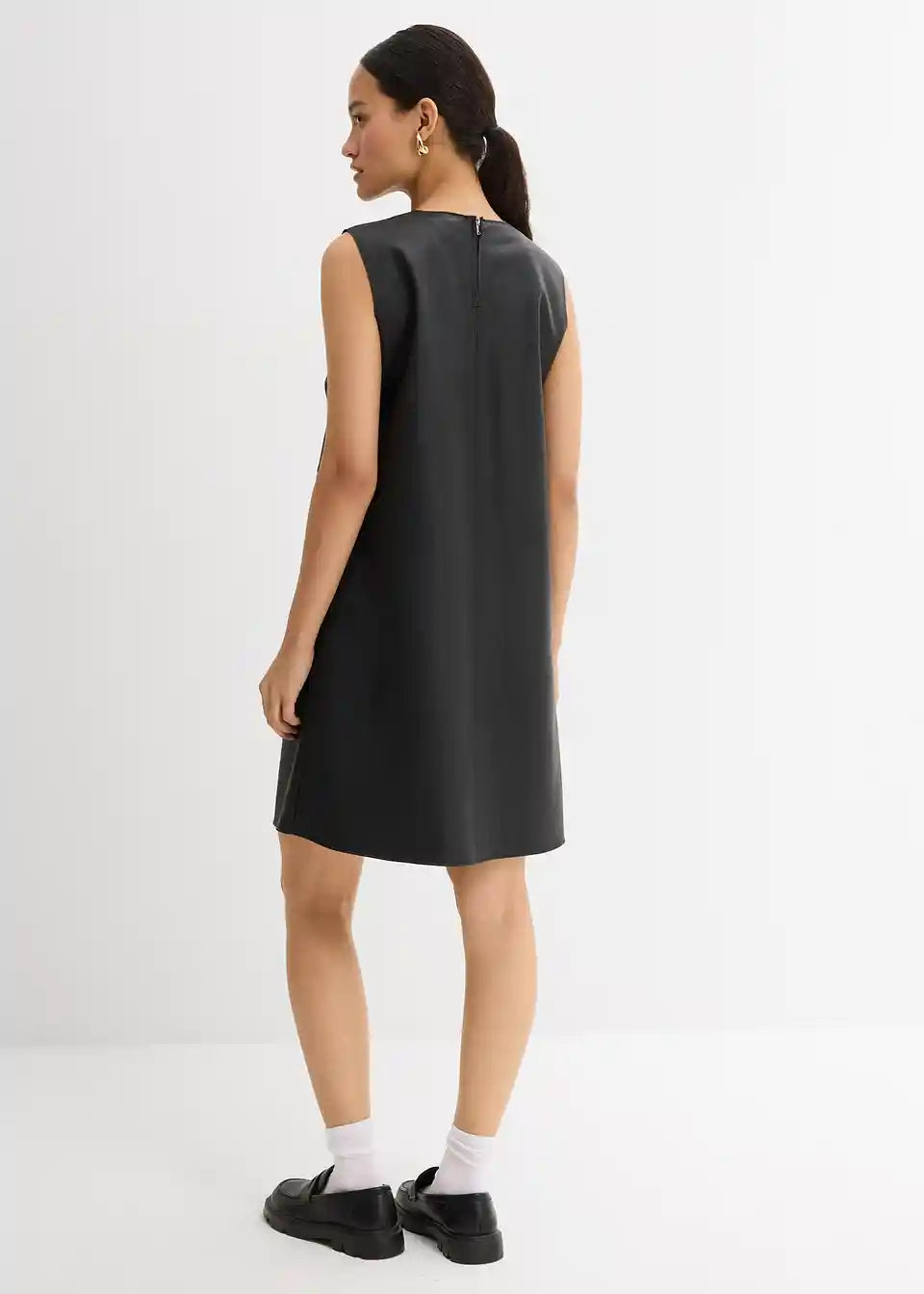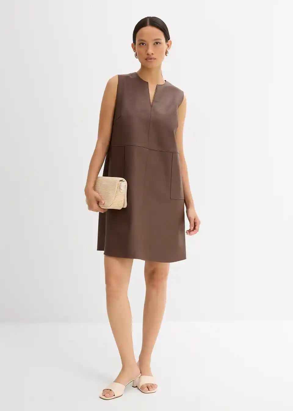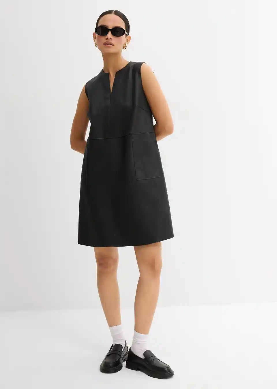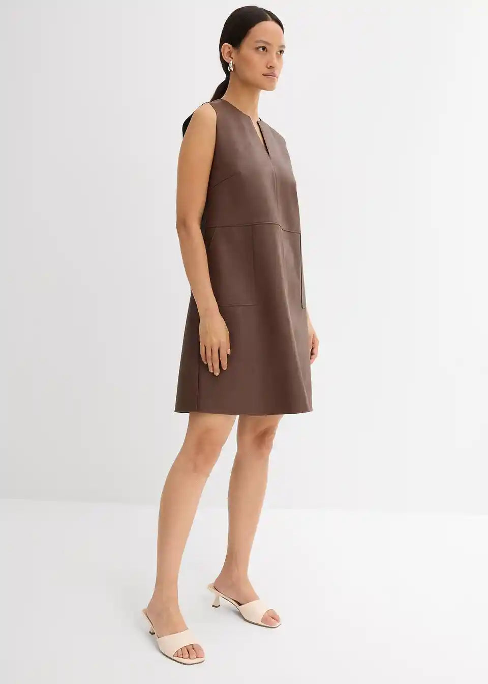 Obleka iz umetnega usnja brez rokavov z barvno skaldnimi prešivi, z našitimi žepi spredaj ter zapenjanjem z zadrgo zadaj