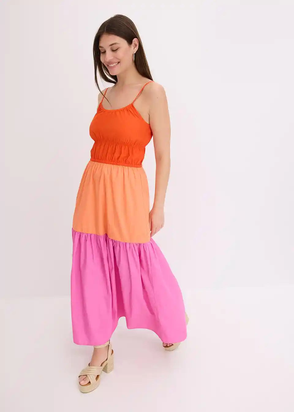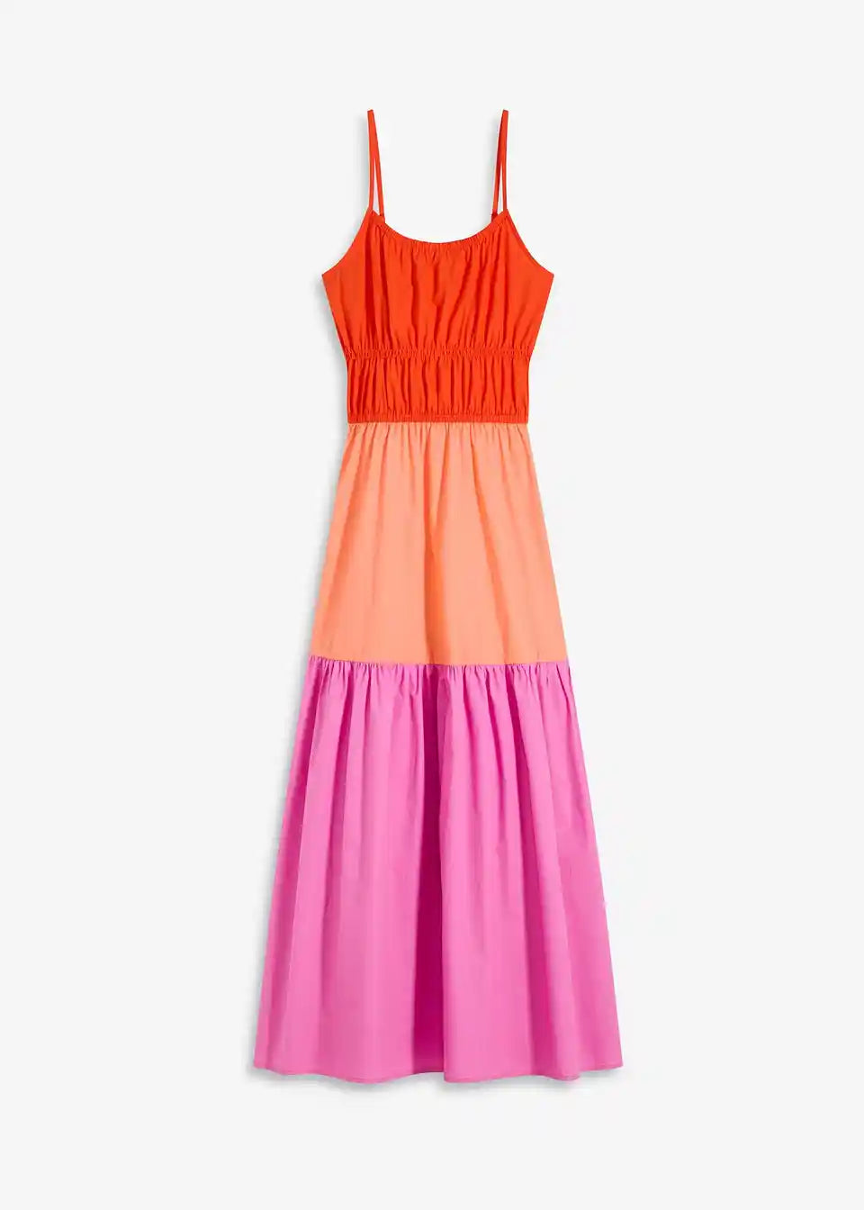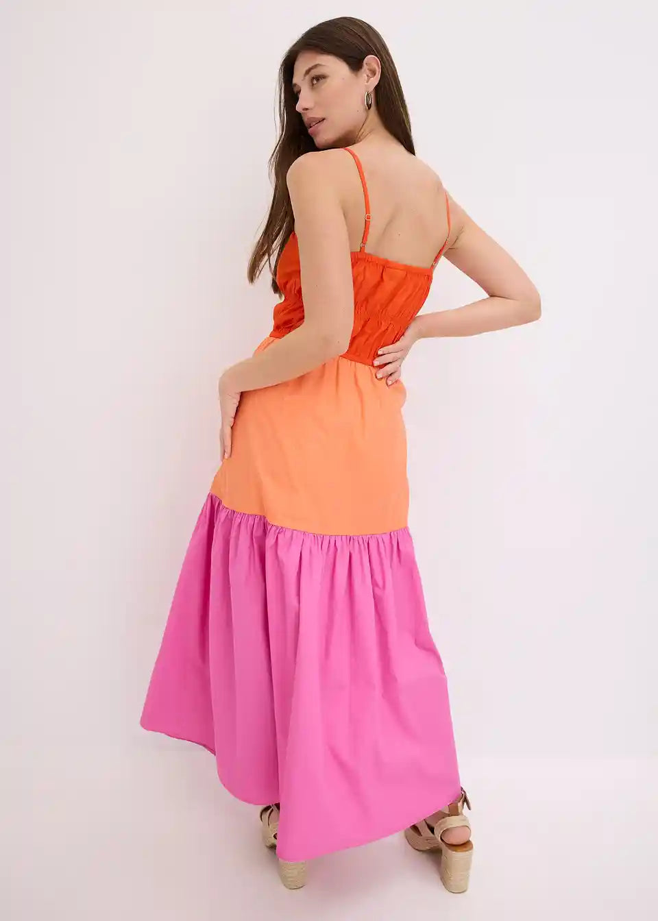 moderna maksi obleka iz čistega bombaža v color-blocking dizajnu z nastavljivimi tankimi naramnicami in elastičnimi detajli v pasu