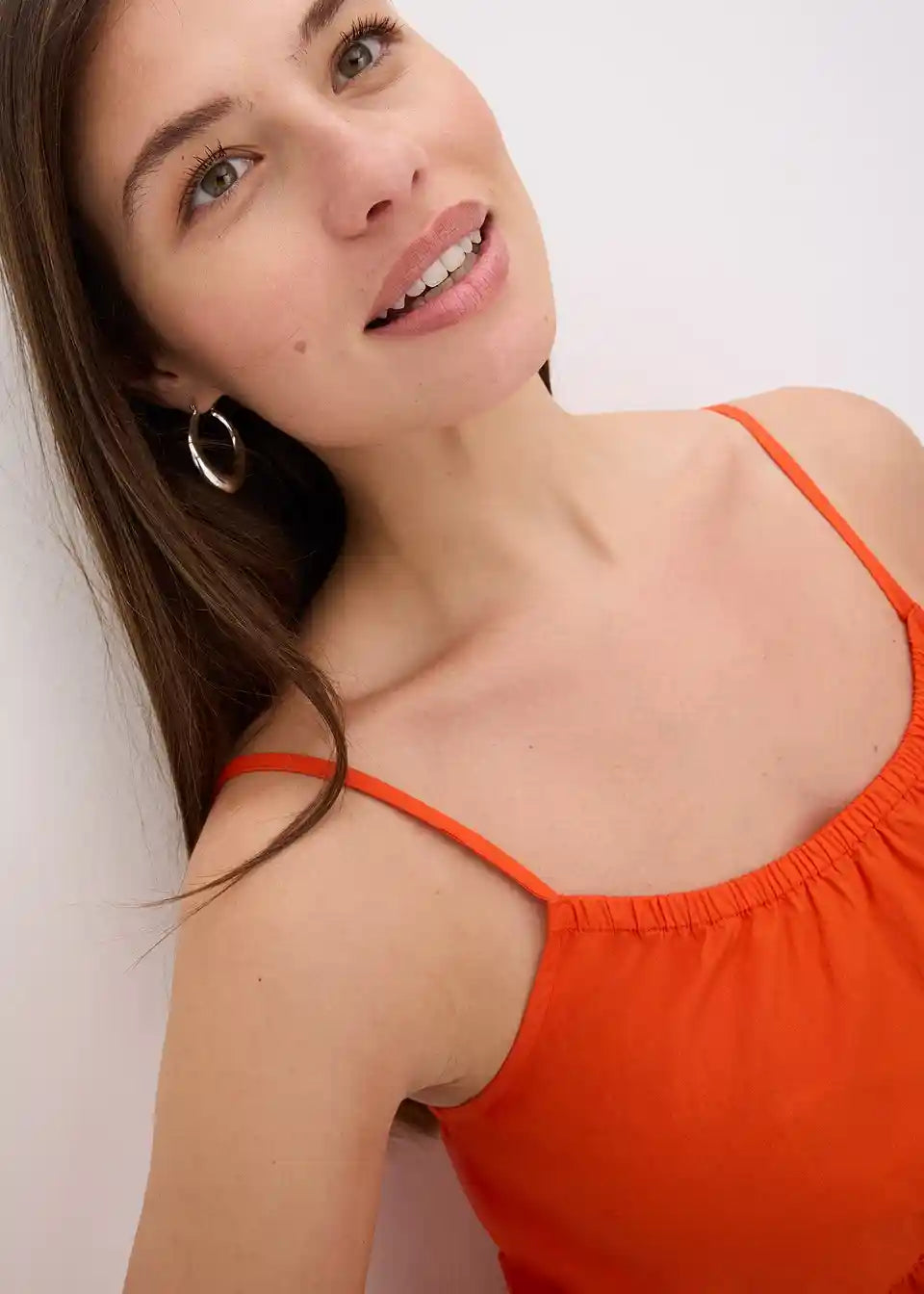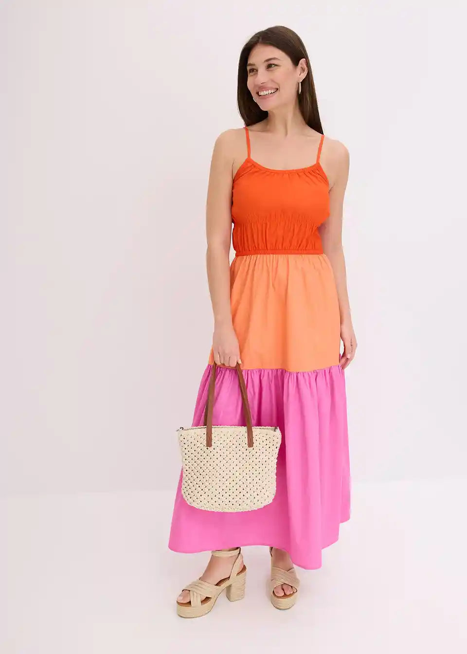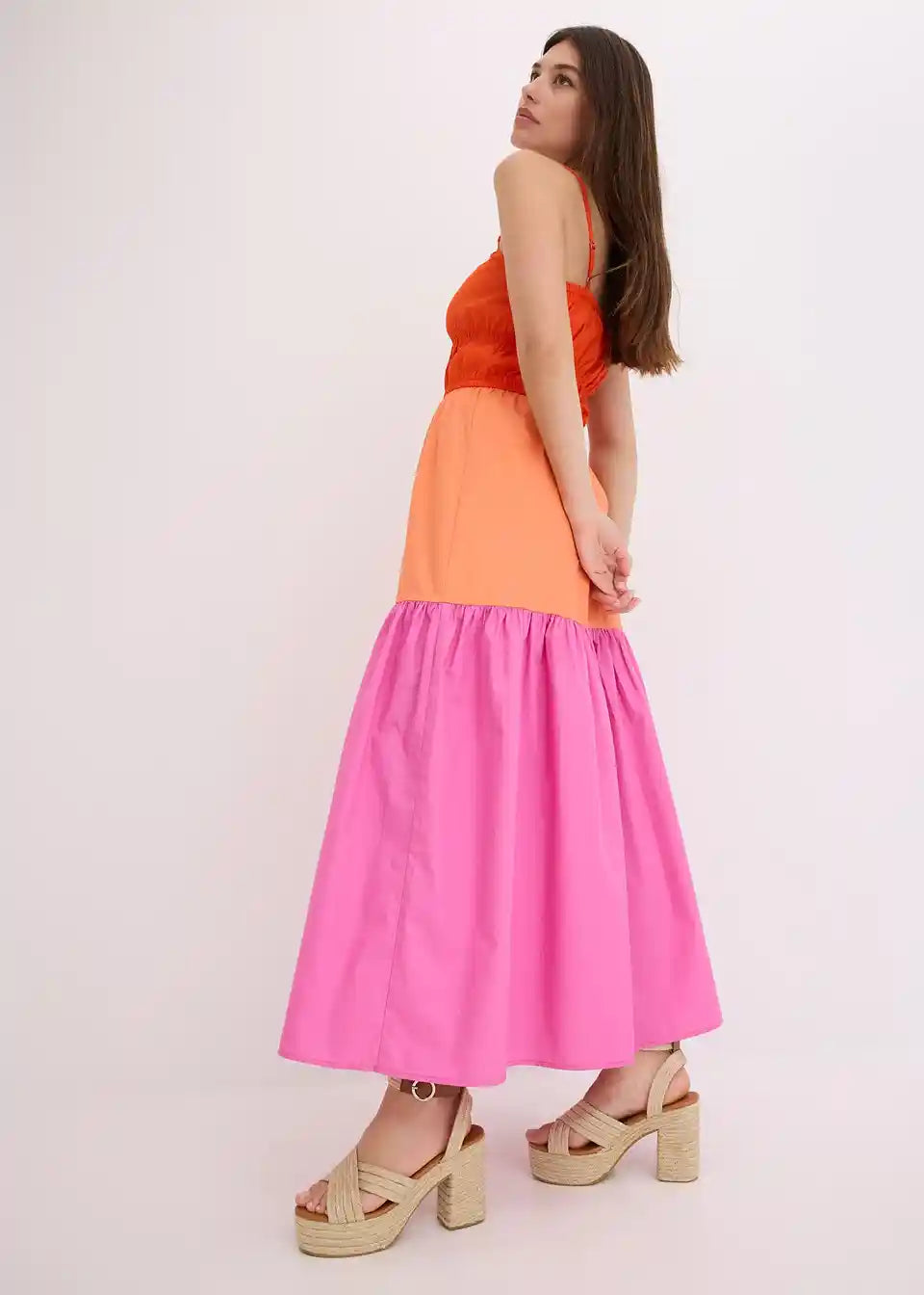 moderna maksi obleka iz čistega bombaža v color-blocking dizajnu z nastavljivimi tankimi naramnicami in elastičnimi detajli v pasu