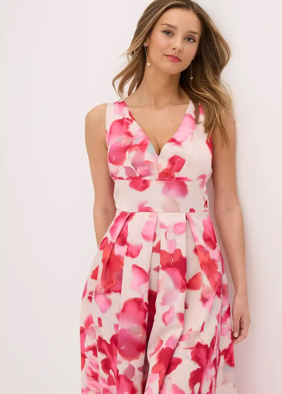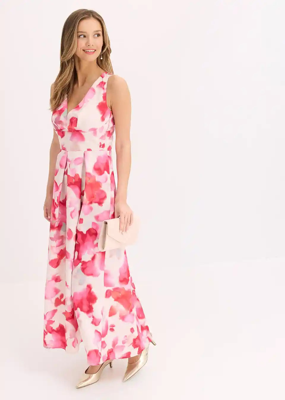 Moderna in ženstvena: Maksi obleka z všitkom v pasu in plisiranim krilom iz sijočega satena s cvetličnim potiskom