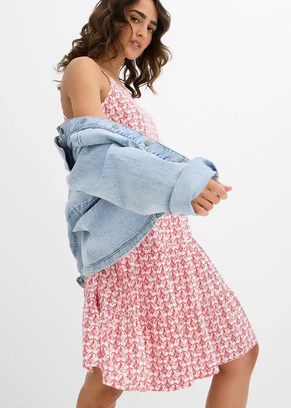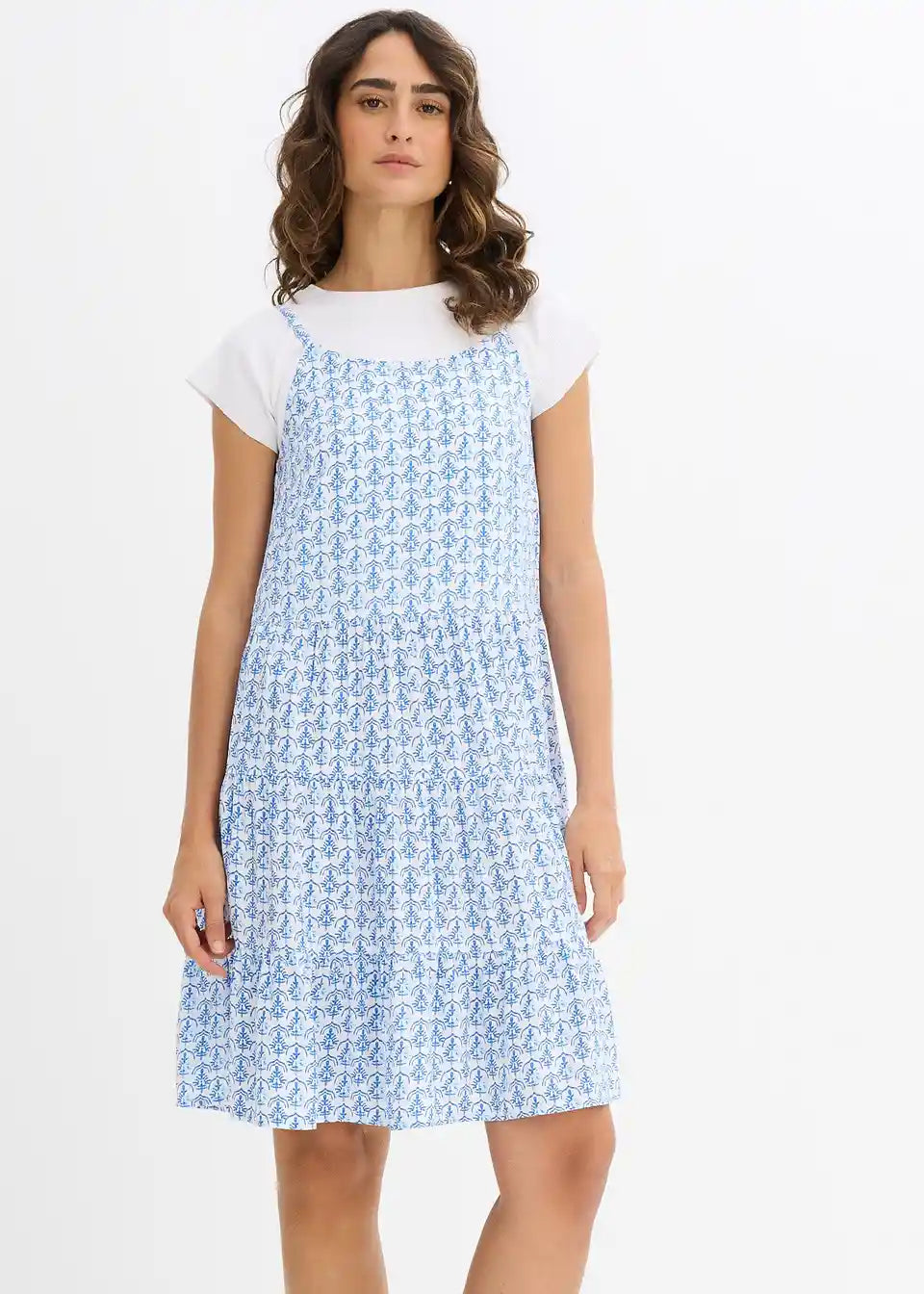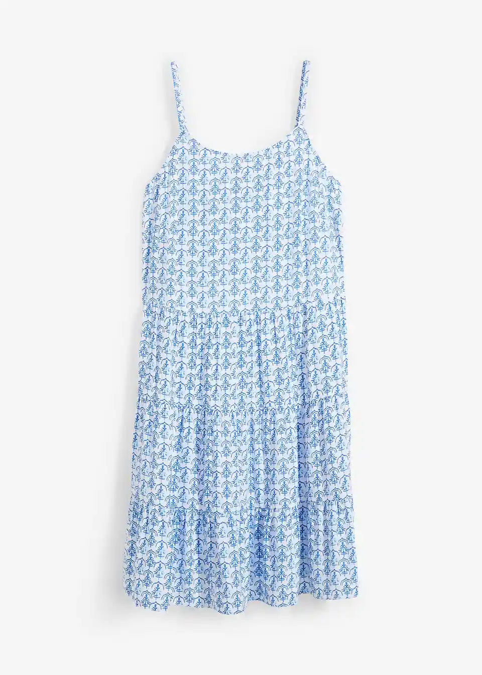 Tiskana, kratka obleka z naramnicami iz tekoče viskoze z volančki