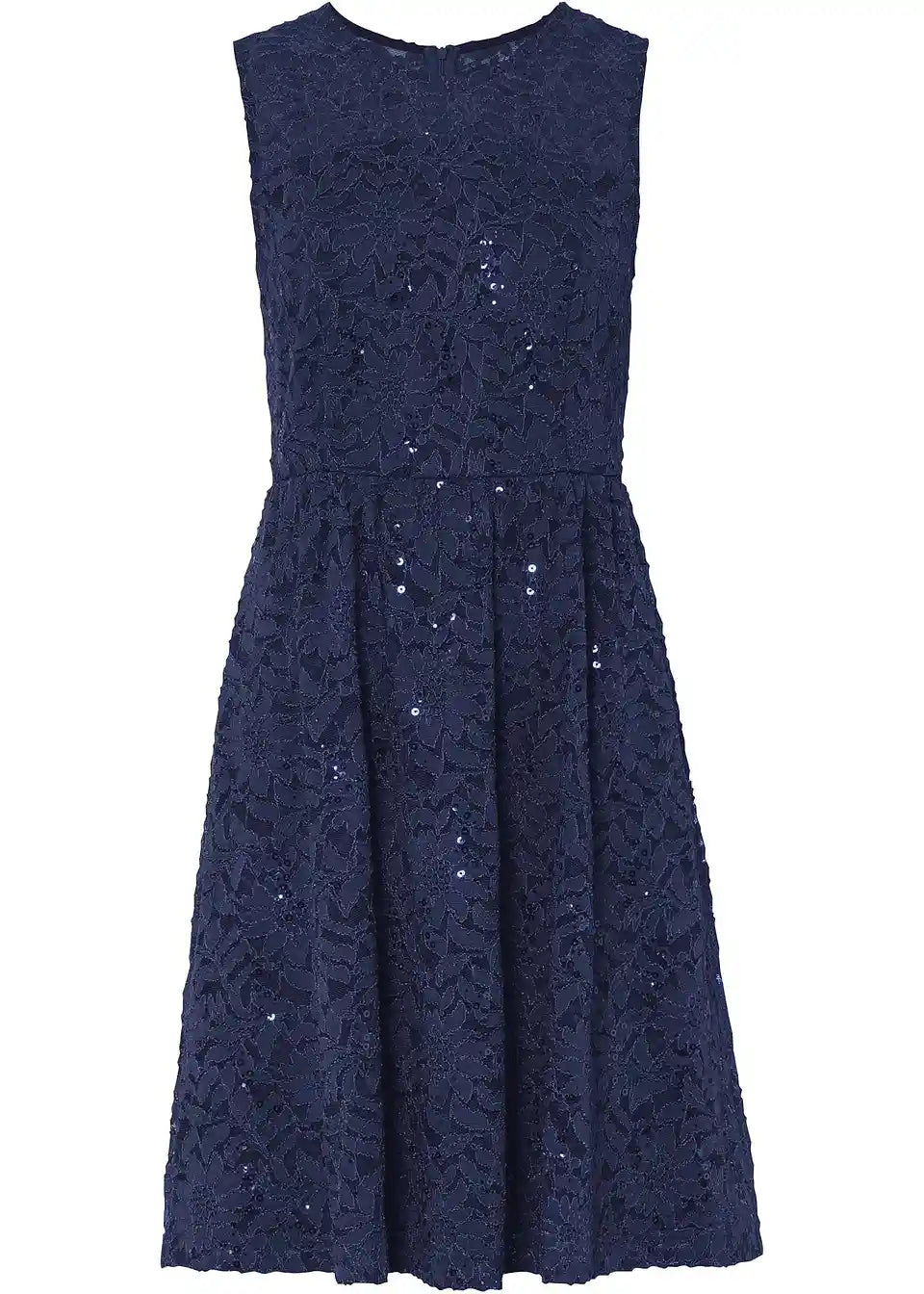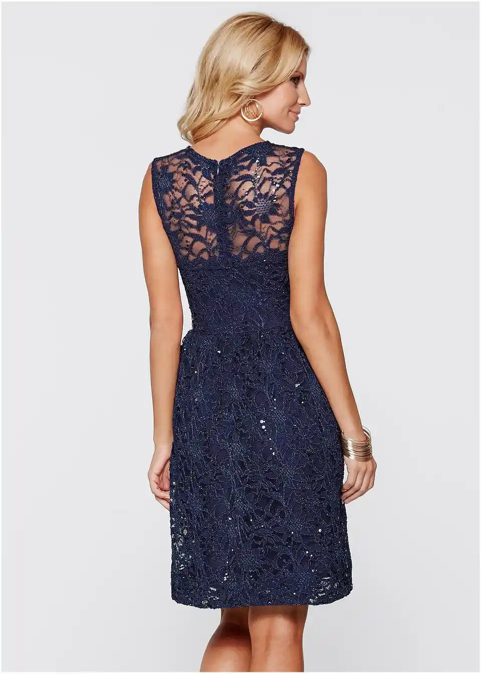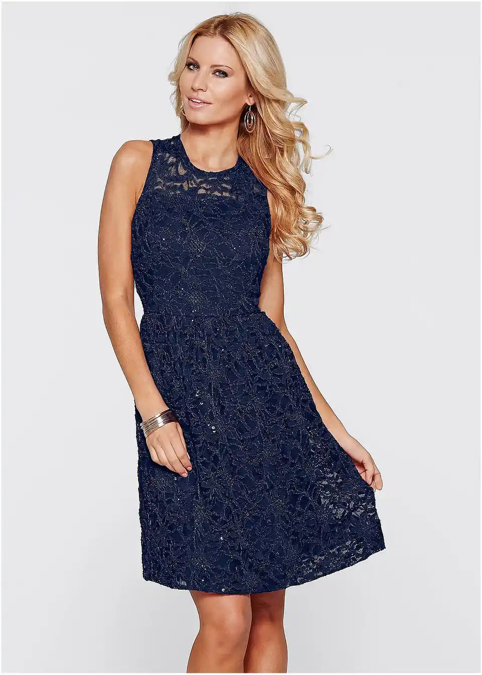 Ta razkošna čipkasta obleka z lepo nihajočim krožnim krilom prinaša neustavljiv čar šestdesetih let. Zelo zanimiv detajl je prozoren vložek tik pod prilegajočim se okroglim izrezom. Brezrokavna obleka doseže svoj poln učinek v kombinaciji s preprostimi dodatki, kot so filigranske sandale in mini torbica.