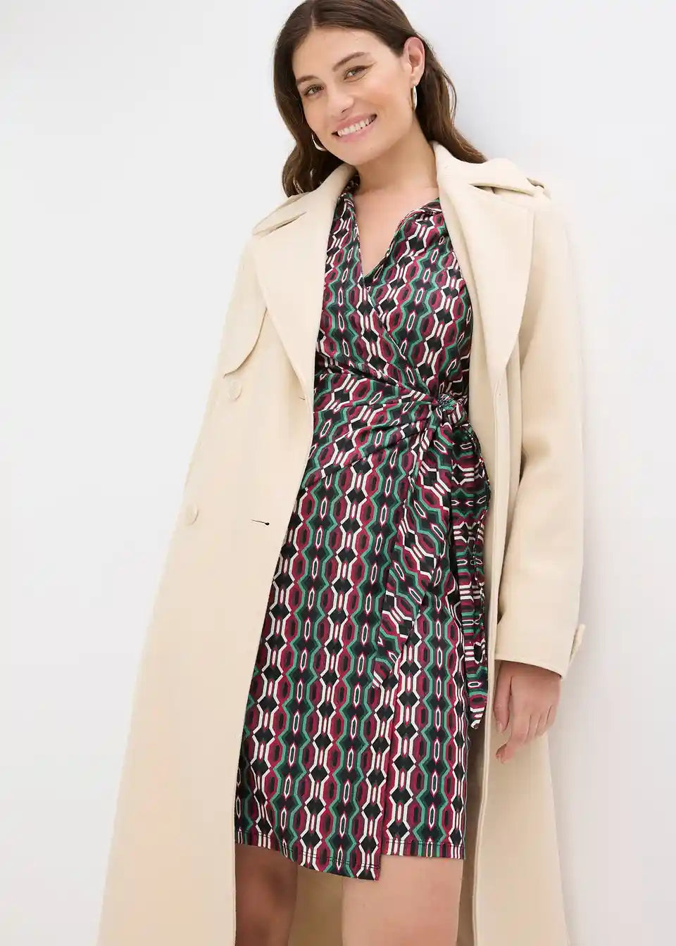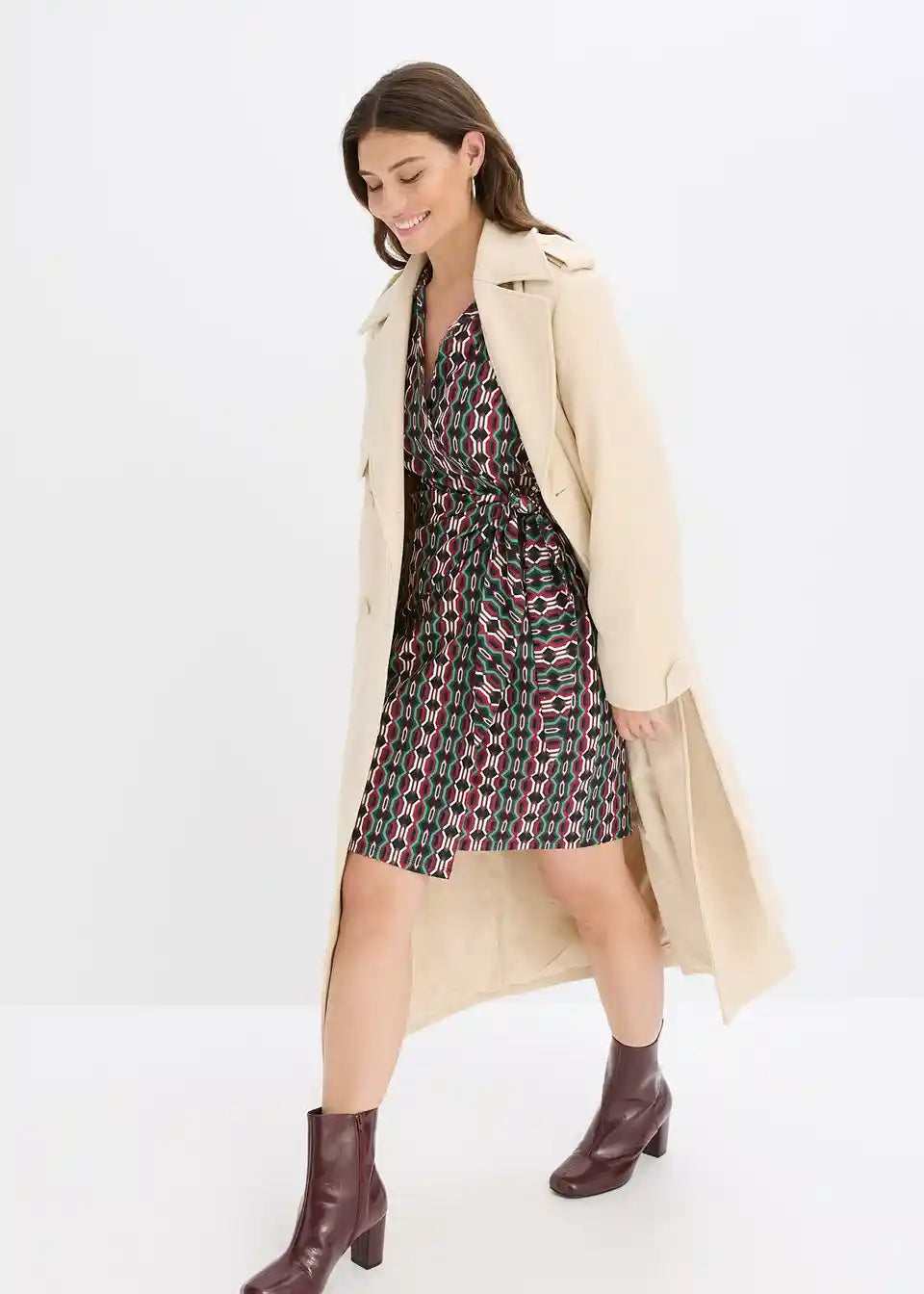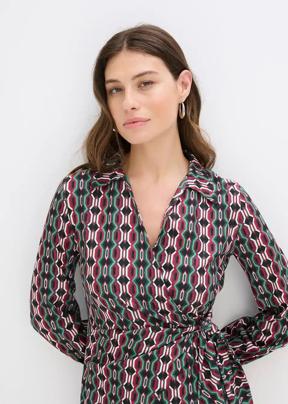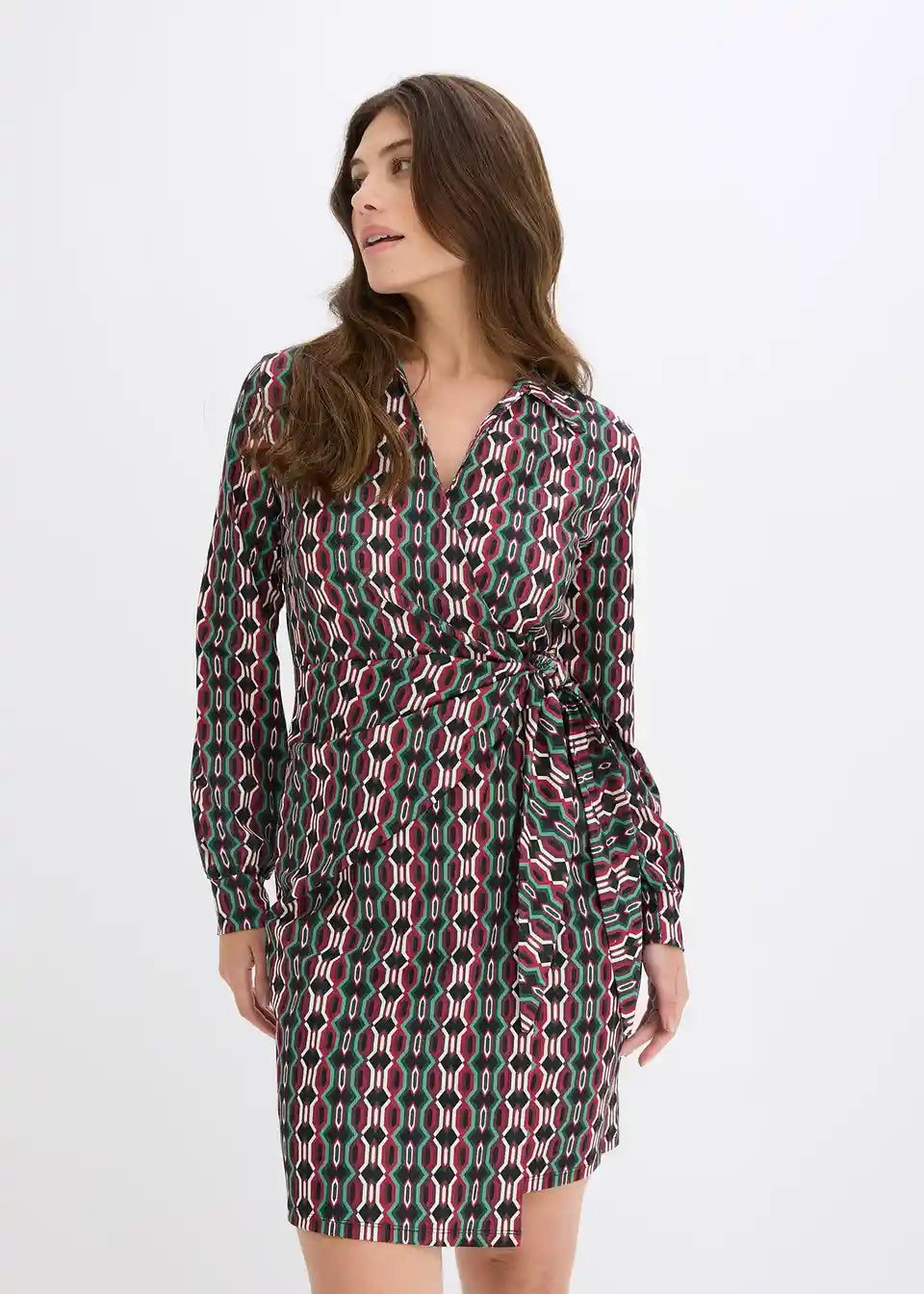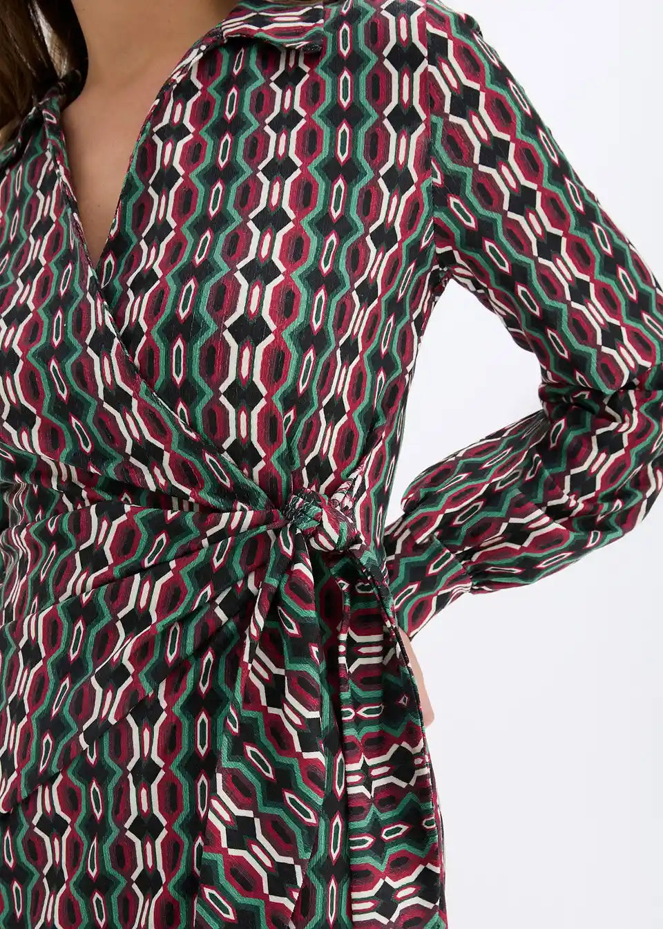 Modna ovita obleka iz strukturiranega jerseyja z globokim V-izrezom spredaj