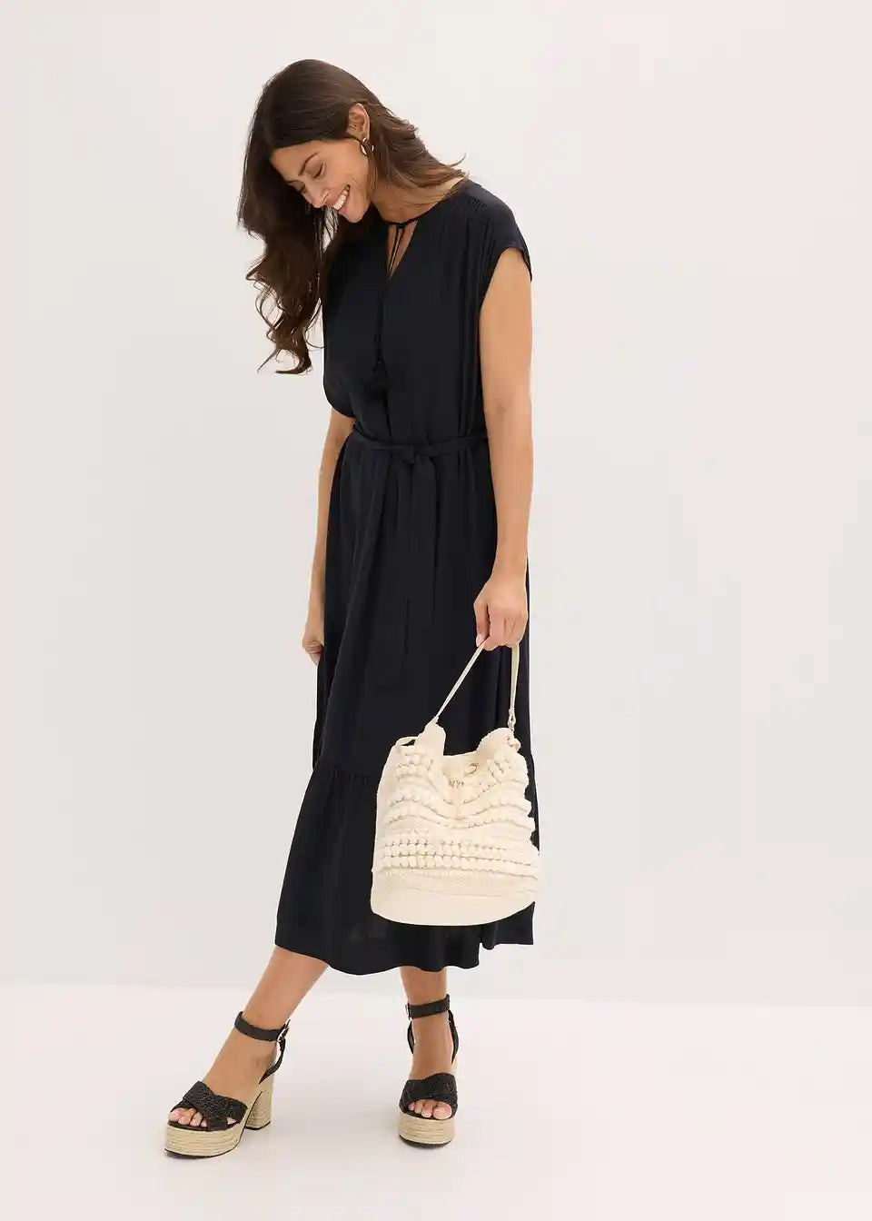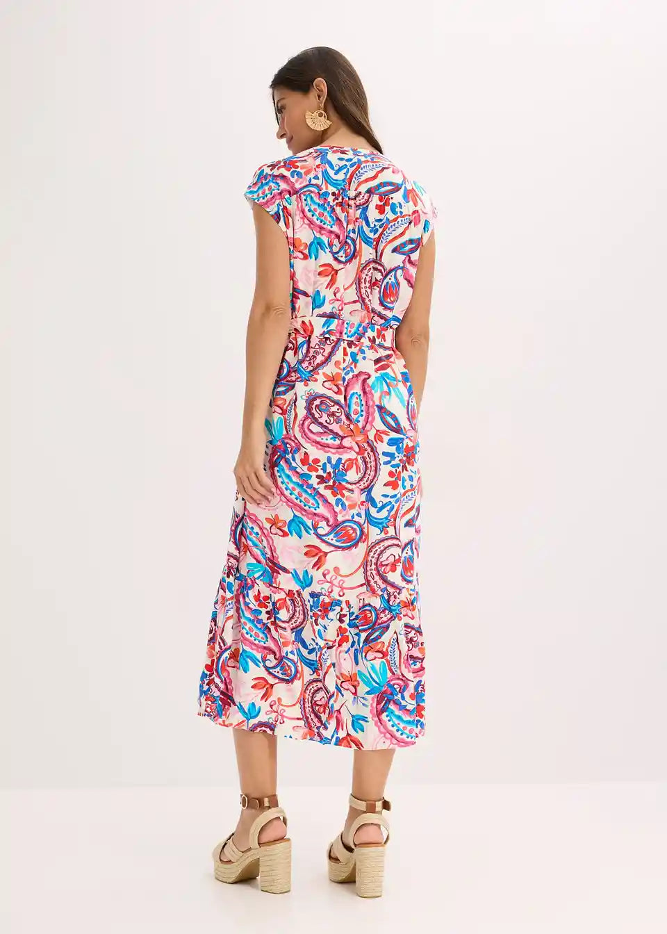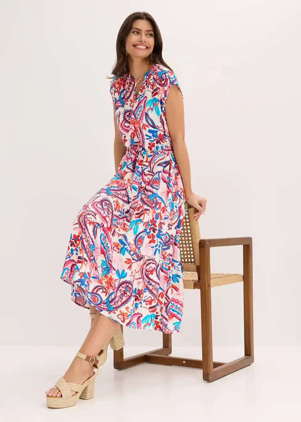 Ležerna, široko padajoča poletna obleka z zavezovalnim pasom