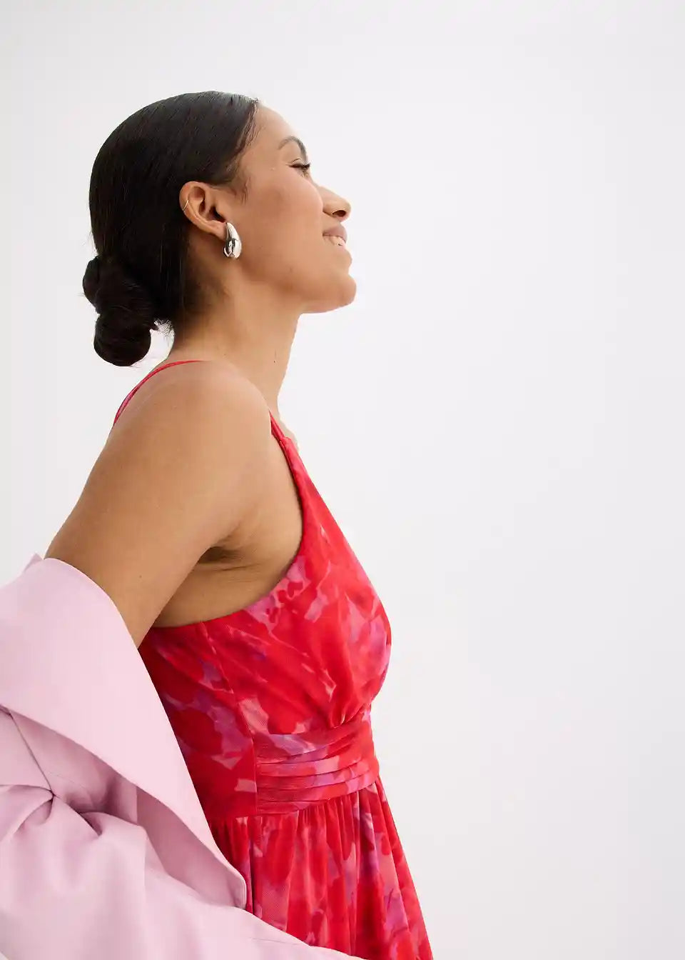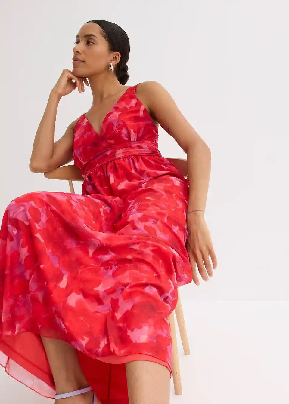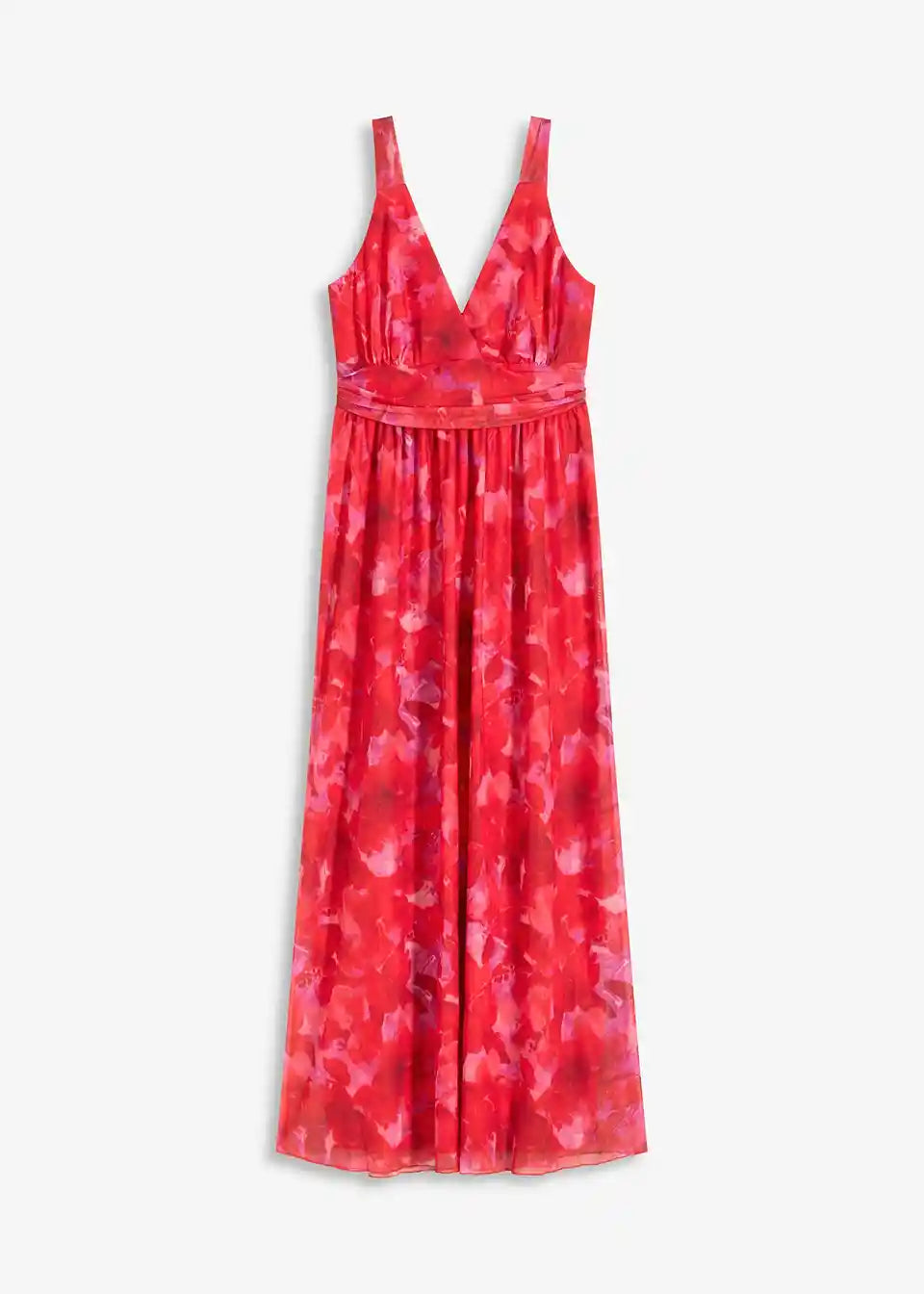 cvetlično potiskana dolga Jersey obleka iz mehkega mrežastega materiala z globokim V-izrezom spredaj in drapiranjem v pasu