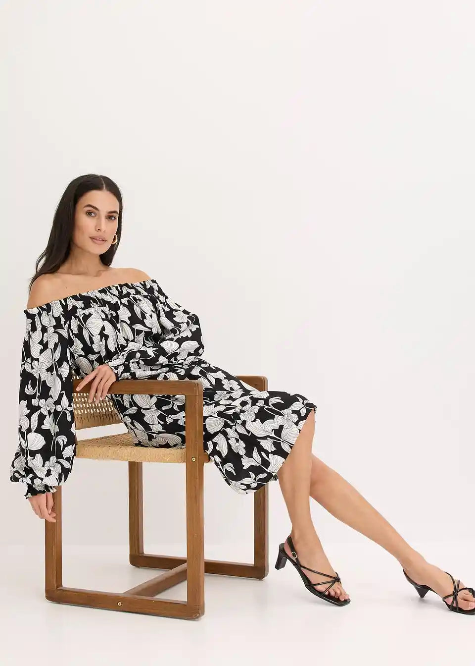 Potiskana obleka s carmen izrezom