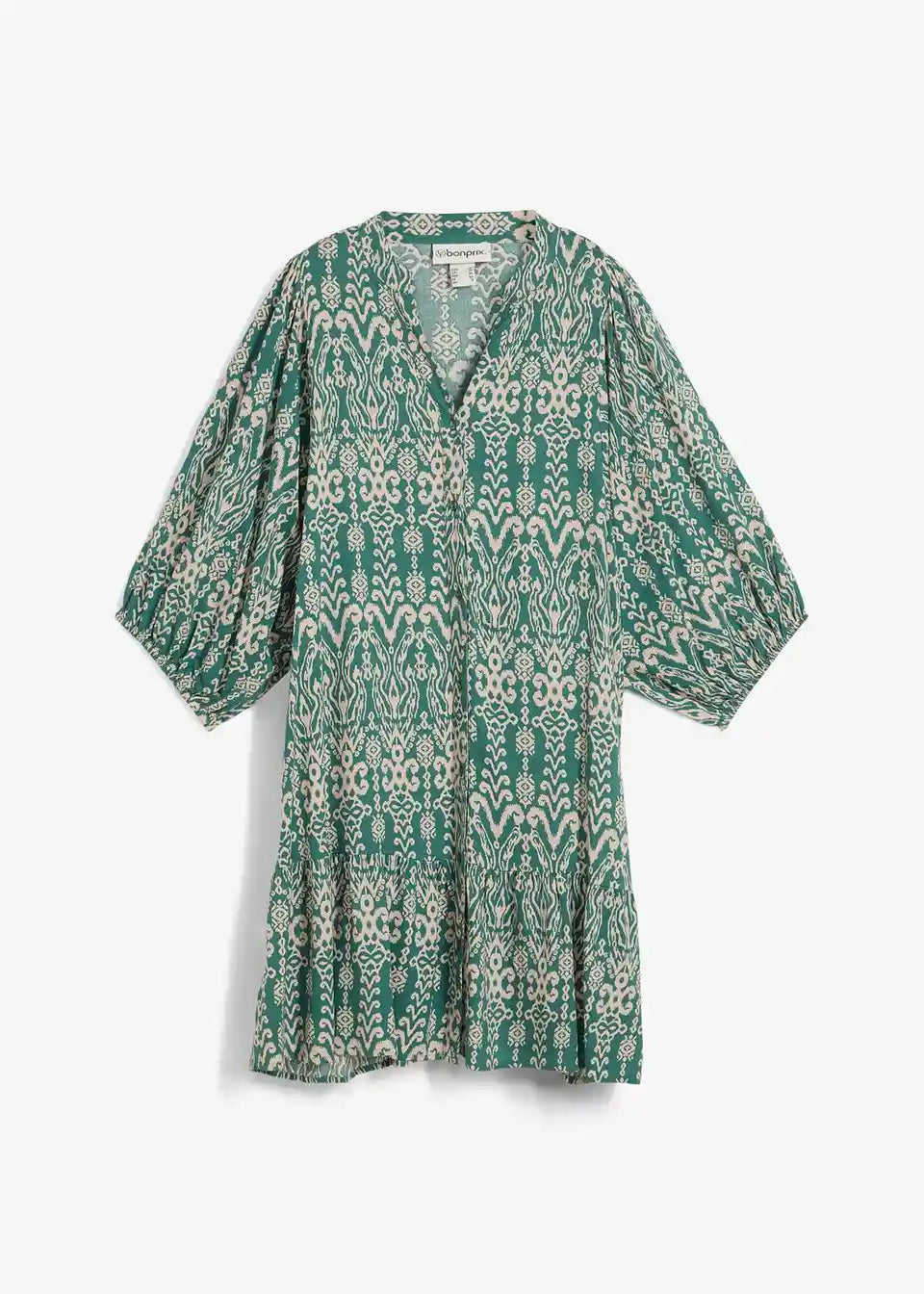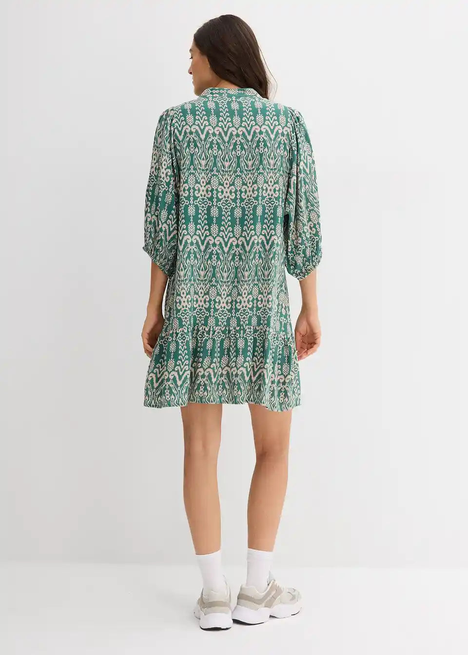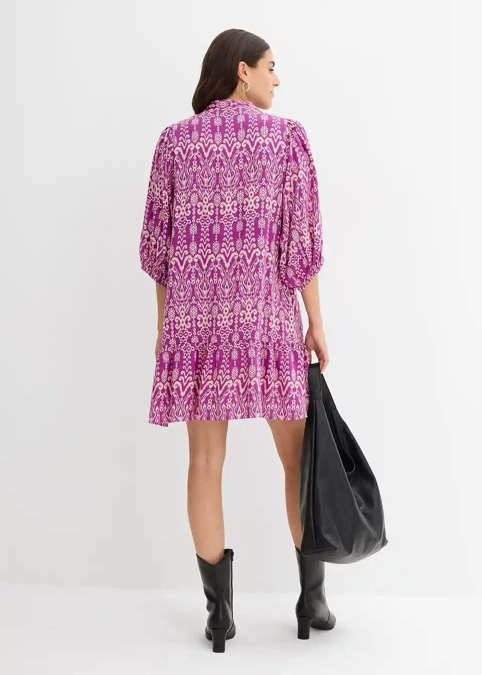 Razširjena kratka obleka s hanley okroglim ovratnim izrezom z gumbki in balonastimi rokavi