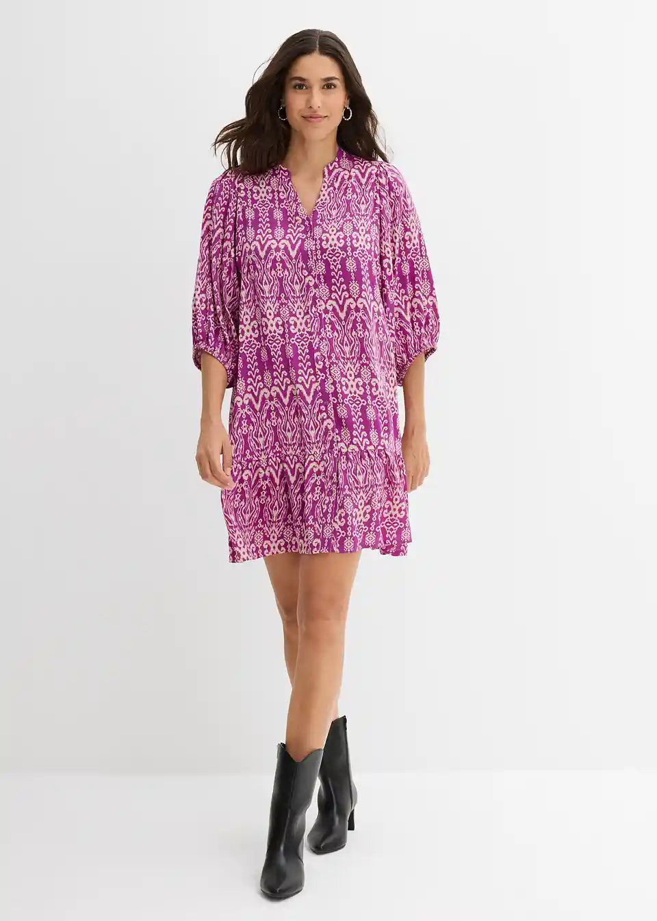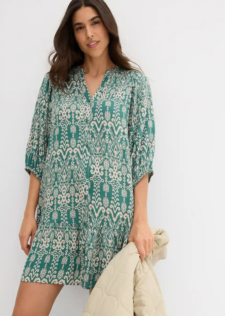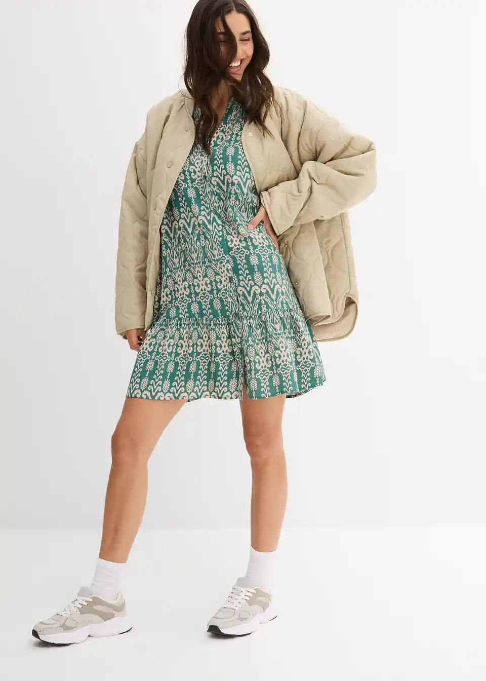 Razširjena kratka obleka s hanley okroglim ovratnim izrezom z gumbki in balonastimi rokavi