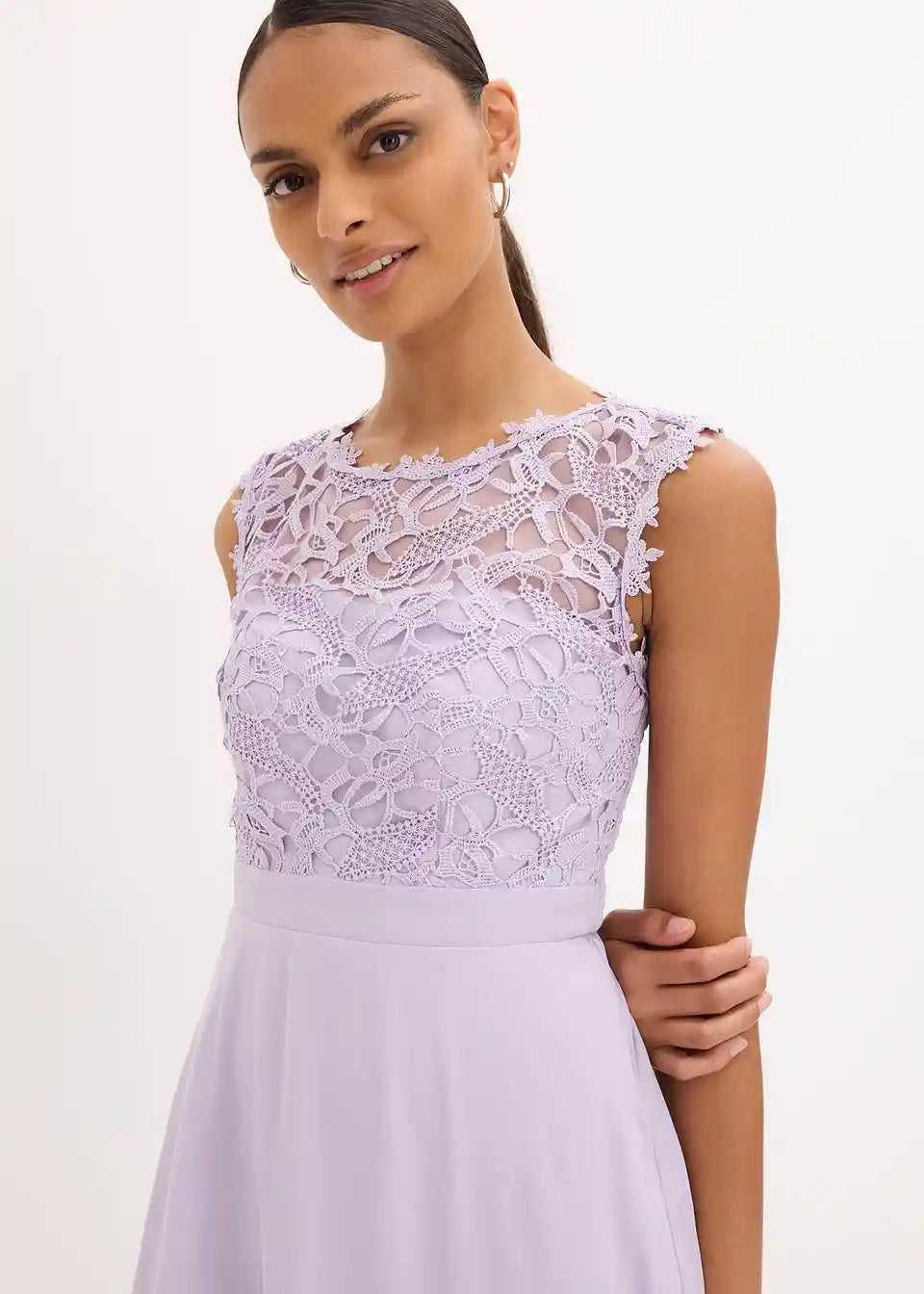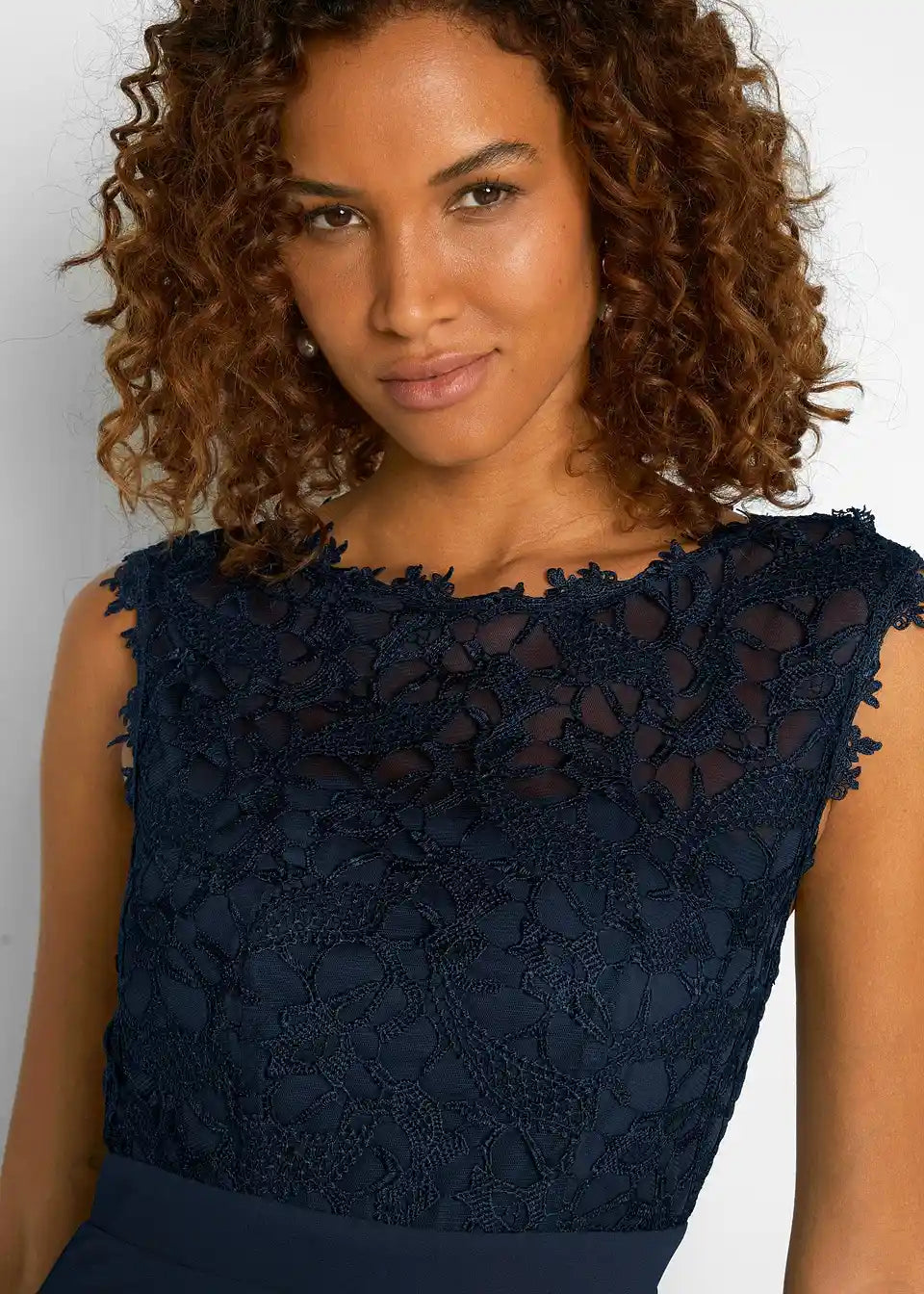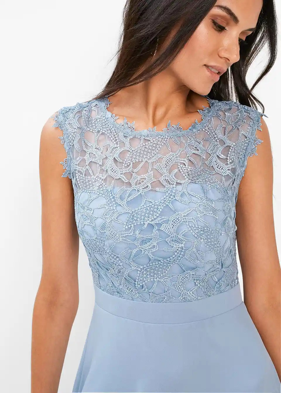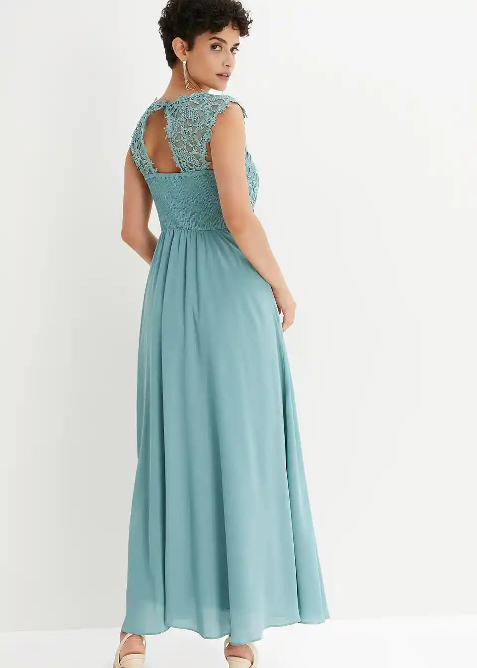 Elegantna večerna obleka s čudovito čipko na zgornjem delu, zadaj z elegantnim odprtjem in elastiko