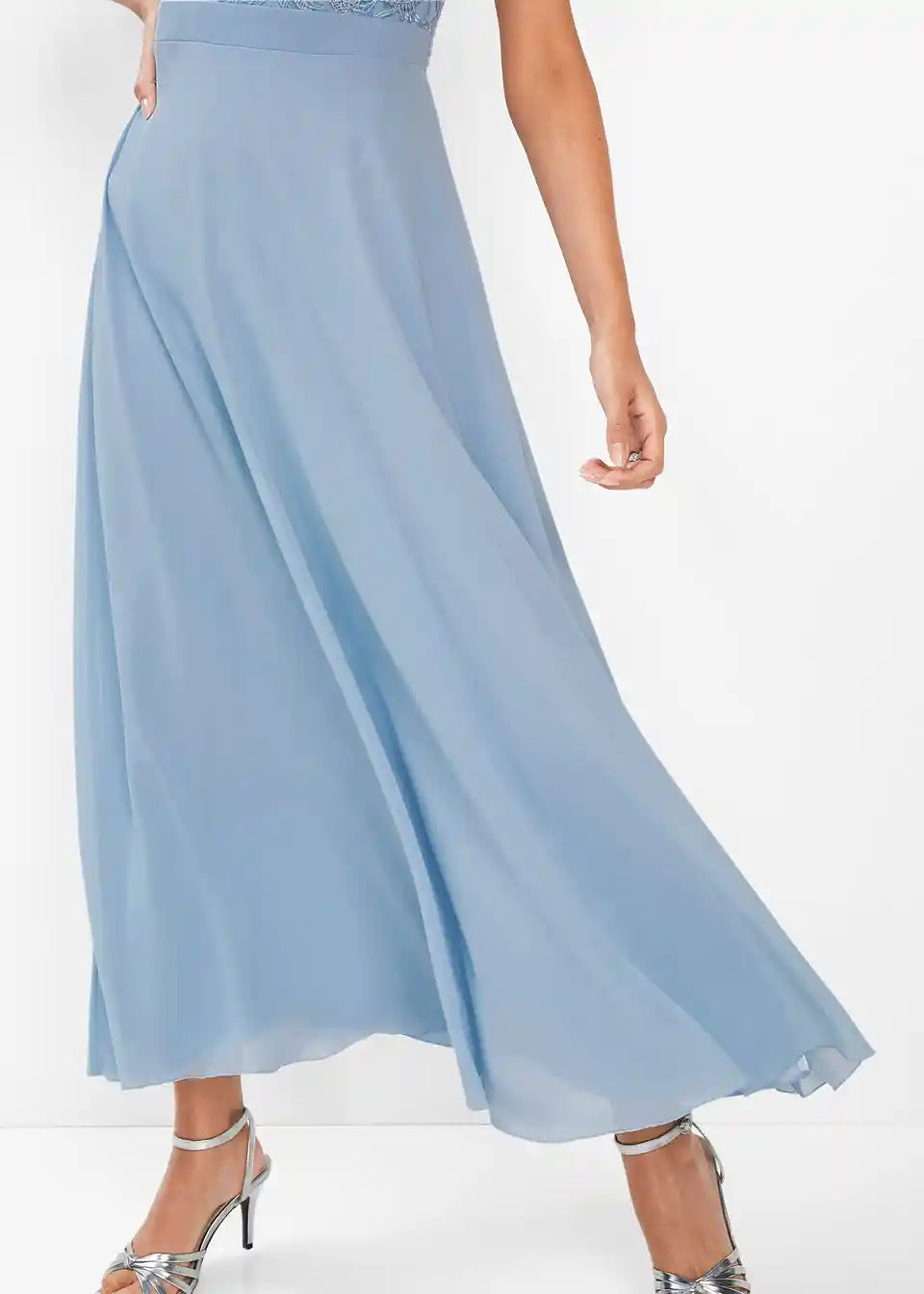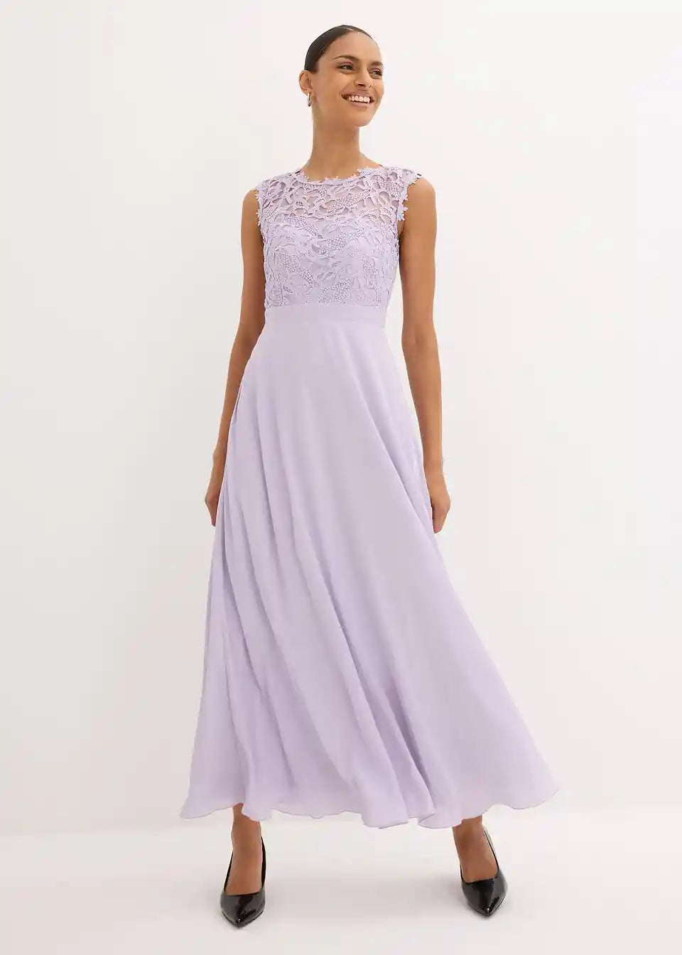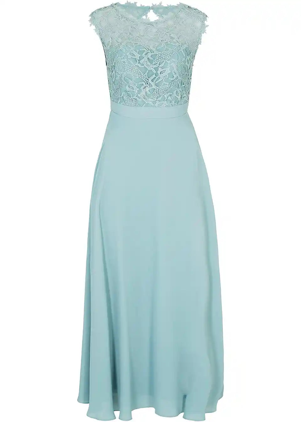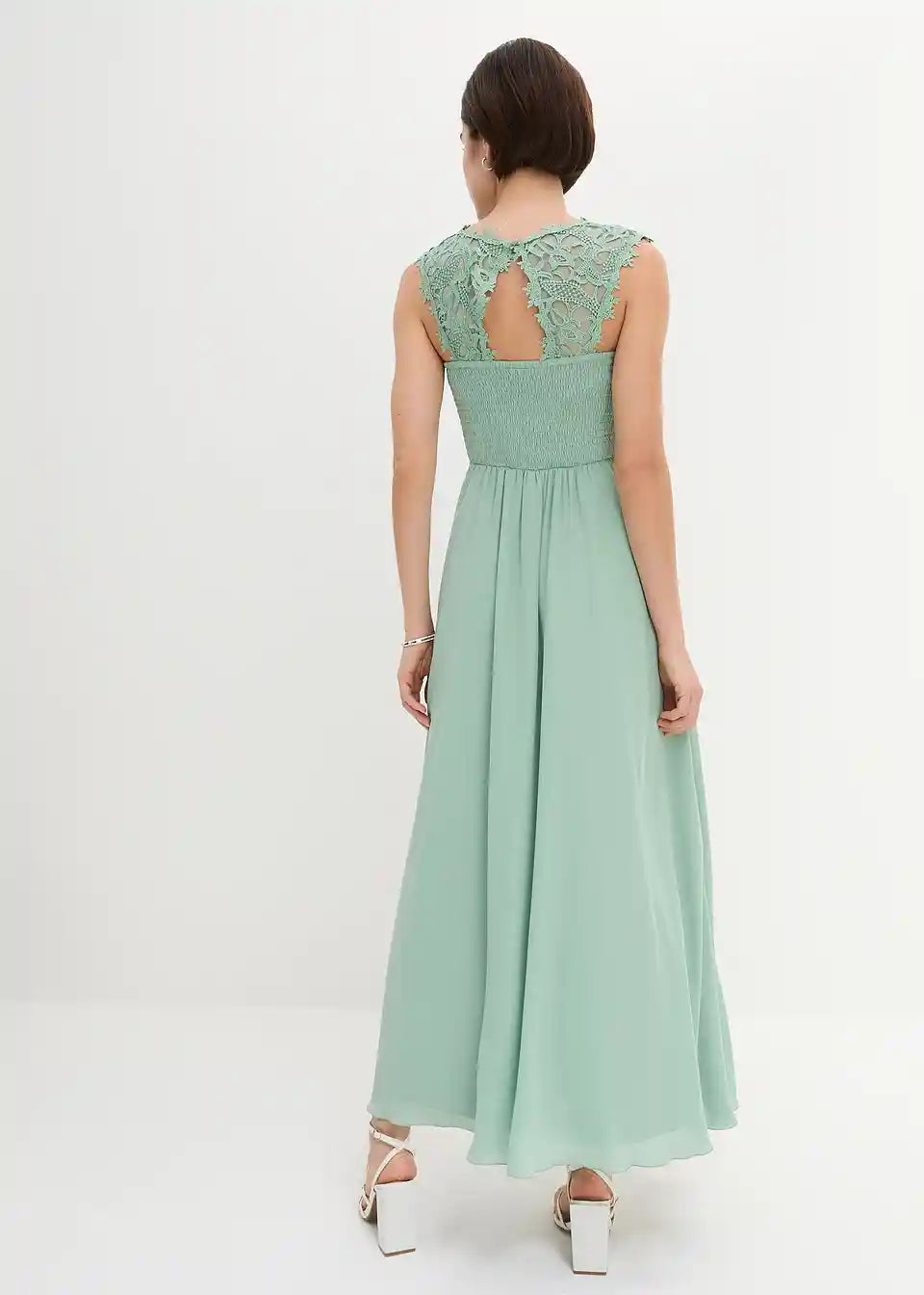 Elegantna večerna obleka s čudovito čipko na zgornjem delu, zadaj z elegantnim odprtjem in elastiko