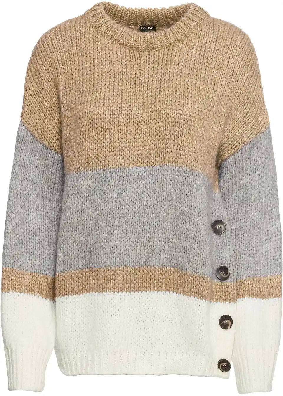 Črtast oversize pulover z gumbi blagovne znamke Bodyflirt. Pulover ima okrogel izrez in patentni rob na izrezu, zaključku rokavov in spodnjem robu. Vizualna dolžina pri št. 36/38 približno 68 cm.