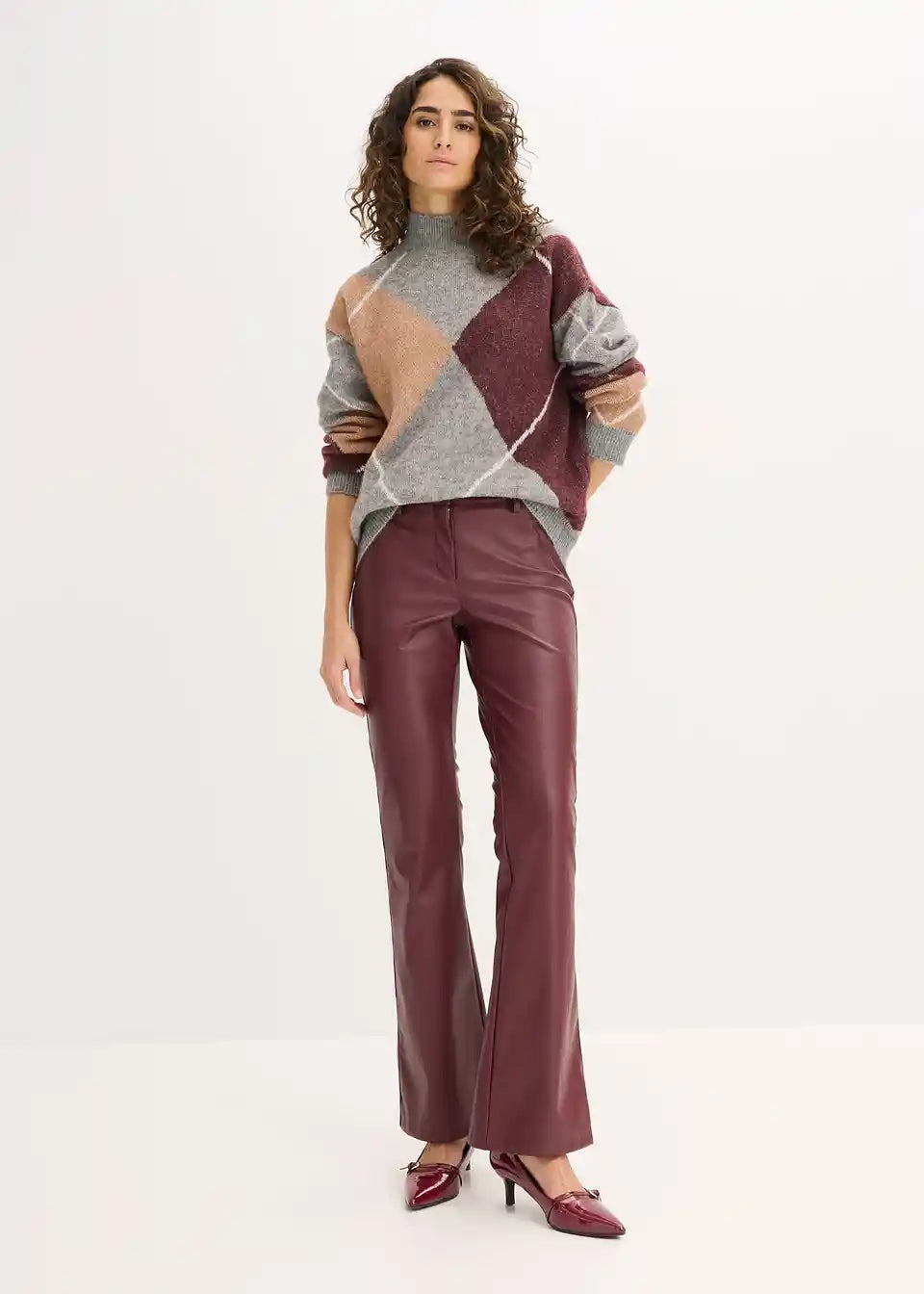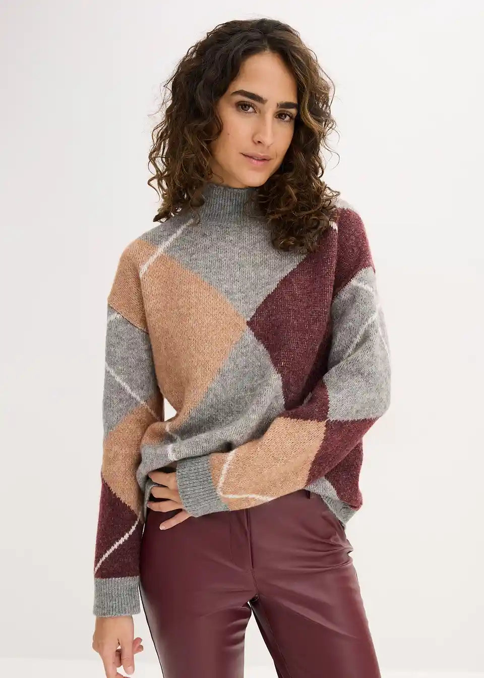 Mehek ohlapen pulover s puli ovratnikom in modnim rombastim vzorcem