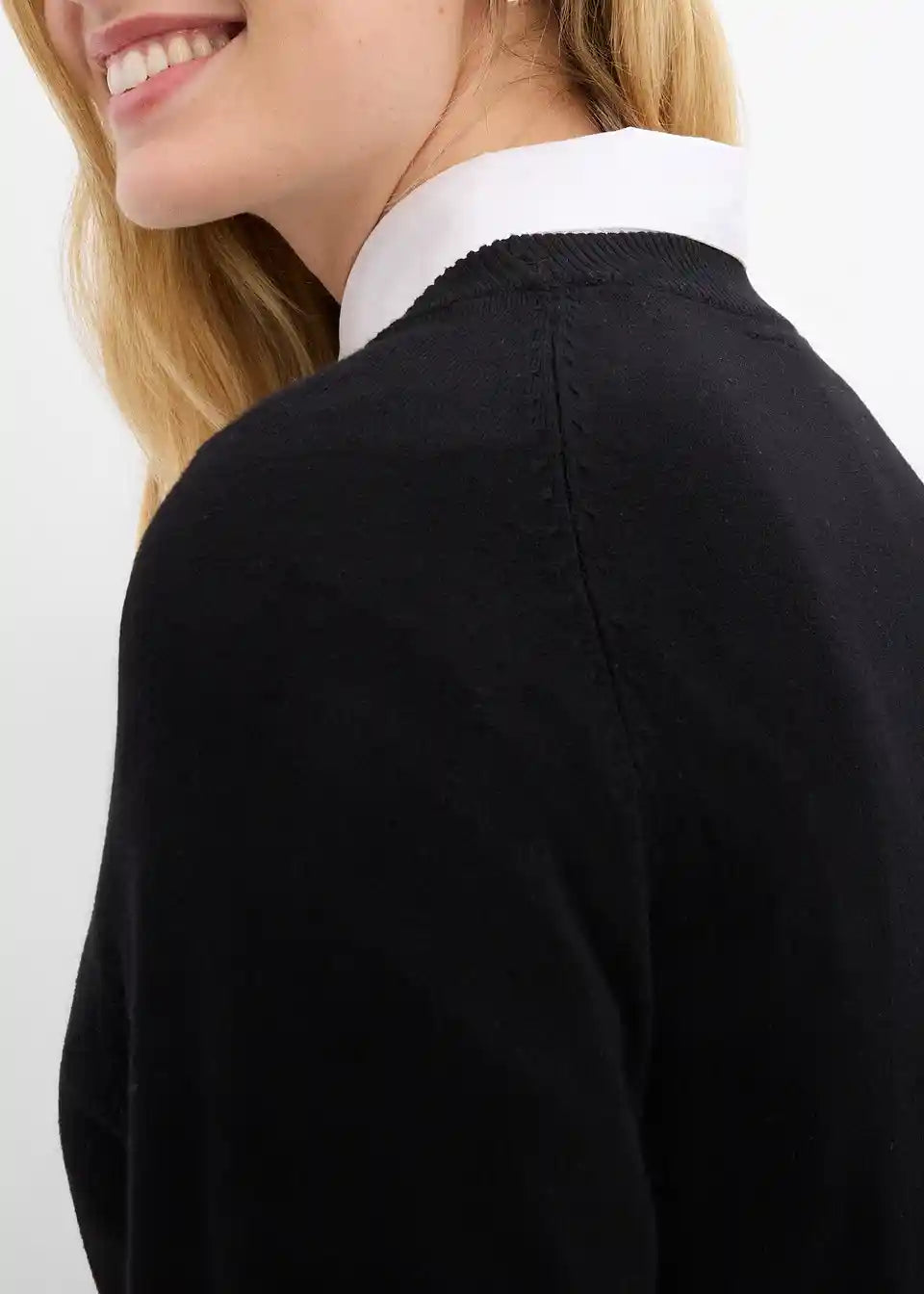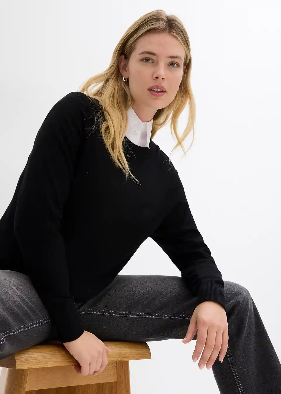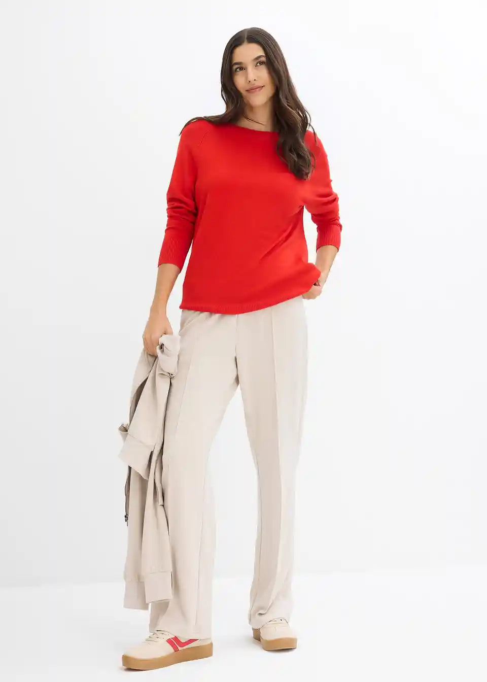 Udoben pleten pulover z okroglim izrezom. Dolžina v velikosti 40/42 približno 66 cm, primeren za strojno pranje.