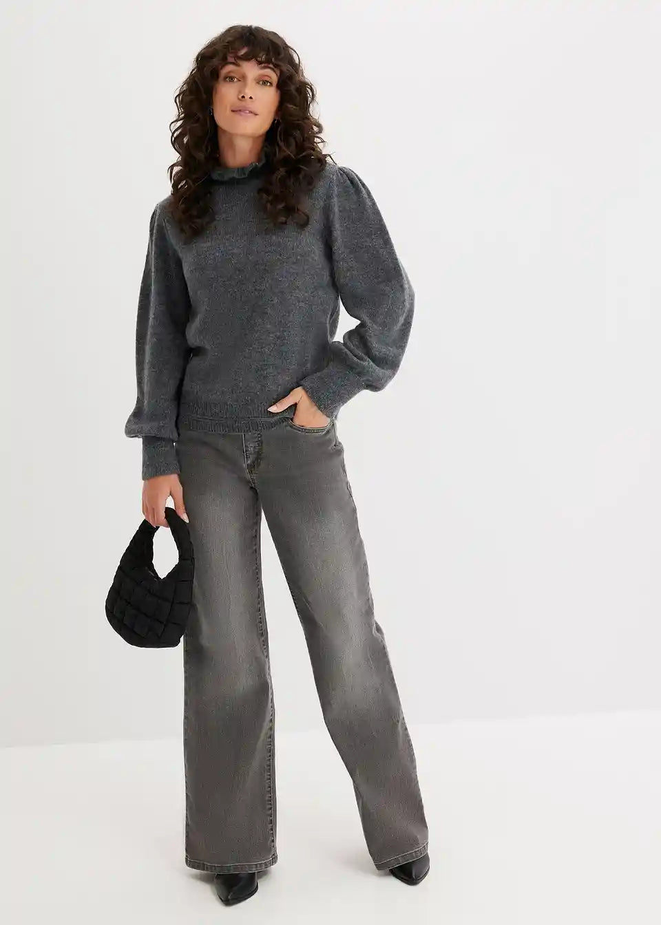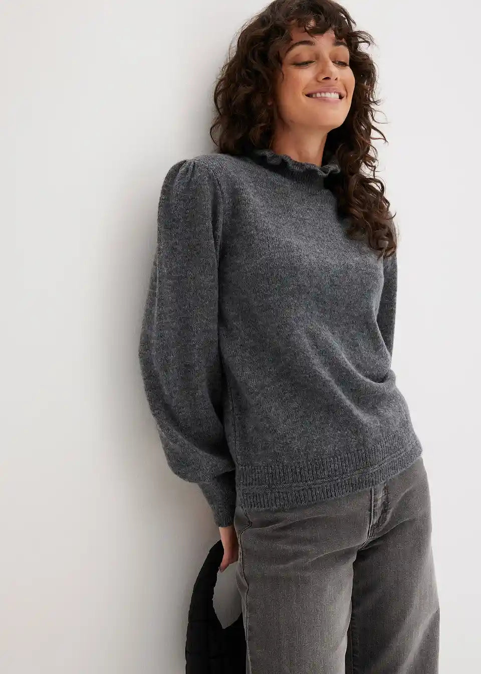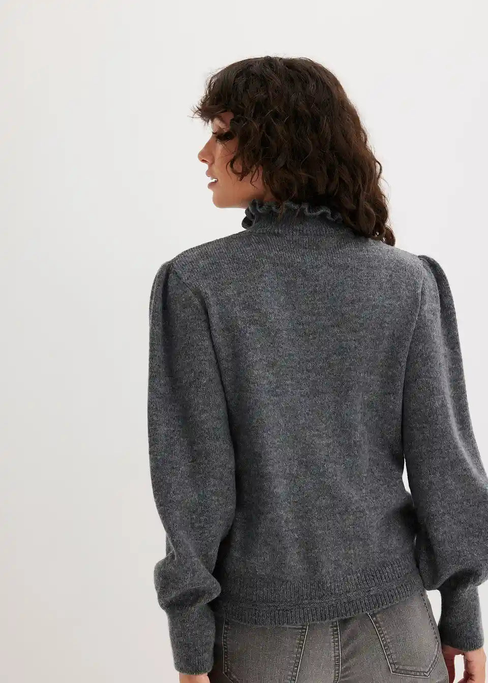 feminilen pulover z valovitim robom na ovratniku in manšetah