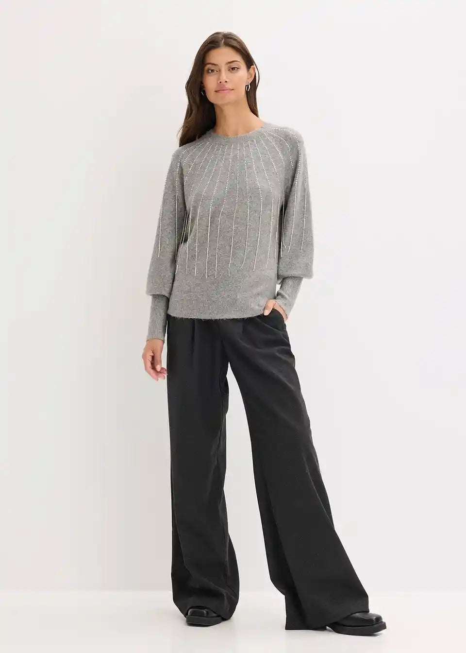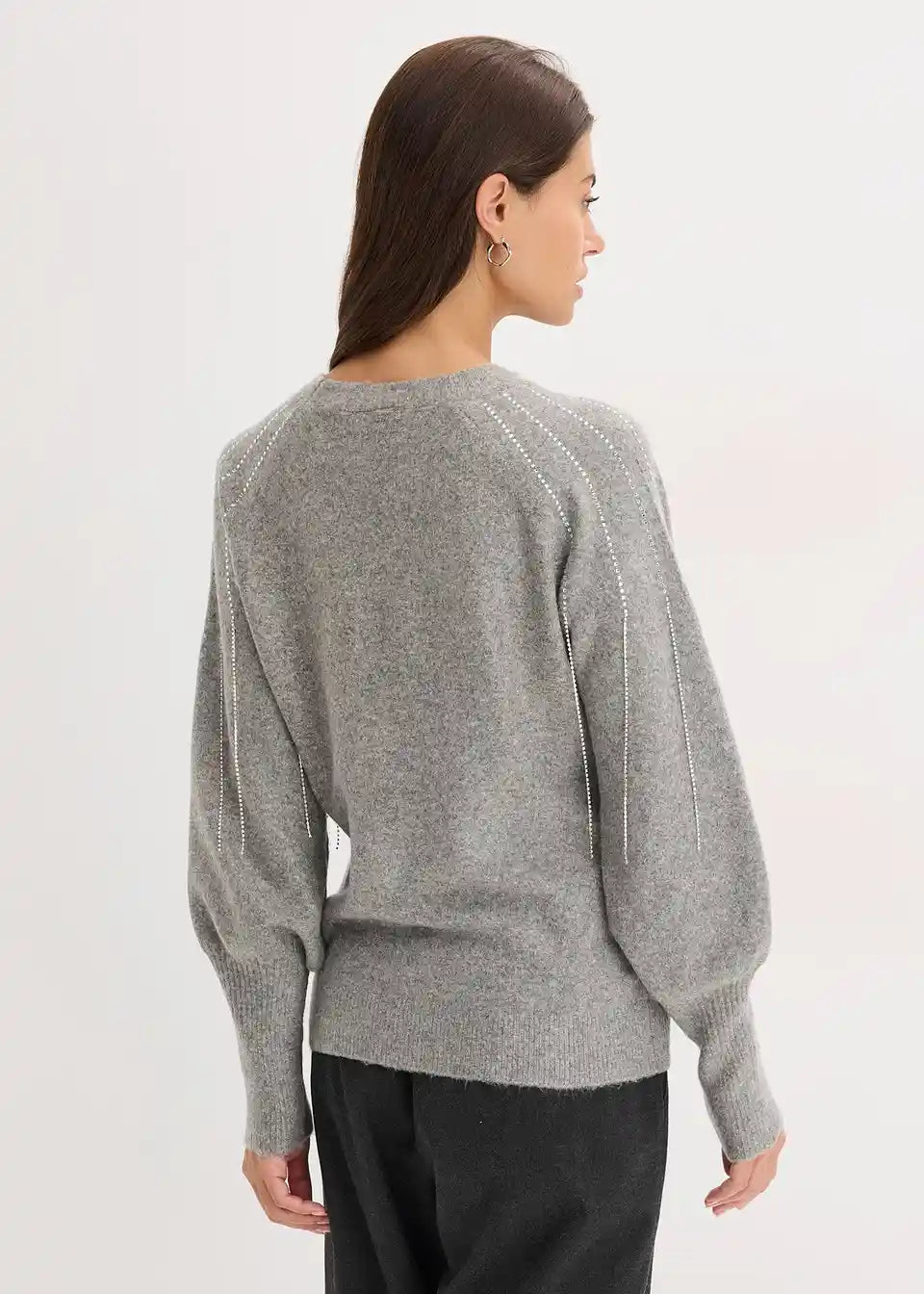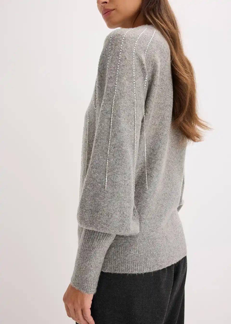 Ženstven pleten pulover z balonastimi rokavi in modno bleščečo aplikacijo z resami spredaj