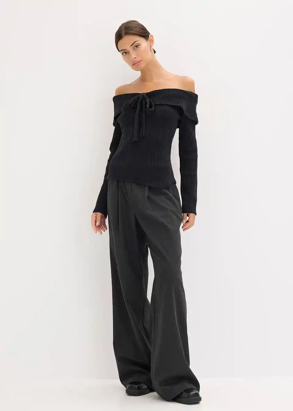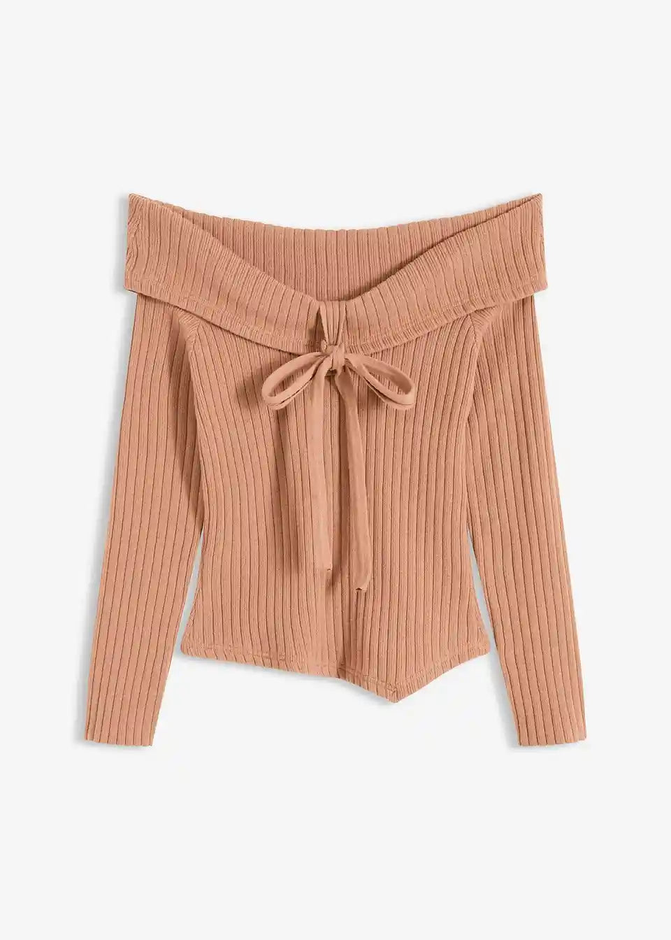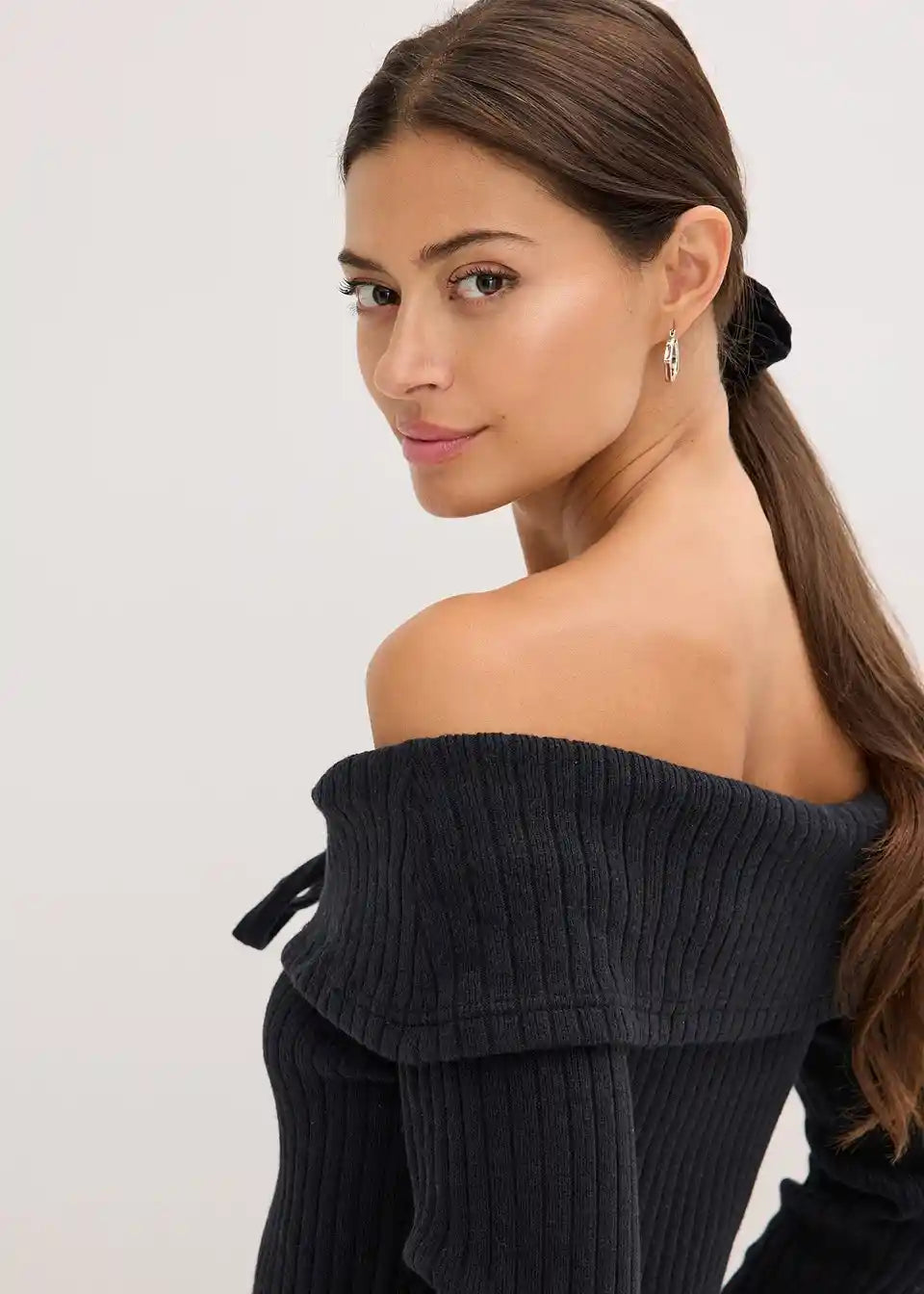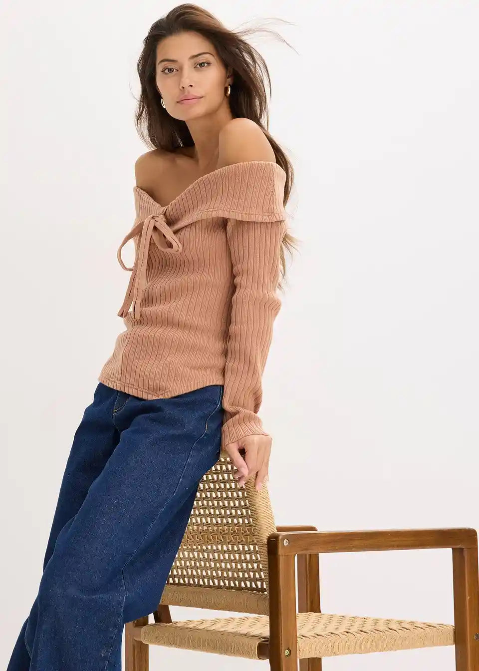 Moden pulover s carmen izrezom z rebrastim vzorcem