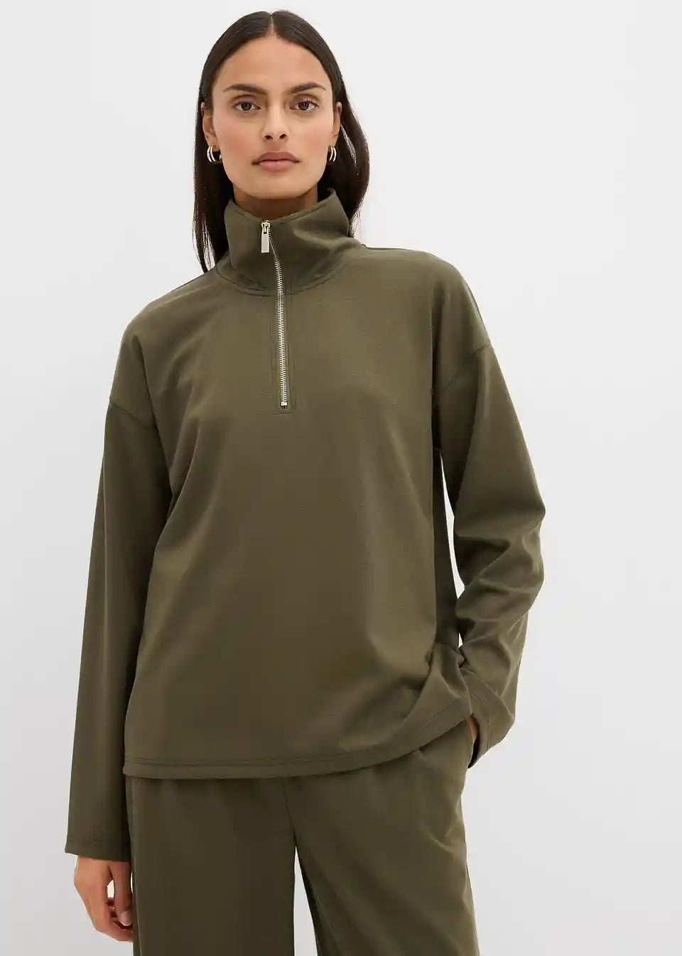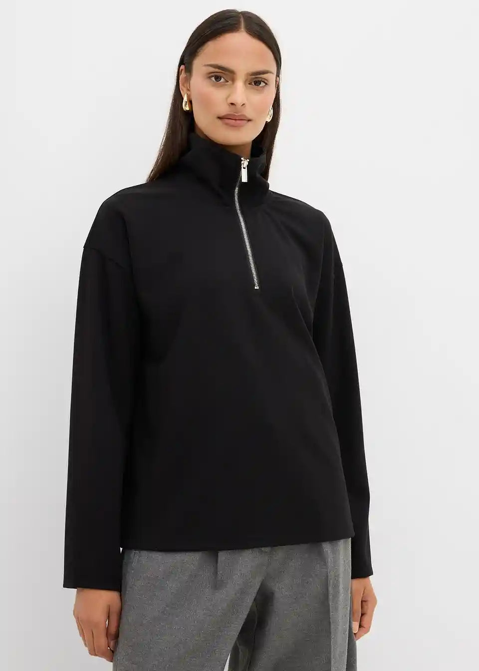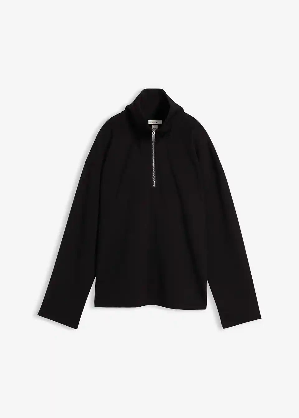 Pulover s trojanskim ovratnikom v ohlapnem kroju z zadrgo in v rokave podaljšanimi ramami