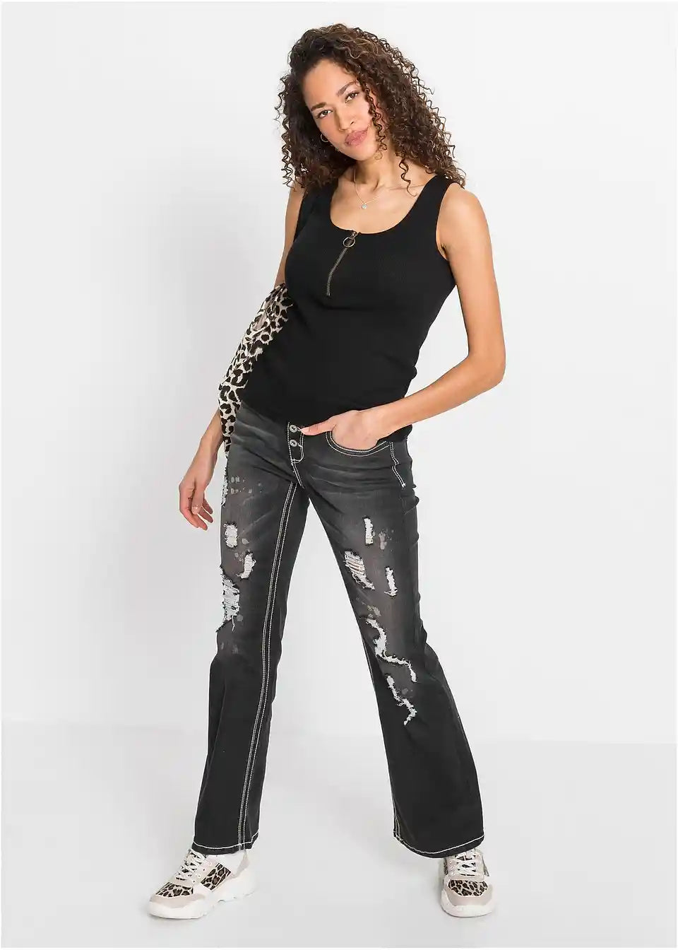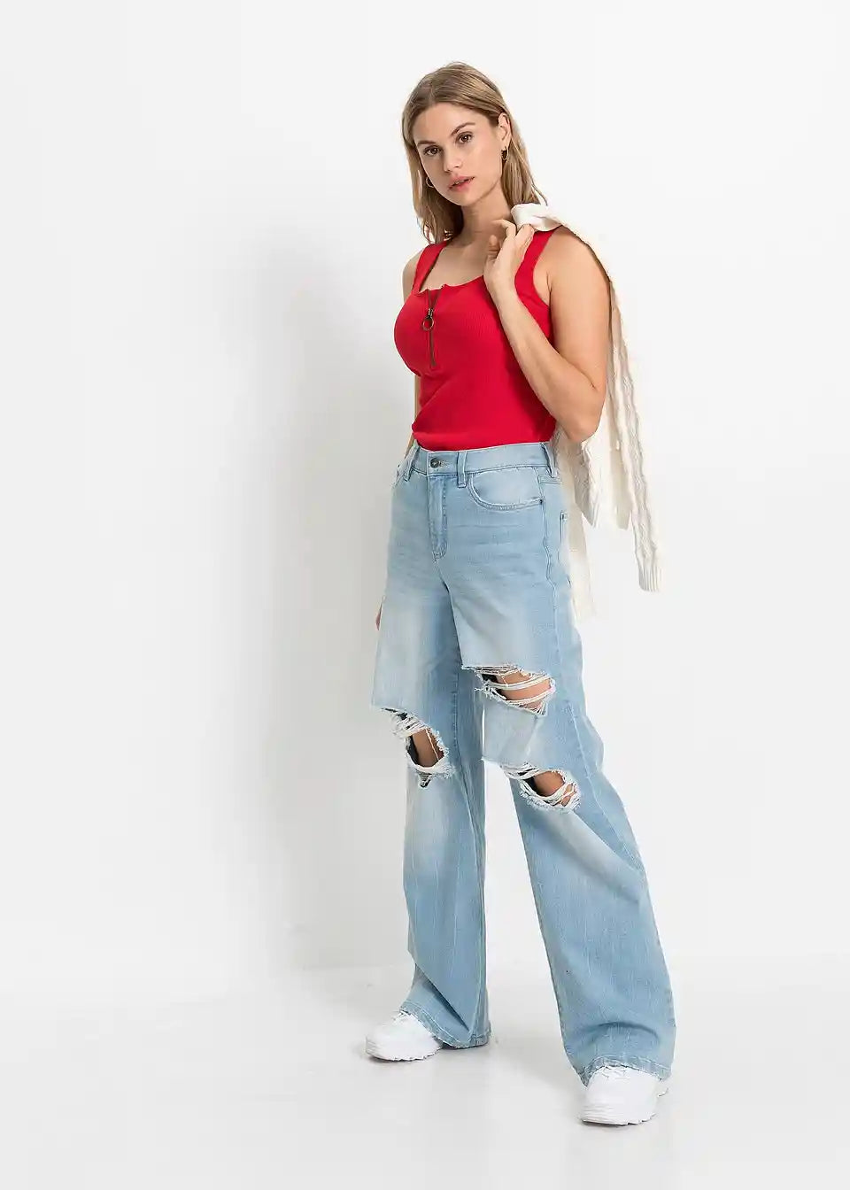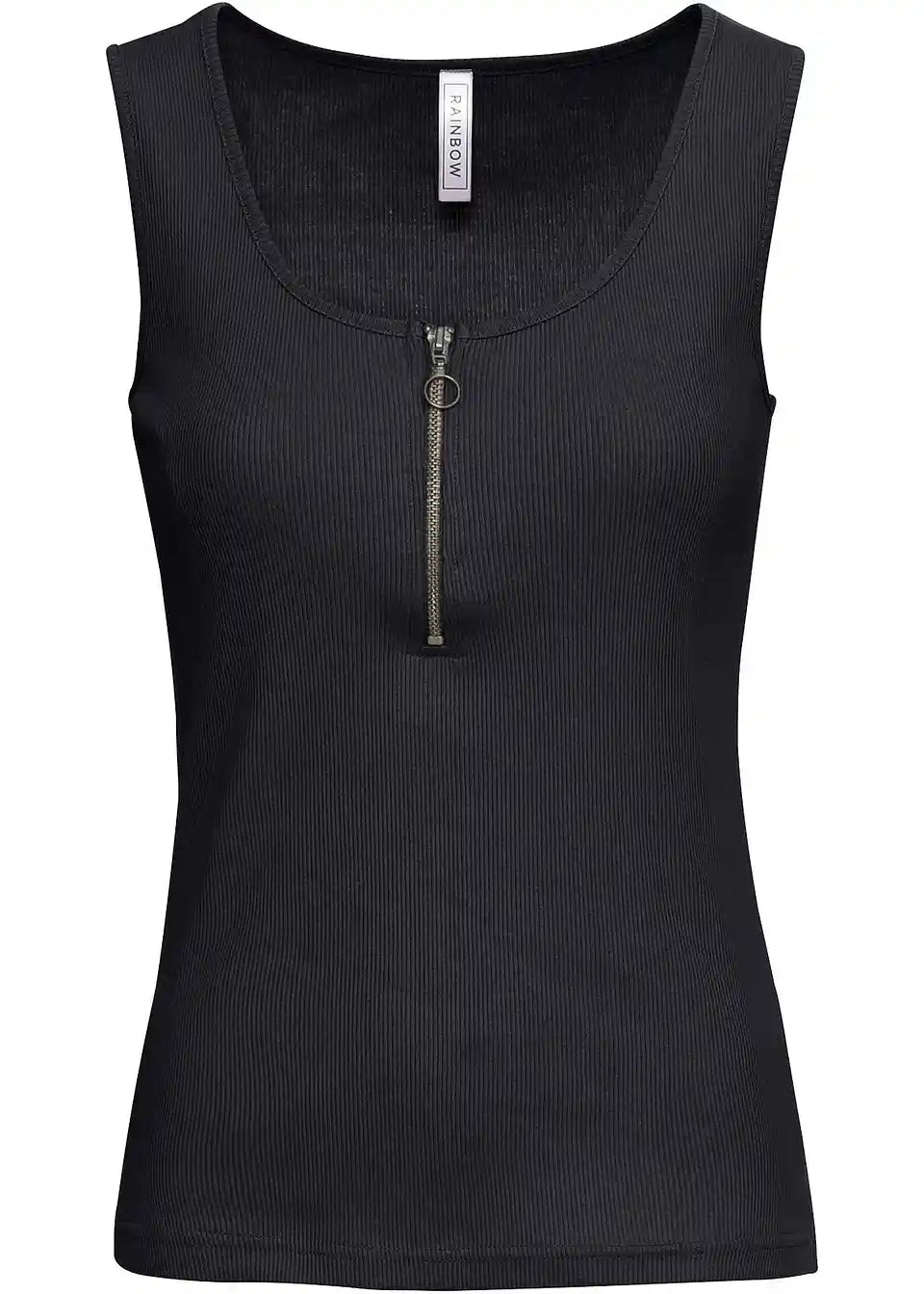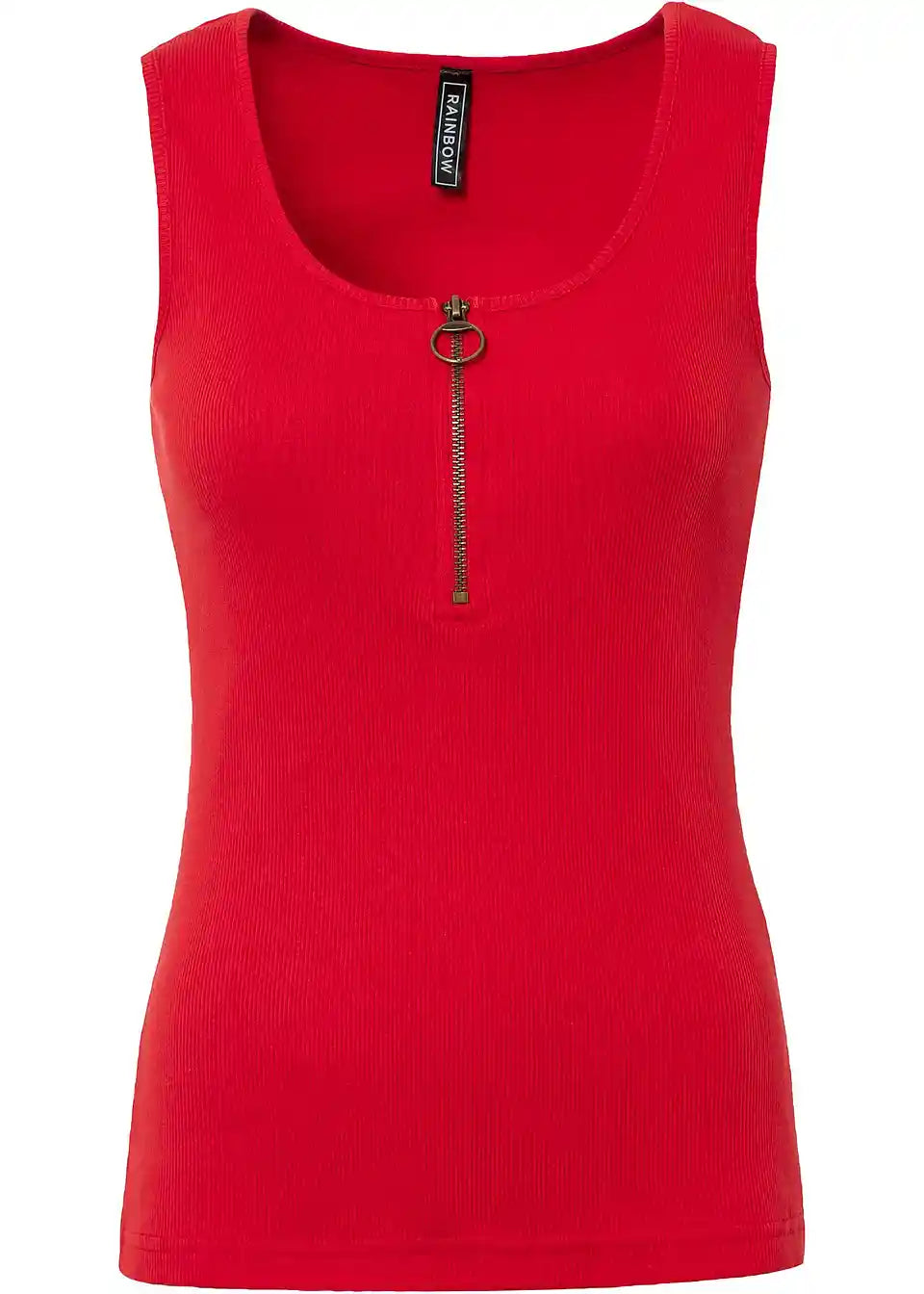 Ta športni, sproščen top iz čiste bombažne tkanine prepriča s trendovsko rebrasto strukturo in zelo globokim okroglim izrezom. S pomočjo dovršene zadrge dobi dodaten modni pridih in jo je mogoče še dodatno odpreti. V kombinaciji s kratkimi hlačami ali krili je ta ležerni rebrasti top z zadrgo videti odlično.