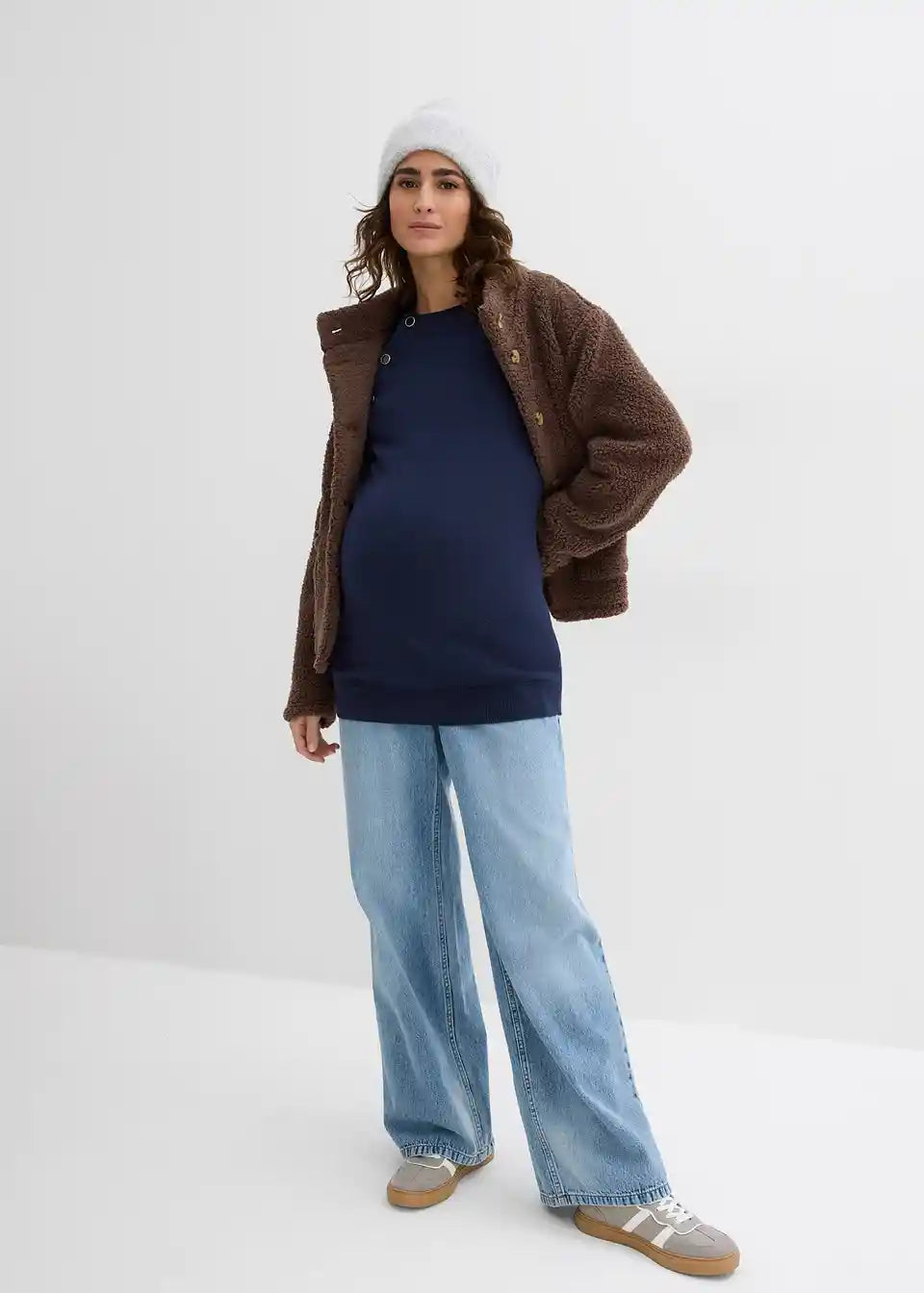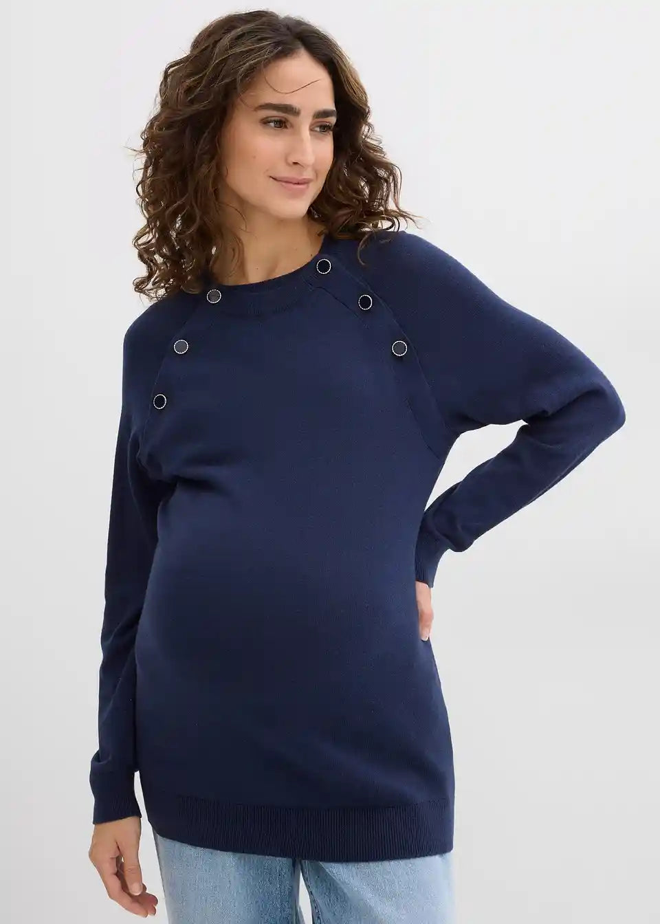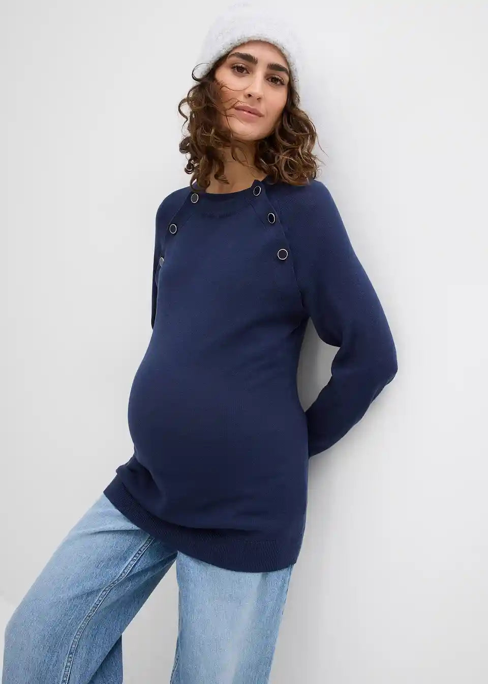 Mehek, do bokov segajoč pleten pulover s praktično možnostjo dojenja: dekorativni okrasni gumbi se enostavno odprejo in razkrivajo dodaten vstavek, ki omogoča diskretno dojenje. Z mehkimi rebrastimi patentnimi zaključki na rokavih in robu.