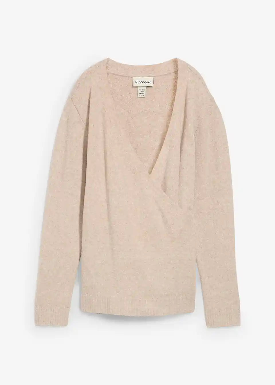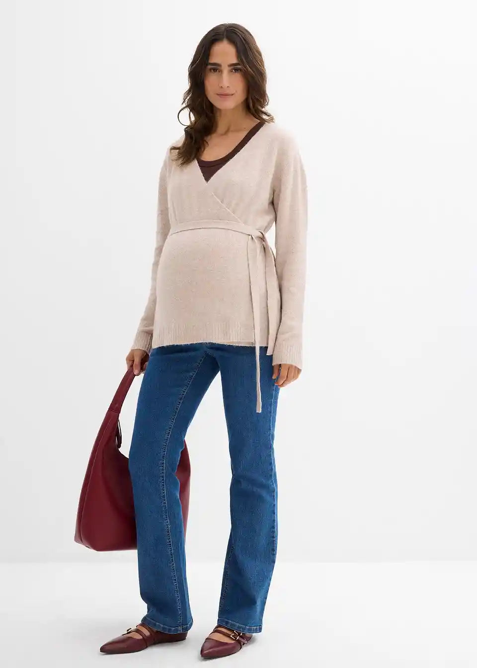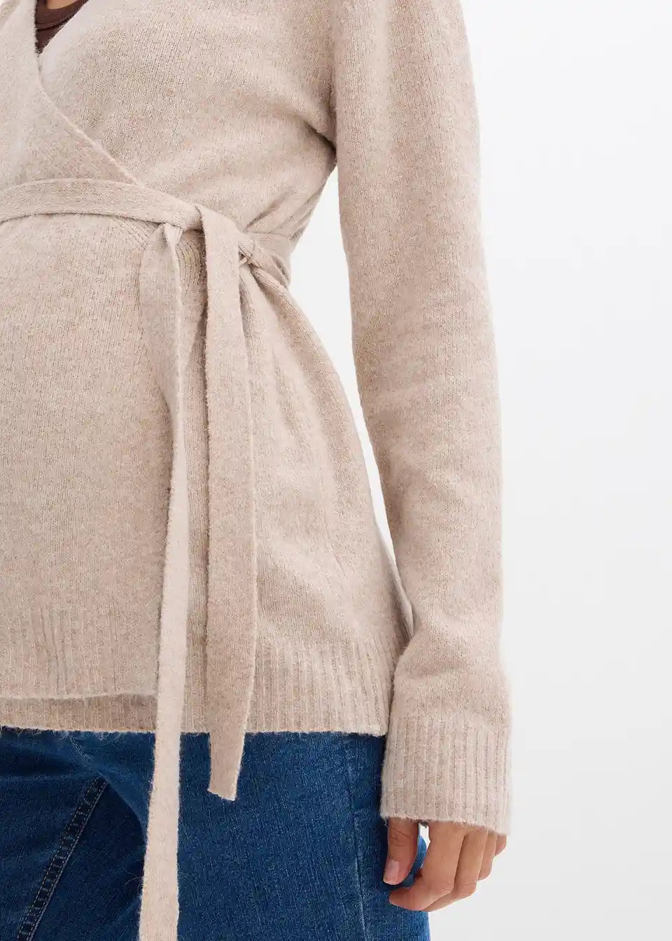 Čez boke dolga ovita pletena jopa iz puhastih materiala z V-izrezom. Vezalke omogočajo individualno prilagajanje širine, zagotavljajo laskavo silhueto in omogočajo nošenje jopice tudi po nosečnosti. Kroj omogoča enostavno dojenje ter udobno oblačenje in slačenje.
