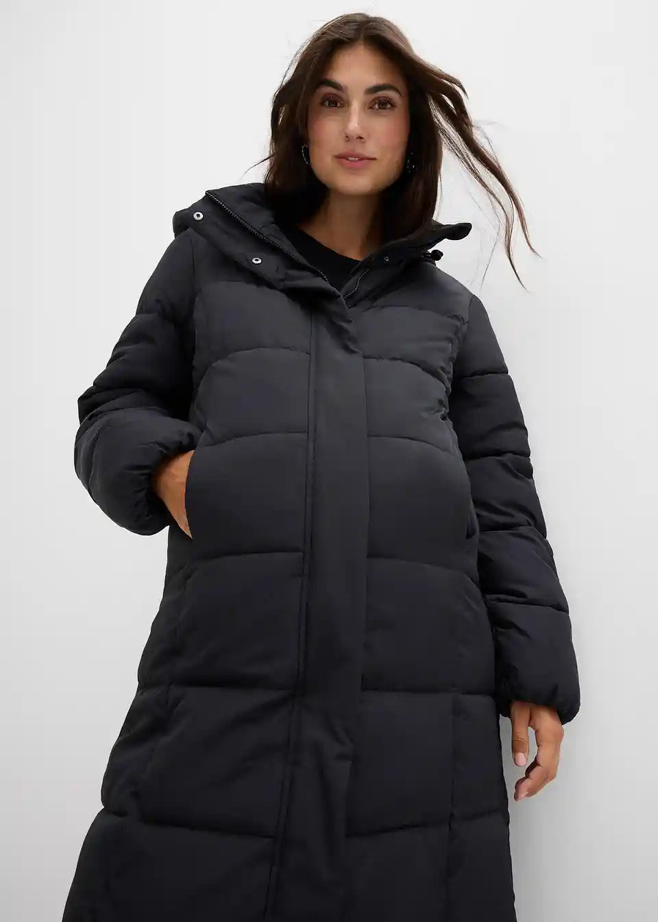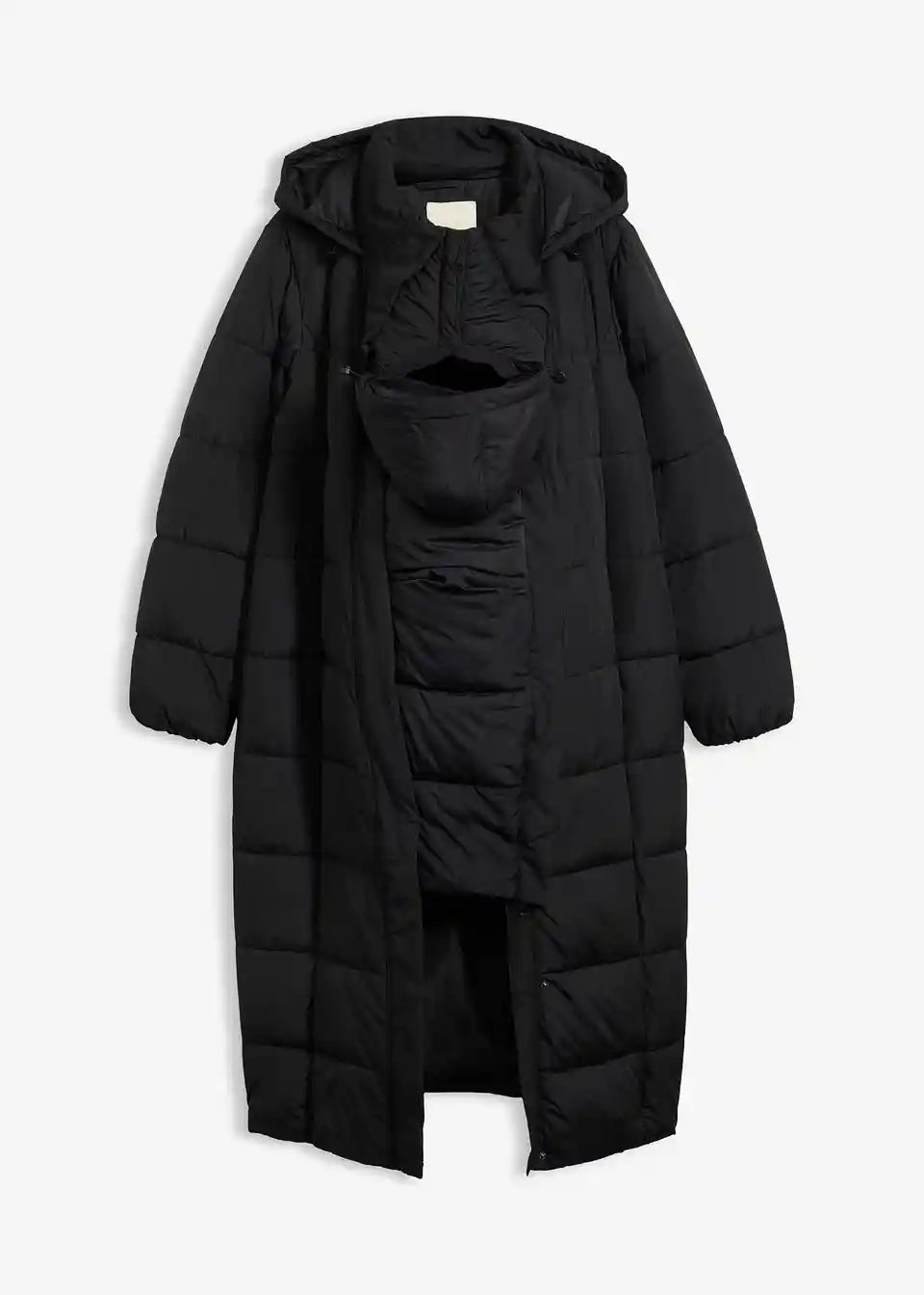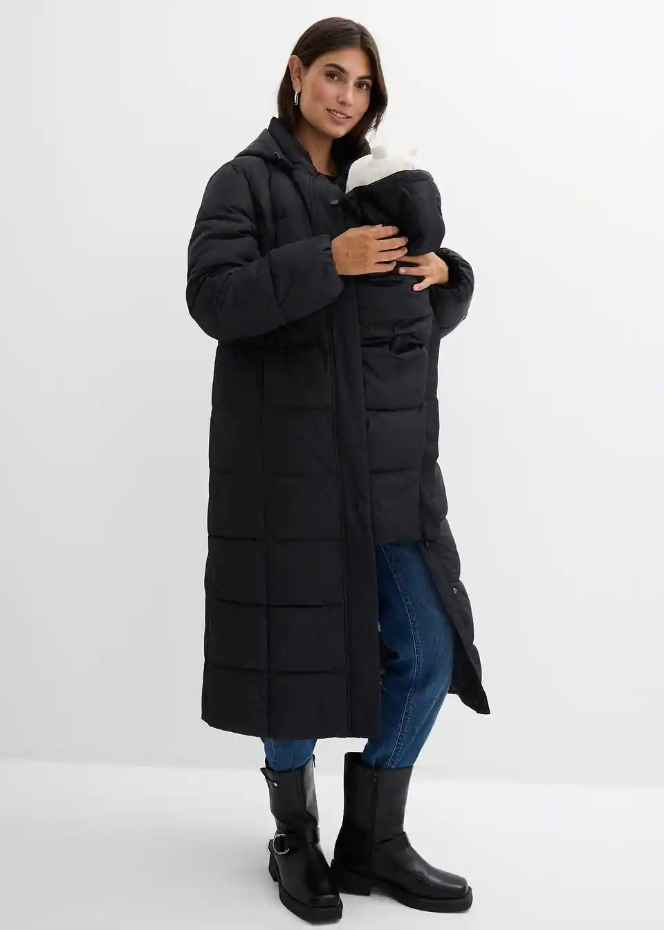 Ta topel, prešiti plašč v udobnem oversize kroju je idealen za nosečnost in obdobje nošenja dojenčka. Žepi za roke ponujajo prostor za pomembne drobnarije v vsakdanjem življenju. Vložek za nošenje je oblikovan tako, da prijetno greje vrat mamice in je opremljen s skritimi pritiskači ter kapuco za dojenčka z nastavljivo vrvico. Ekstra velika kapuca za mamico zanesljivo ščiti pred vetrom in vremenom. Praktična dvosmerna zadrga omogoča več svobode gibanja, elastični patenti na rokavih pa zanesljivo zadržujejo mraz in veter.