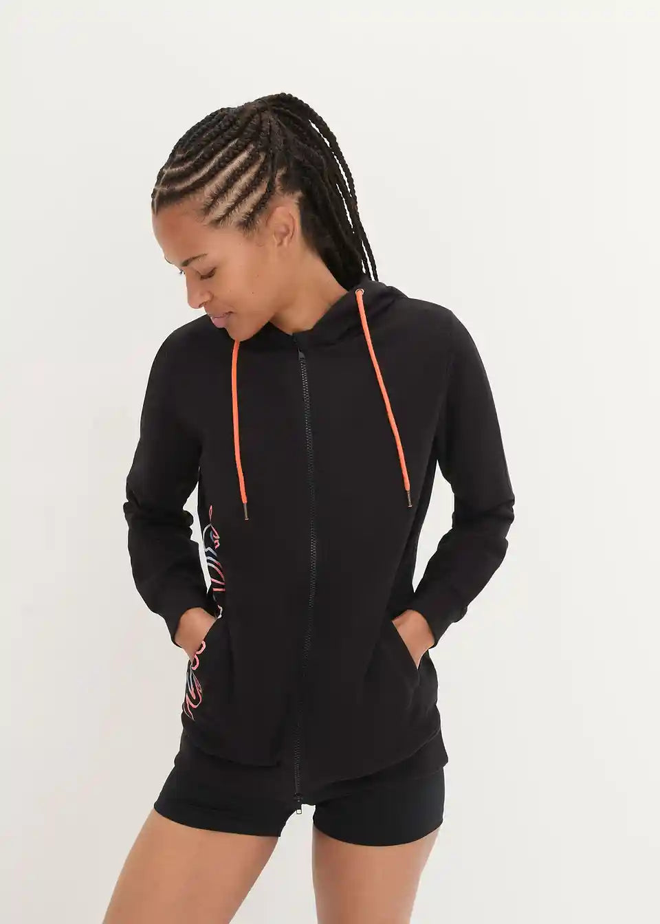 Jopa iz trikoja s kapuco se lahko s skladnimi hlačami nosi tudi kot trenirka. Z všitimi žepi in dvosmerno zadrgo. Dolžina pri velikosti 40/42 ca. 70 cm. Strojno pranje.