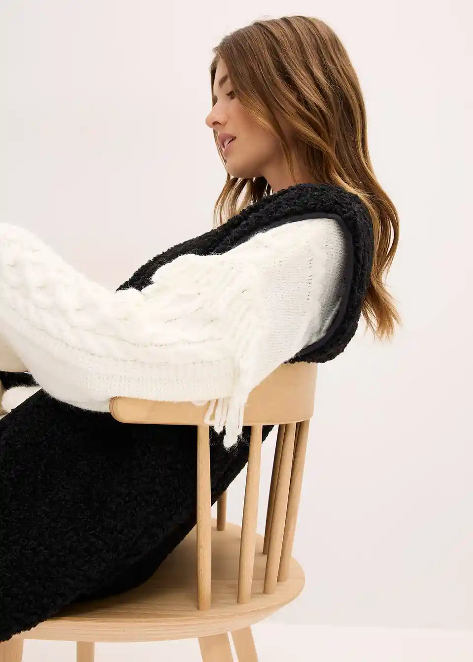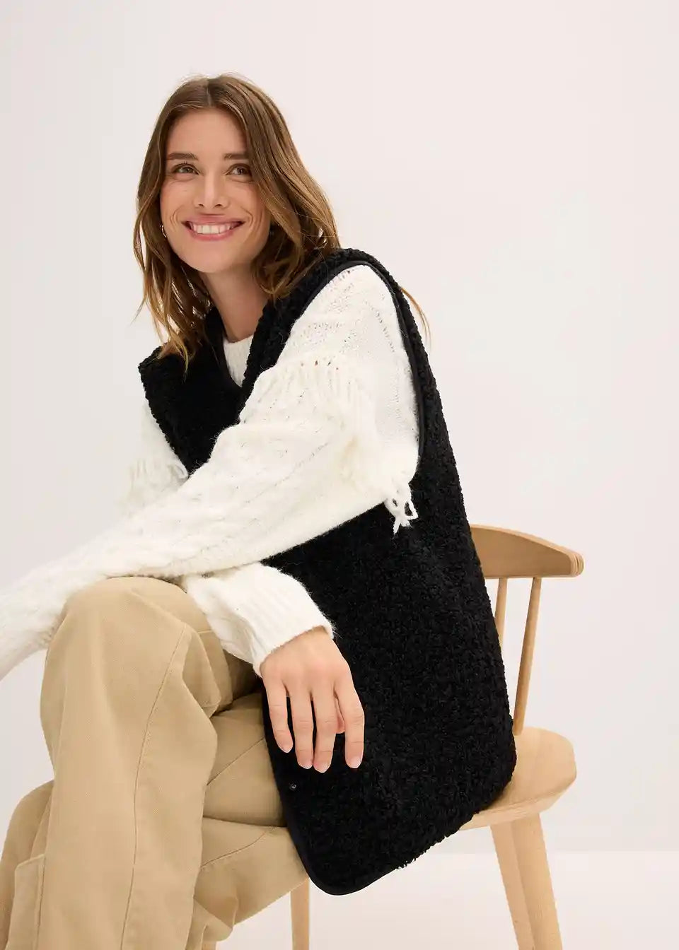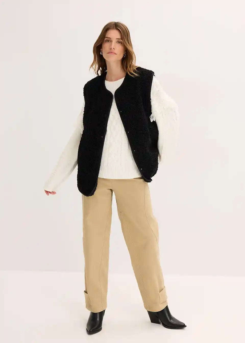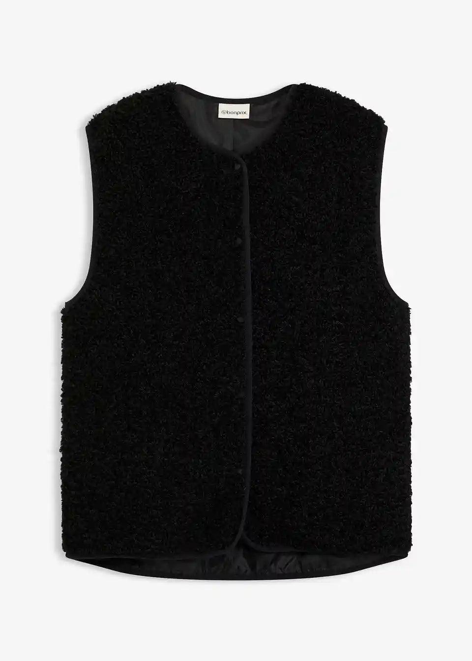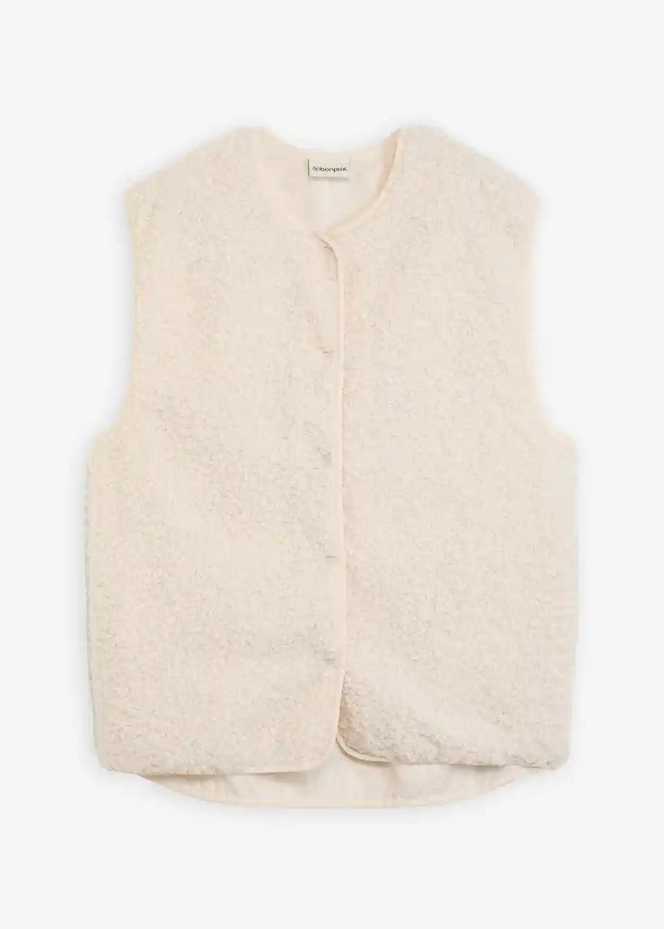 Široko krojen plišast telovnik iz umetnega ovčjega krzna s stranskimi všitimi žepi.