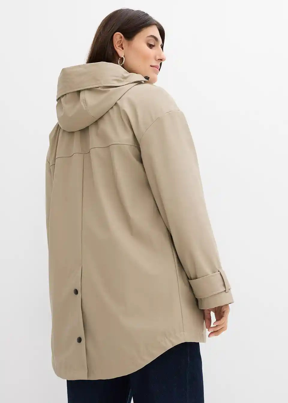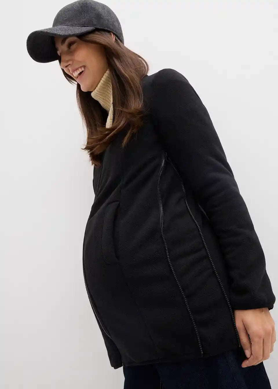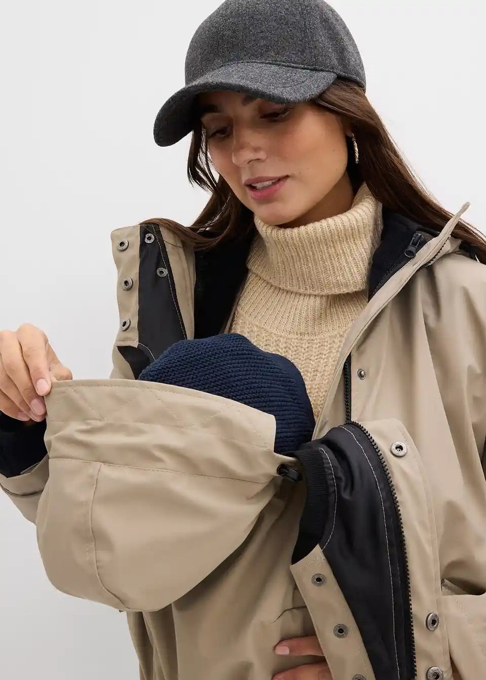 Dežju in vetru odporna funkcijska jakna z dvema vložkoma: razširitvenim vložkom za nosečnost in vložkom za nošenje dojenčka. Velika kapuca ima elastično vrvico in zaščito proti dežju. V velike žepe z zapenjanjem na pritiskače je mogoče varno shraniti vsakdanje predmete. Rokavi so opremljeni z nastavljivimi trakovi in pritiskači, da se prepreči vdor vetra in mraza. Brez vložkov lahko jakno nosite kot običajno jakno. Zareza za udobje na robu zagotavlja dodatno svobodo gibanja. Flis jakno lahko nosite ločeno in jo s stranskimi zadrgami prilagodite posameznemu mesecu nosečnosti. Tudi flis jakna ima praktične žepe.
