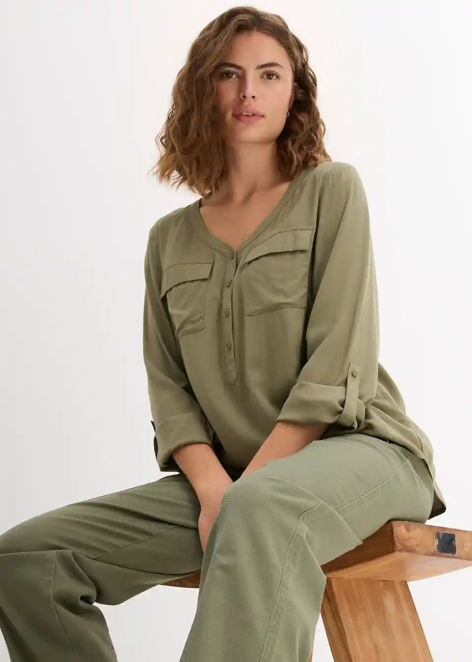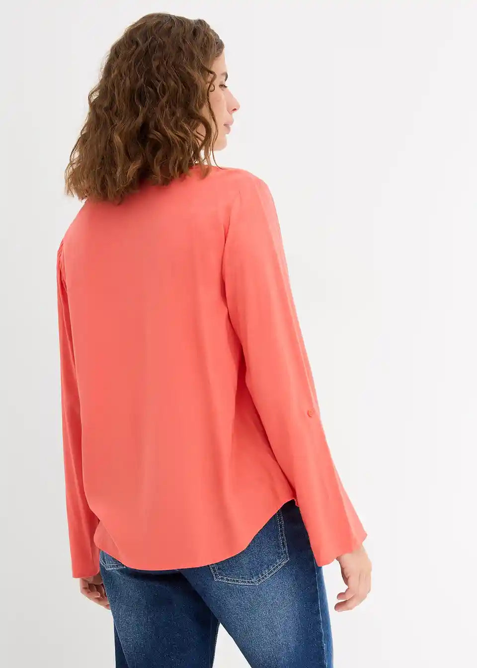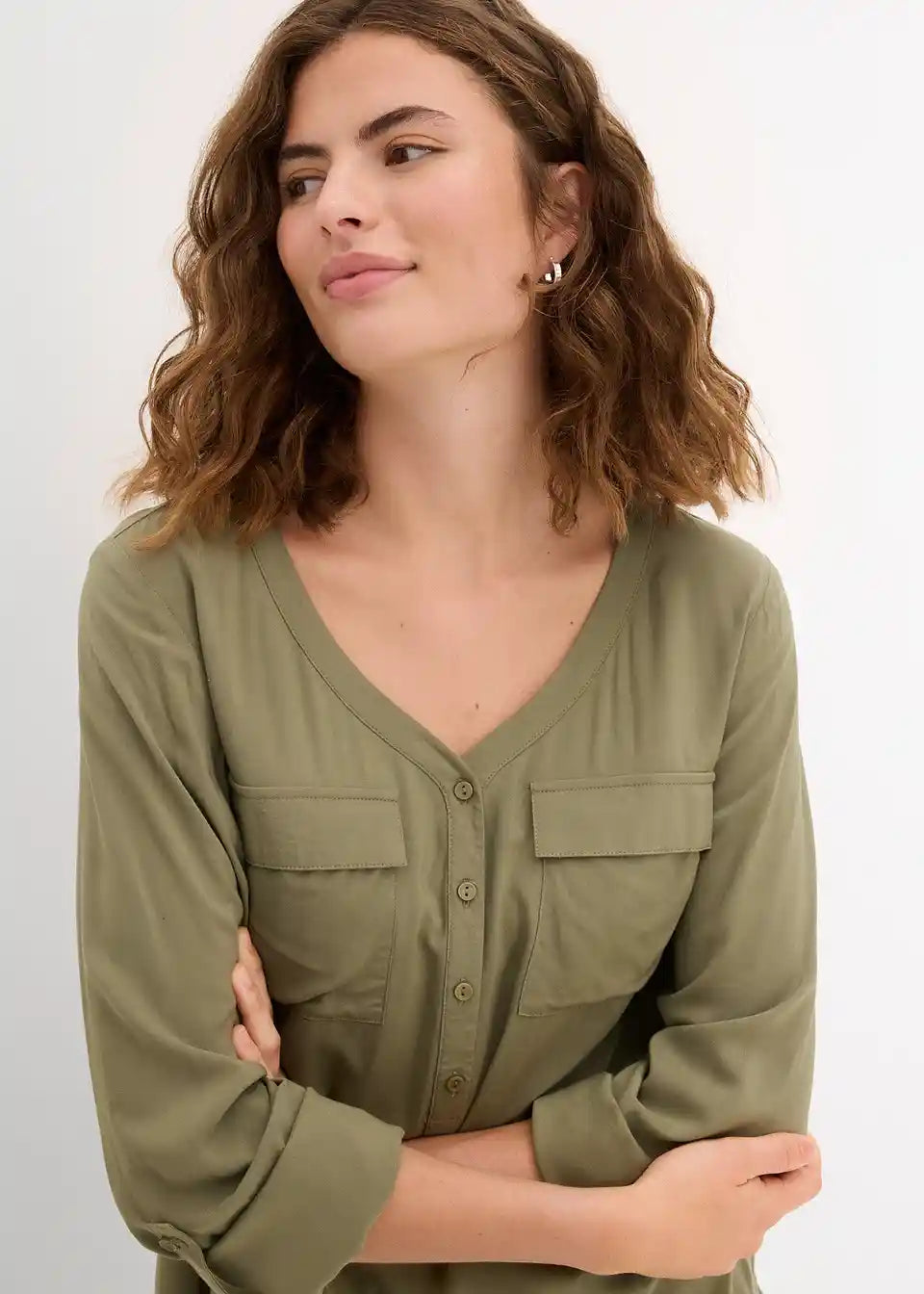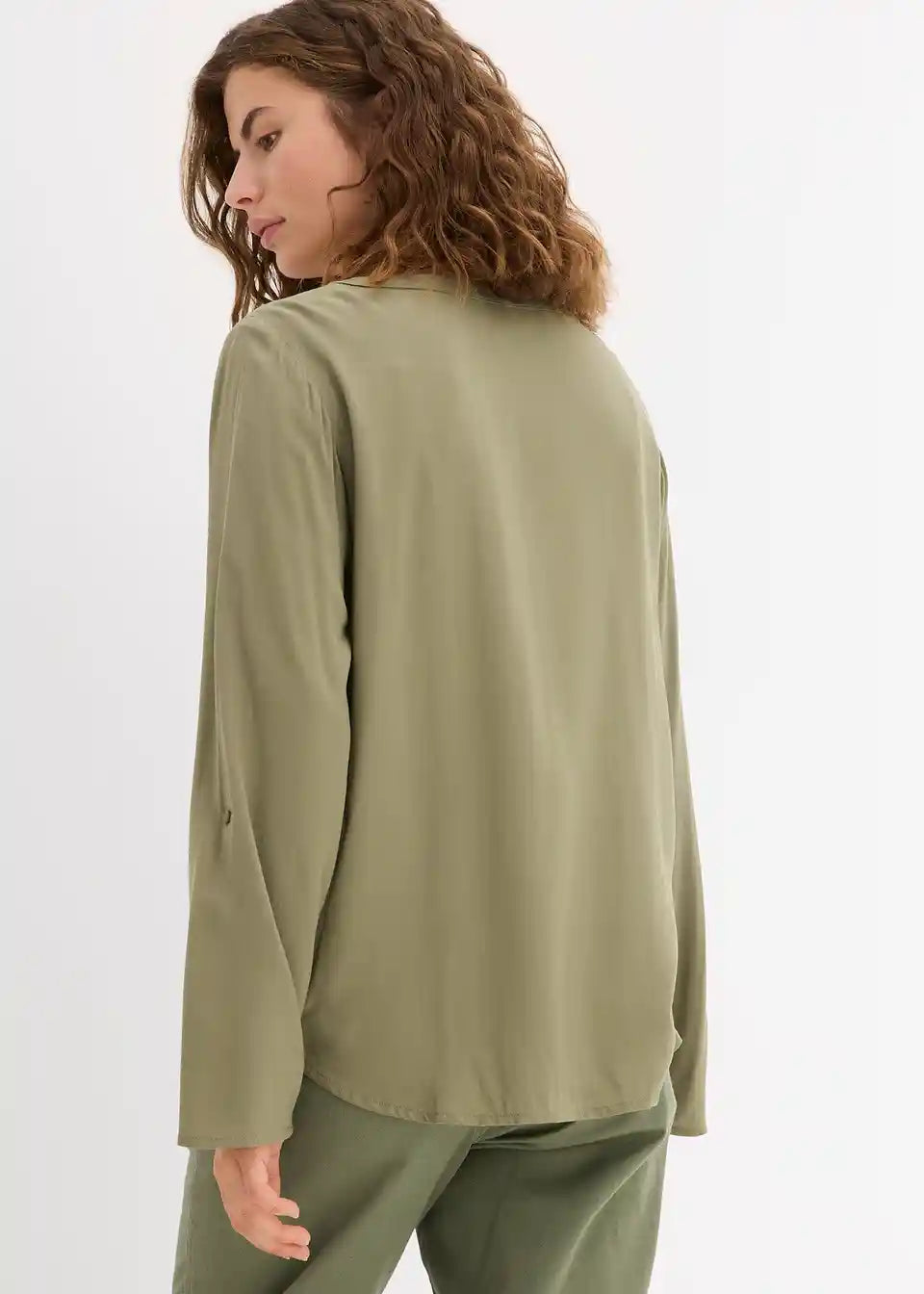 Bluzka z dolgimi rokavi iz padajoče viskoze. Rokave je mogoče zavihati in zapreti s paščkom z gumbom.