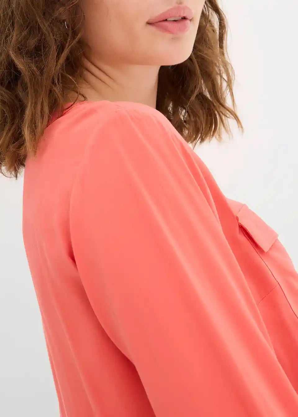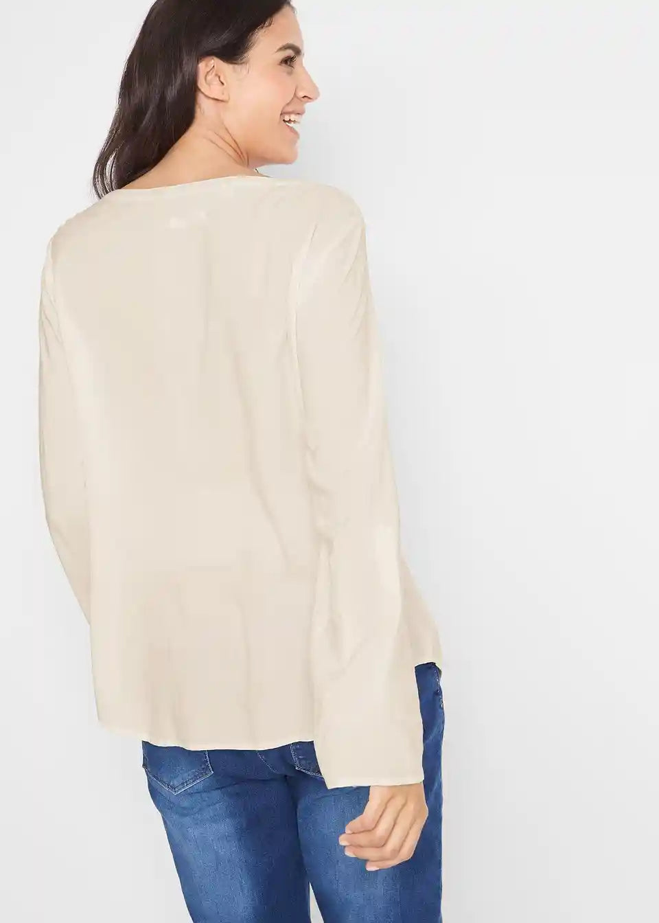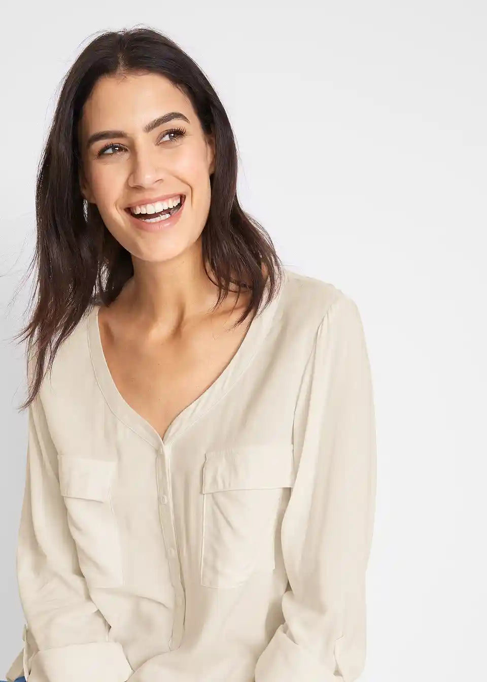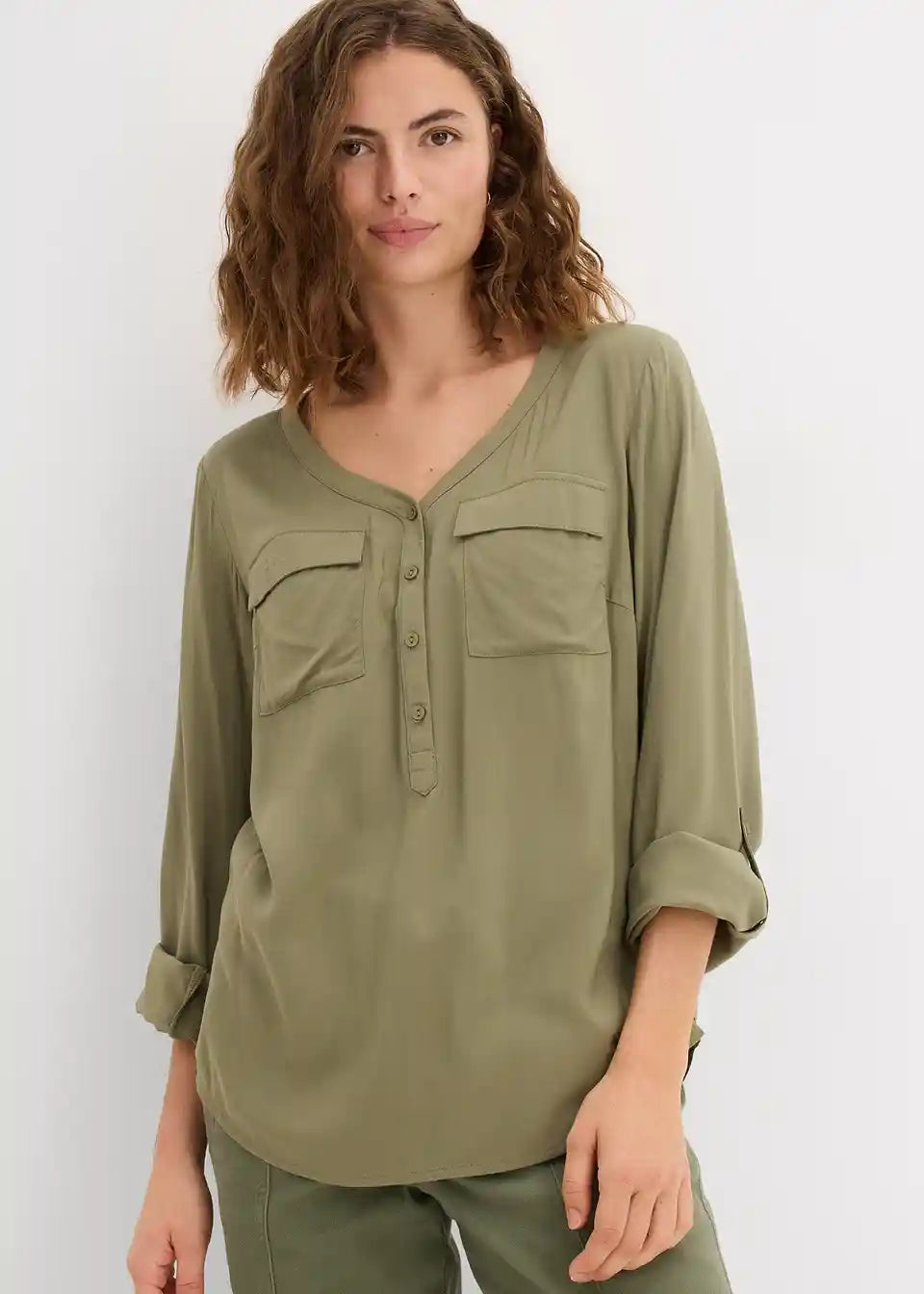 Bluzka z dolgimi rokavi iz padajoče viskoze. Rokave je mogoče zavihati in zapreti s paščkom z gumbom.