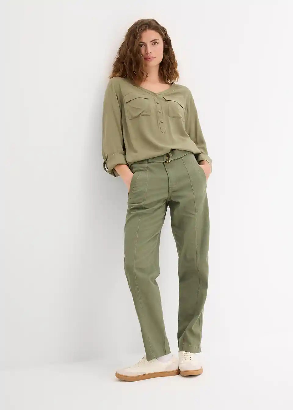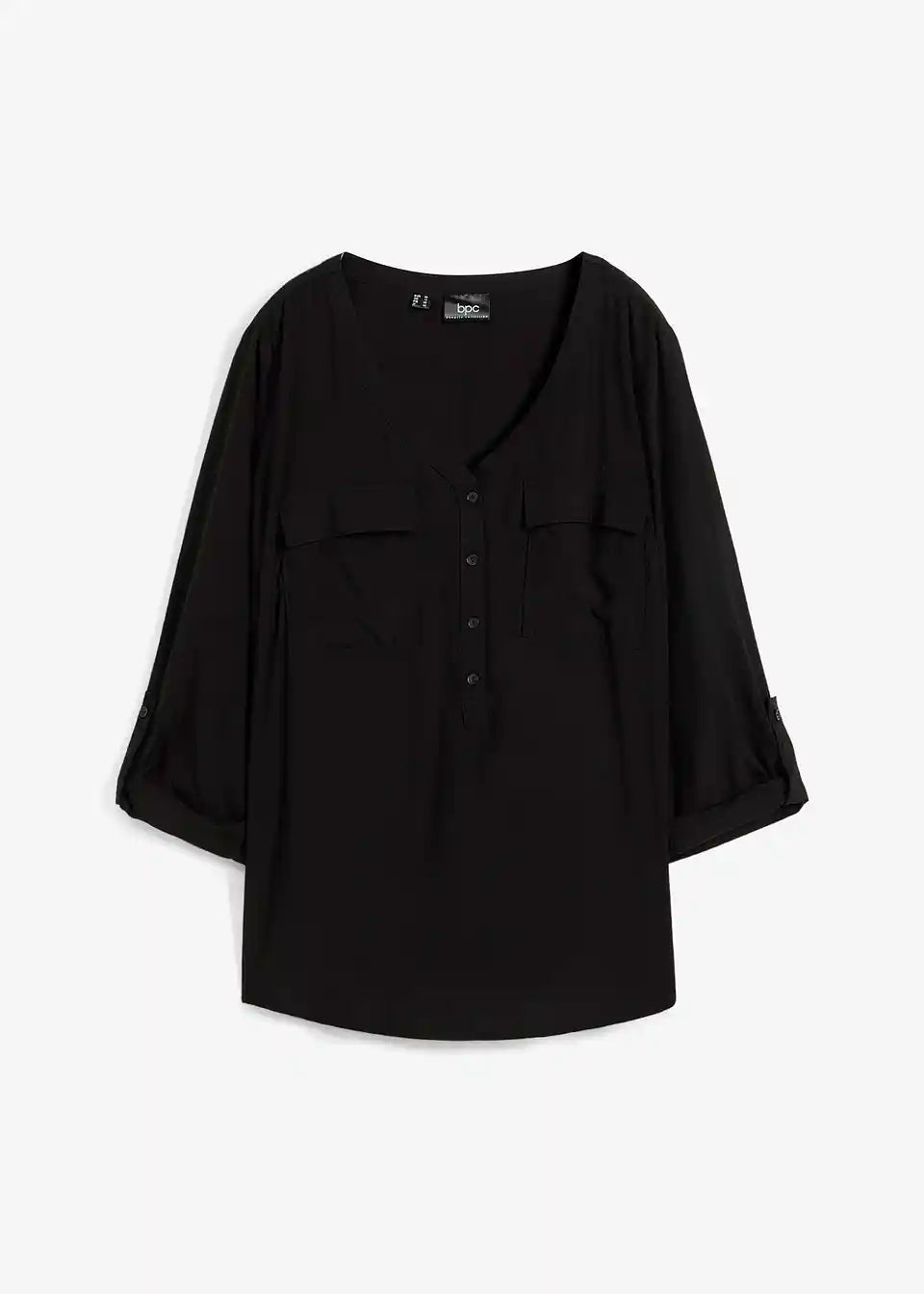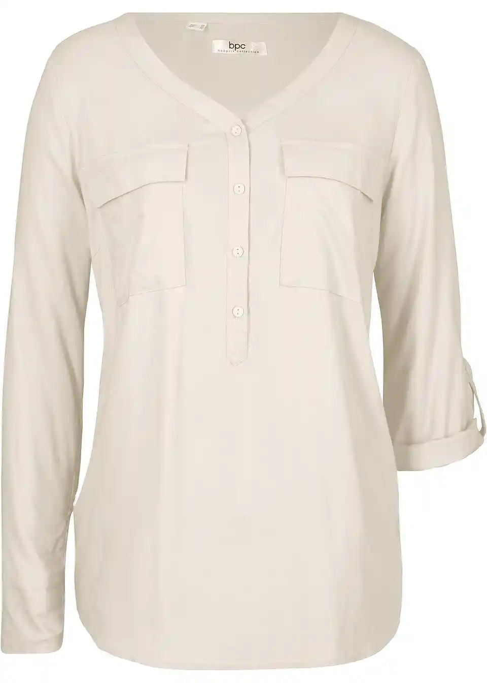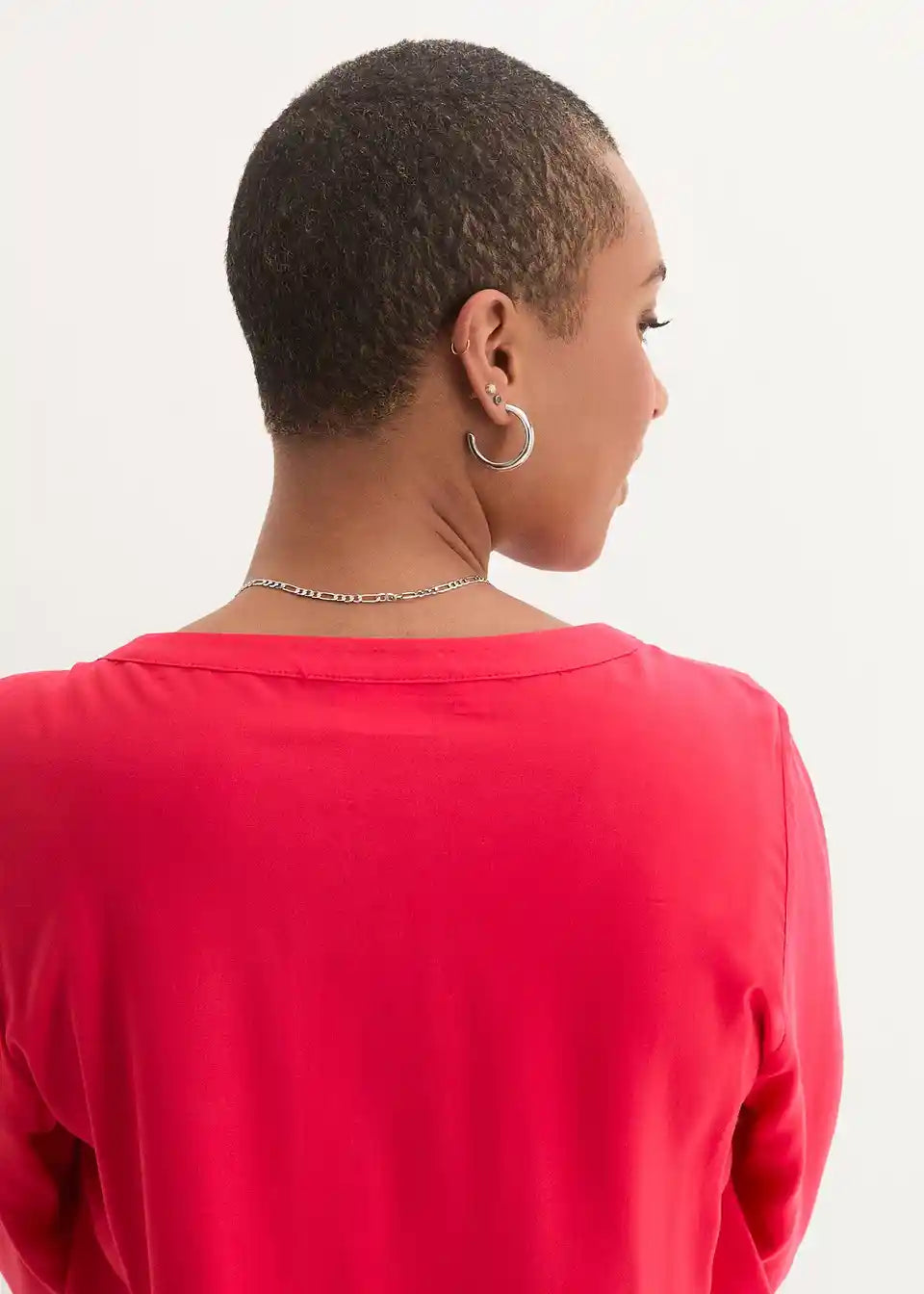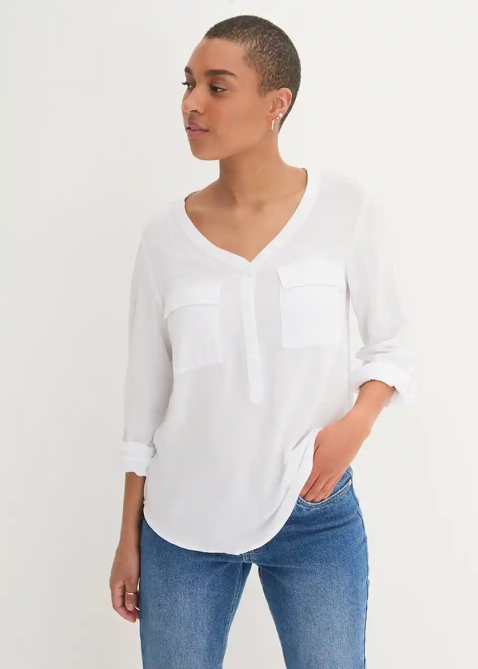 Bluzka z dolgimi rokavi iz padajoče viskoze. Rokave je mogoče zavihati in zapreti s paščkom z gumbom.