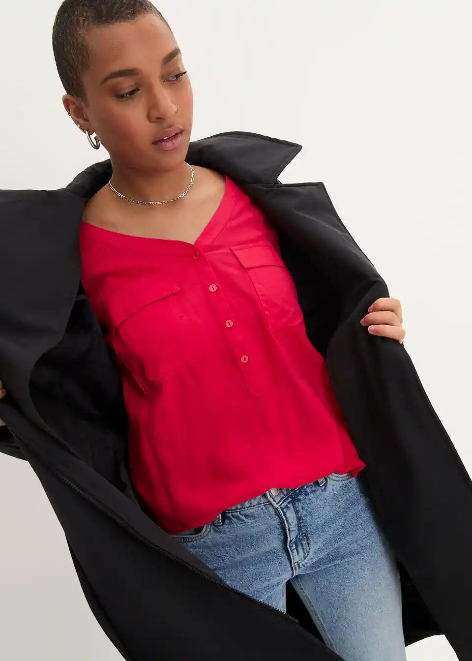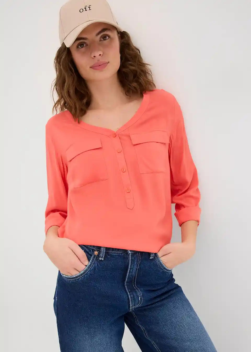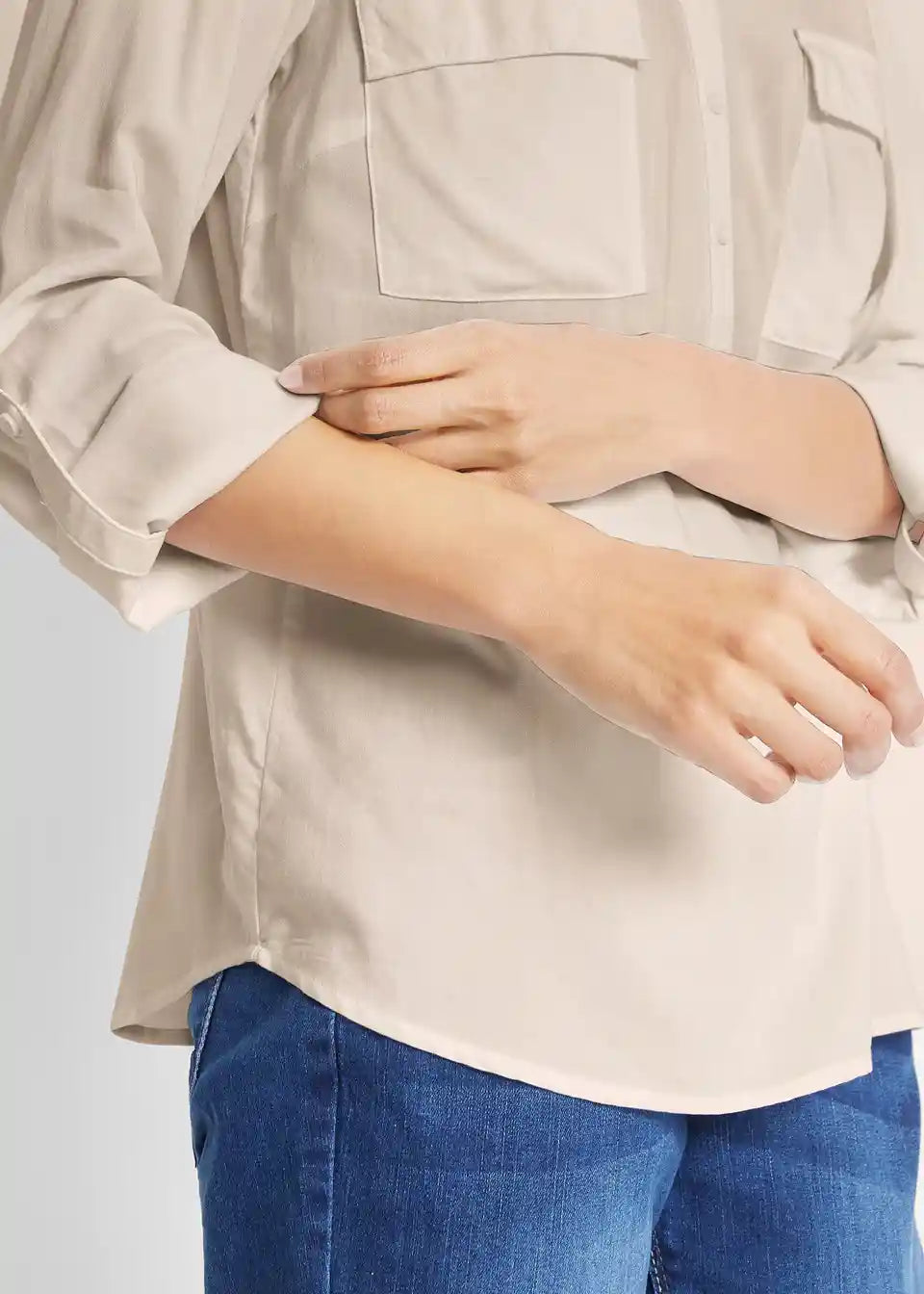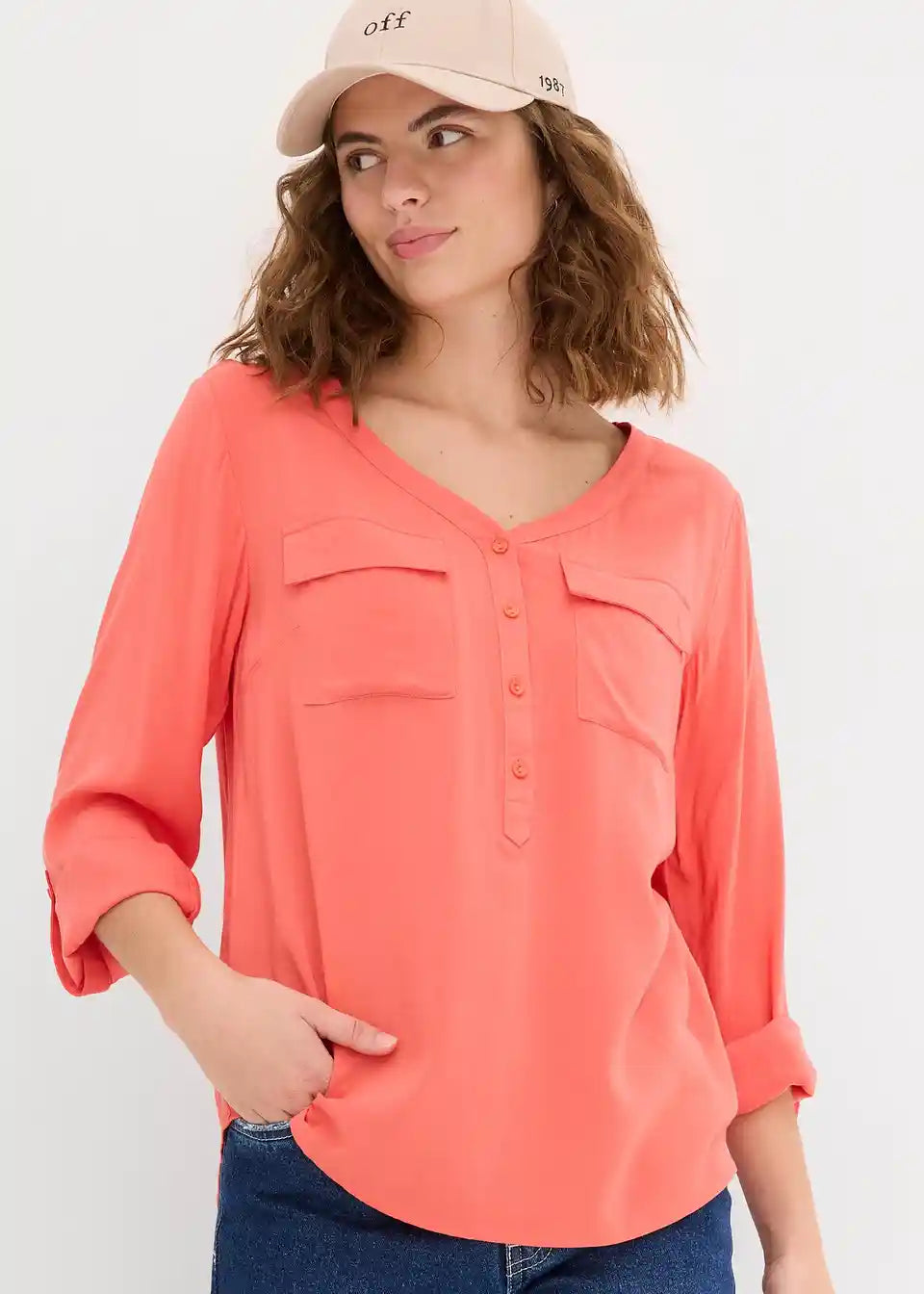 Bluzka z dolgimi rokavi iz padajoče viskoze. Rokave je mogoče zavihati in zapreti s paščkom z gumbom.