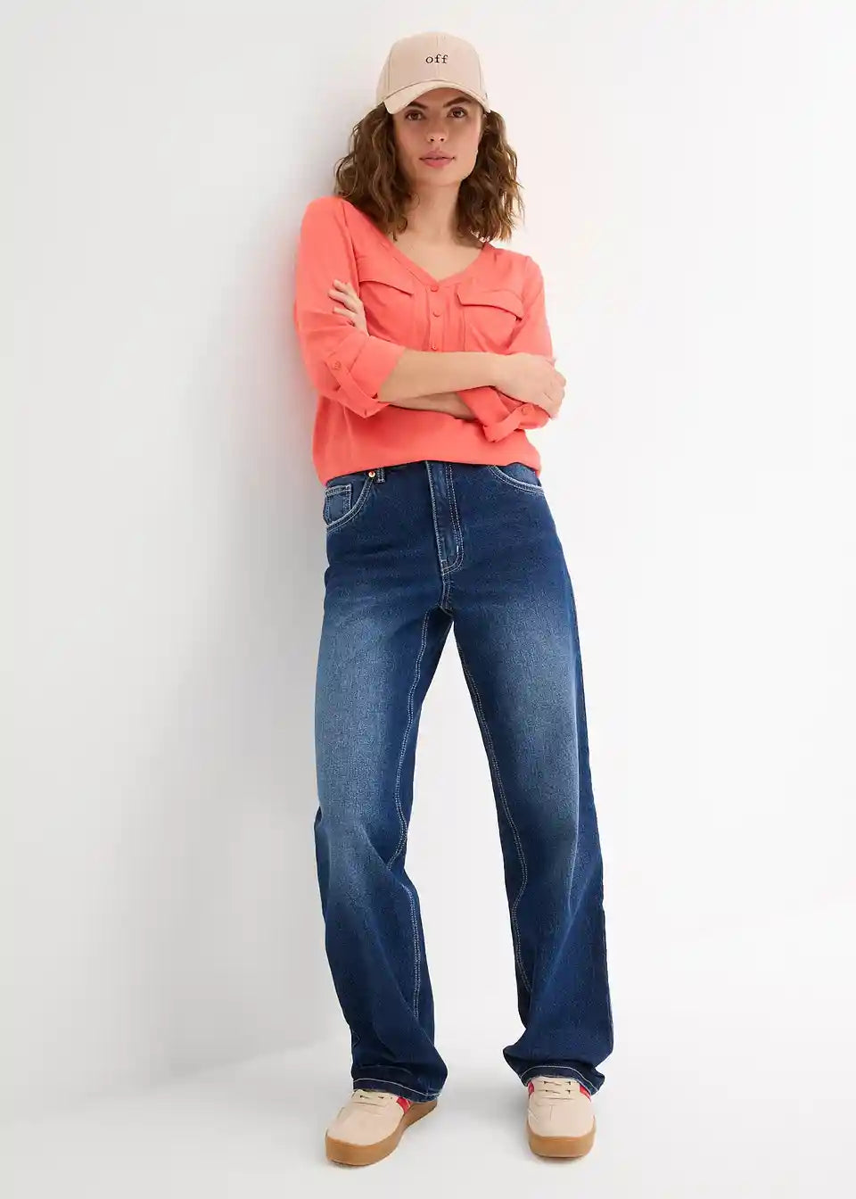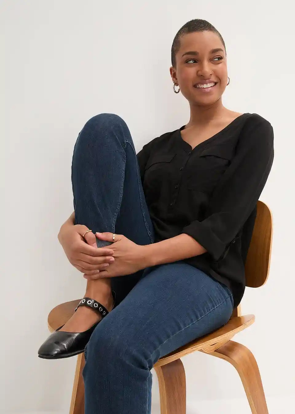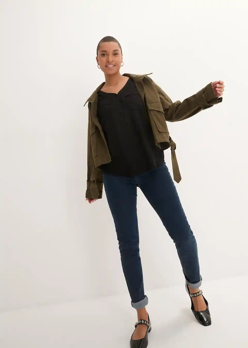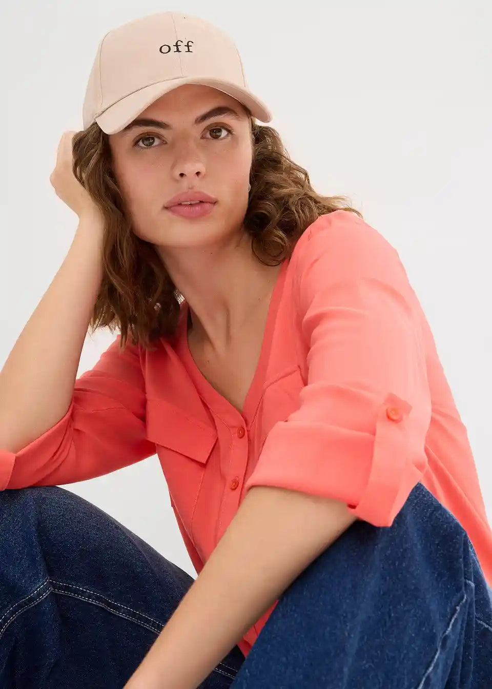 Bluzka z dolgimi rokavi iz padajoče viskoze. Rokave je mogoče zavihati in zapreti s paščkom z gumbom.