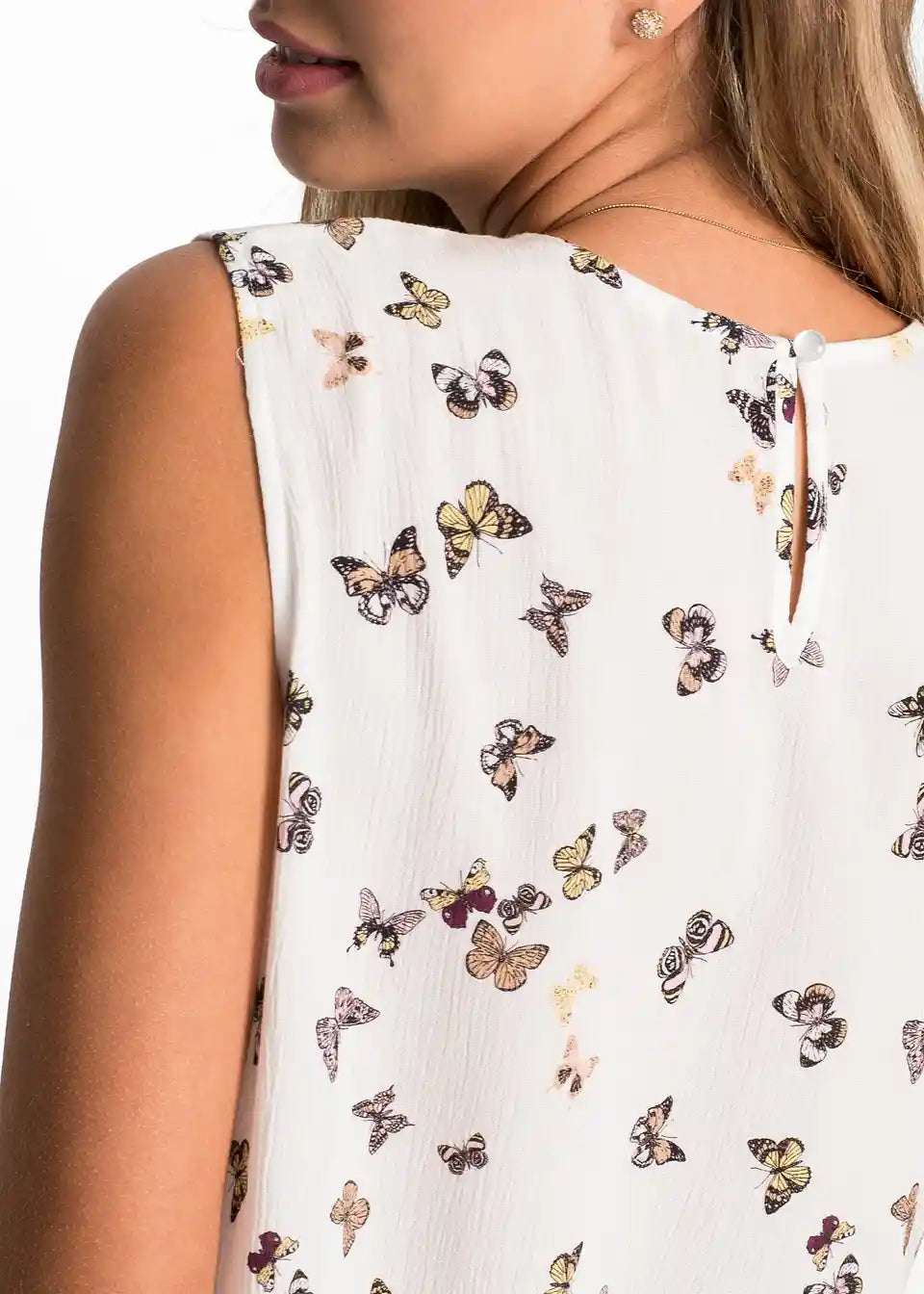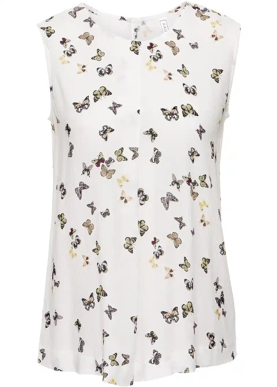 Igriv vzorec po celotni površini zagotavlja stilski videz pri tem ljubkem bluznem topu. Spredaj dodani gubi modelu z okroglim izrezom dodajata širino, ki nežno ovije postavo. Fini material pada mehko in tekoče. Trendovski top z okroglim izrezom se zapira na zatilju z majhnim gumbom. Modni detajl je majhna reža pod zapiranjem.