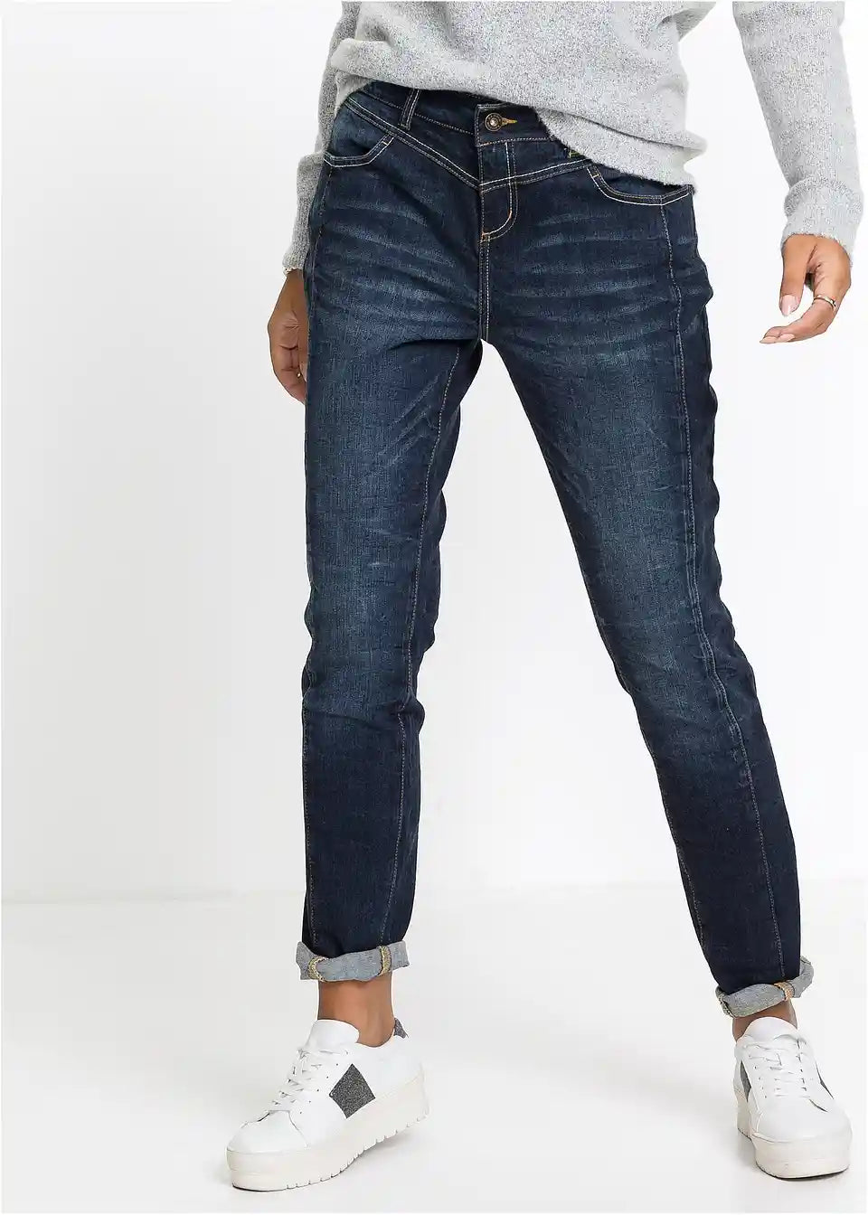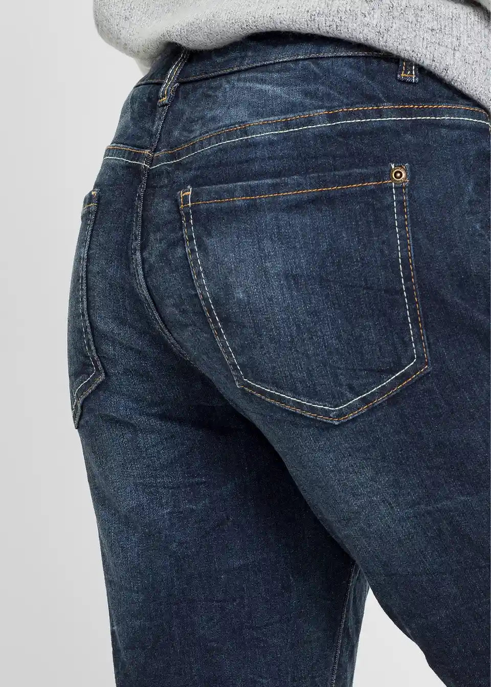 Trendovski videz pranja in dekorativni okrasni šivi – te Boyfriend-Jeans so polne stilskih detajlov. Model je narejen trajnostno in ima moderne sledi pranja, kroj je širši in z udobno višino pasu. Žepi, zanke za pas in sprednje zapenjanje so skupaj s sedlom kavbojk vidno kontrastno prešiti. Robovi zadnjih žepov so okrašeni z majhnimi kovinskimi zakovicami.