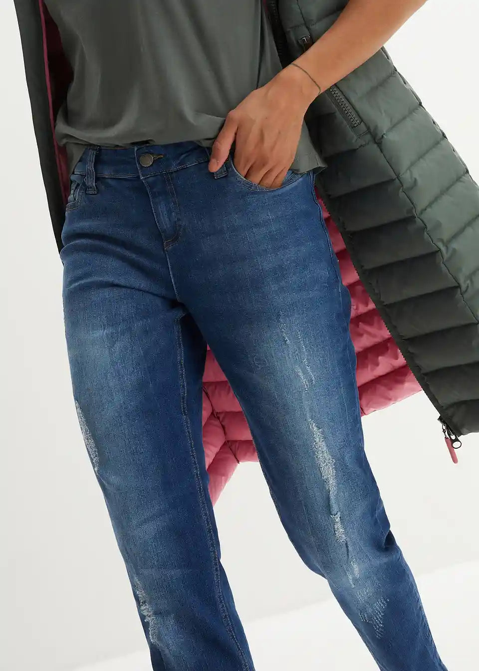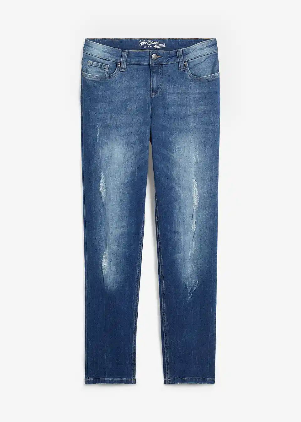 Te Boyfriend Stretch-jeans hlače znamke John Baner prepričajo z svojim modnim videzom. Hlače odlikujejo sproščen kroj in močno pranje. Opazni uničeni efekti in stil "used" popolnoma zaokrožijo dizajn. Jeans hlače navdušijo s tipično 5-žepno obliko in udobnim deležem raztegljivosti. Z zavihanimi hlačnicami delujejo model še posebej kul.