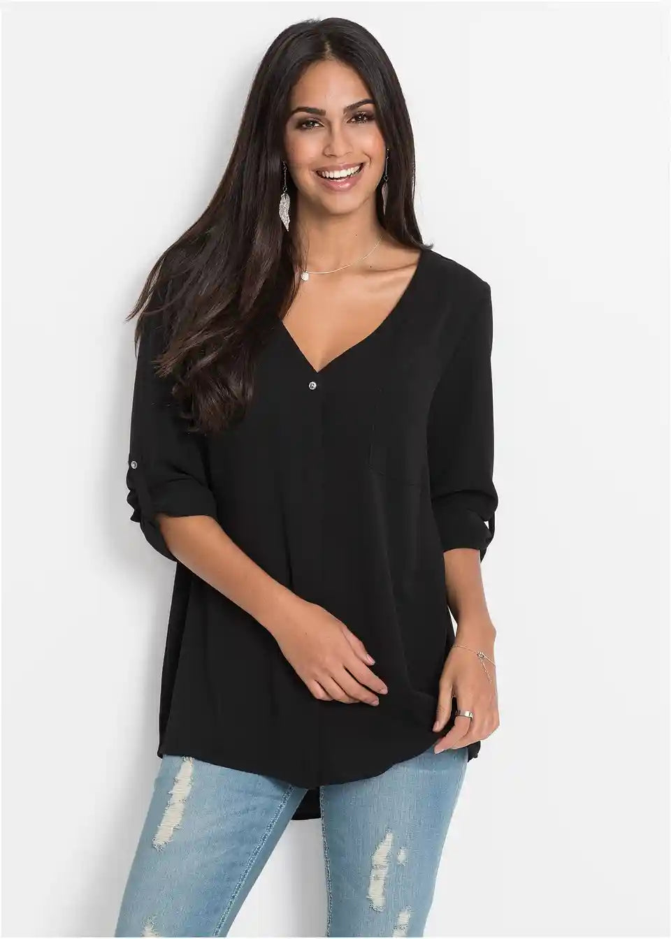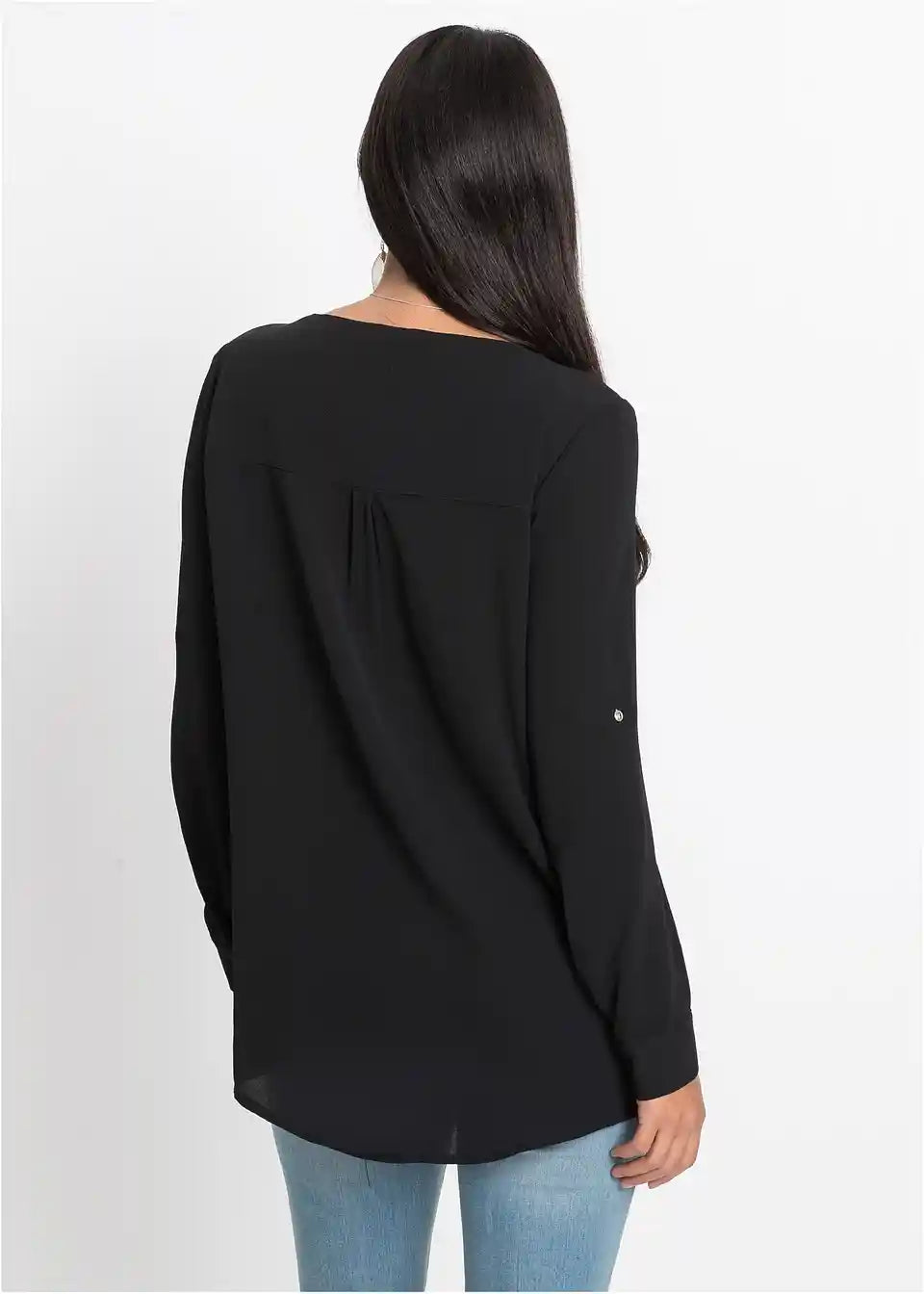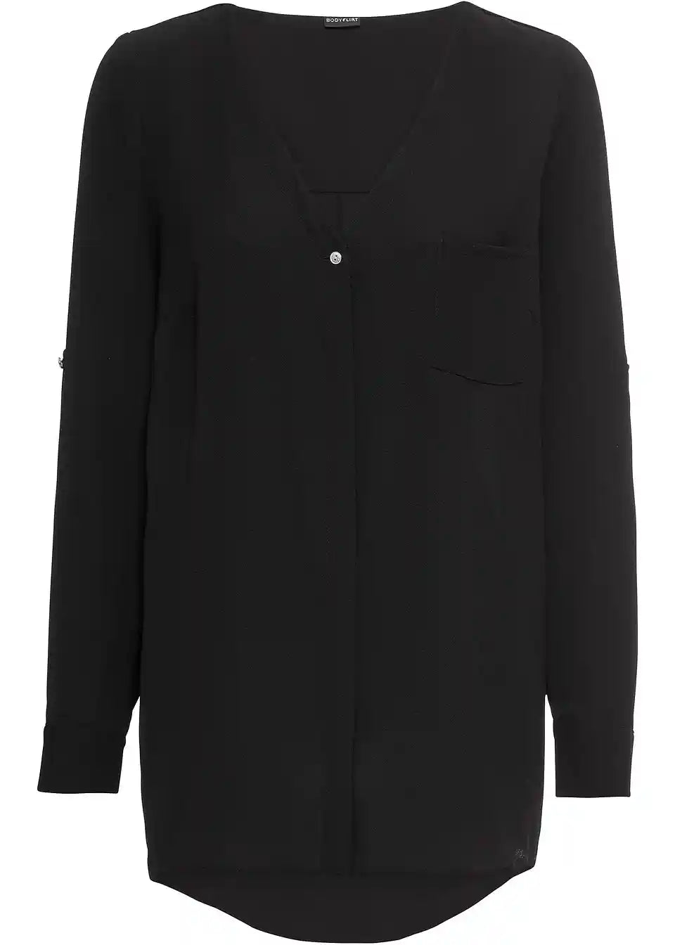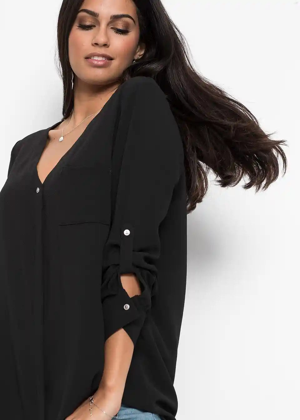 Rahlo transparentna bluza z dolgimi rokavi iz krep materiala z globokim V-izrezom. Z zakritim zapenjanjem na gumbe, rokave je mogoče zavihati in pritrditi z zanko in gumbom. Dolžina v št. 38 pribl. 74 cm.