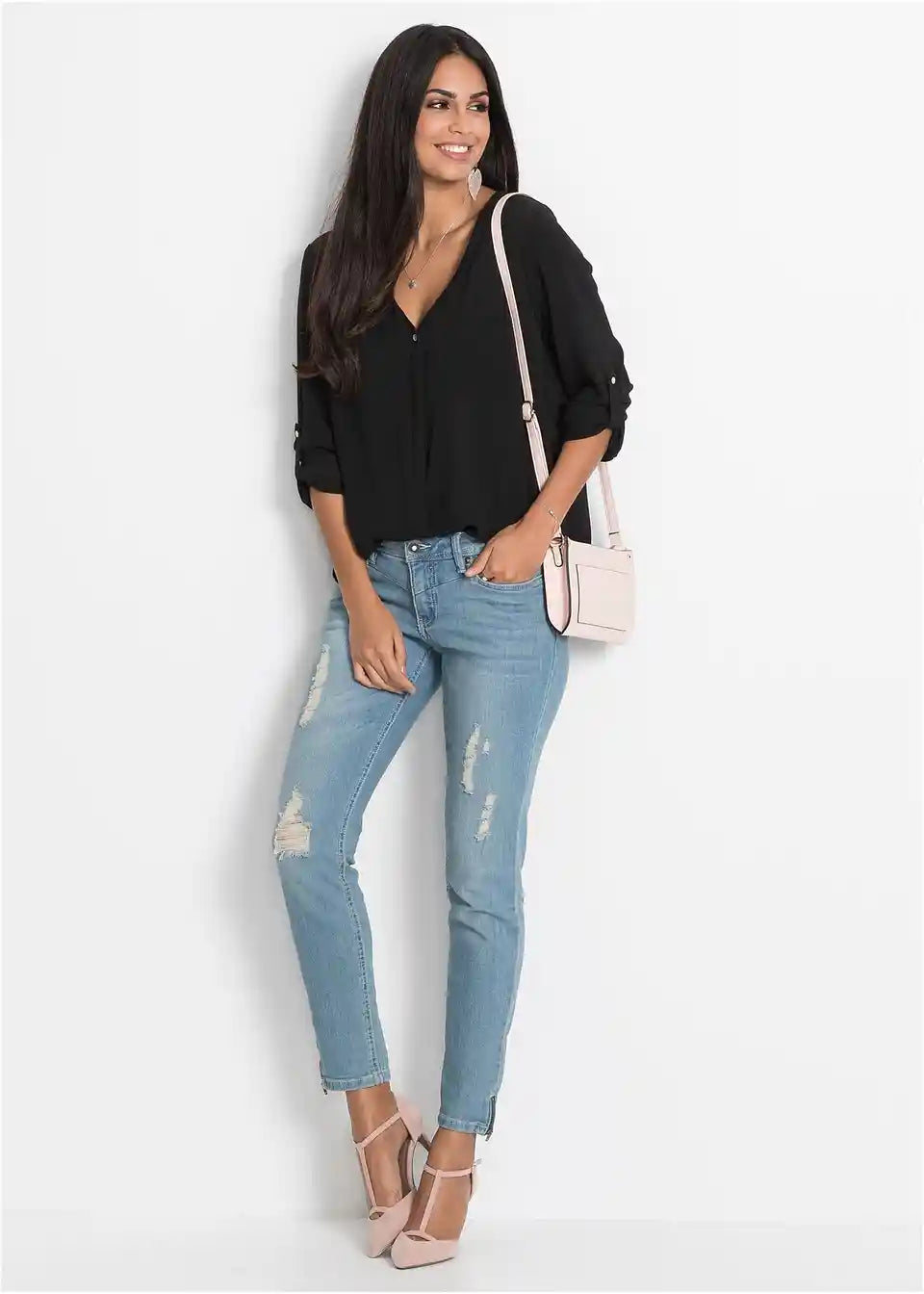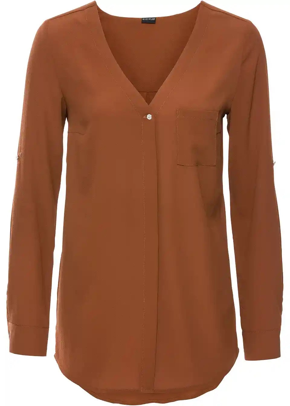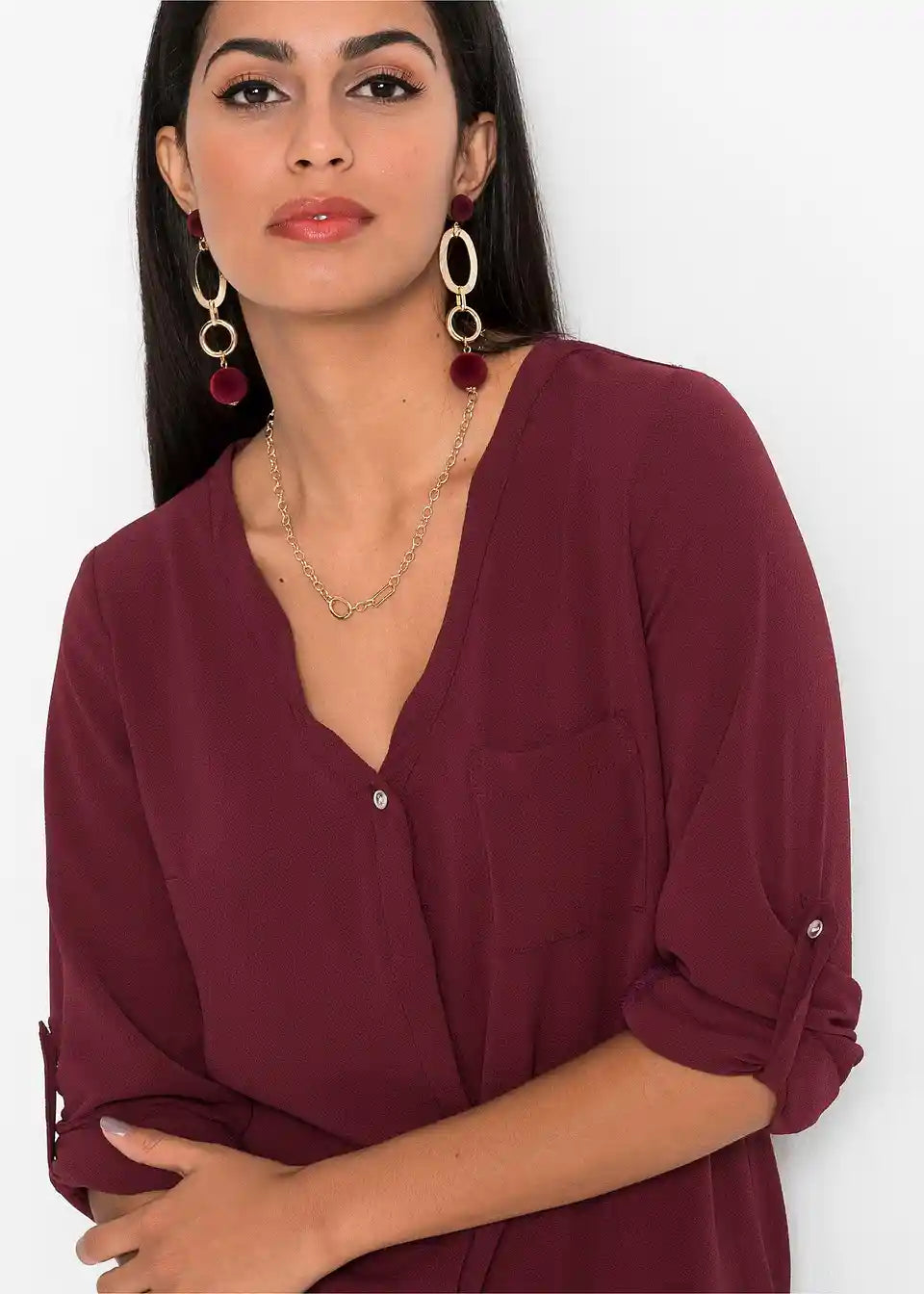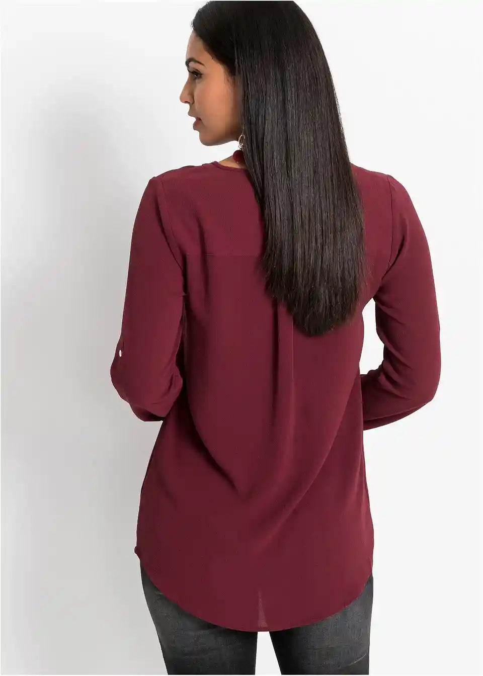 Rahlo transparentna bluza z dolgimi rokavi iz krep materiala z globokim V-izrezom. Z zakritim zapenjanjem na gumbe, rokave je mogoče zavihati in pritrditi z zanko in gumbom. Dolžina v št. 38 pribl. 74 cm.