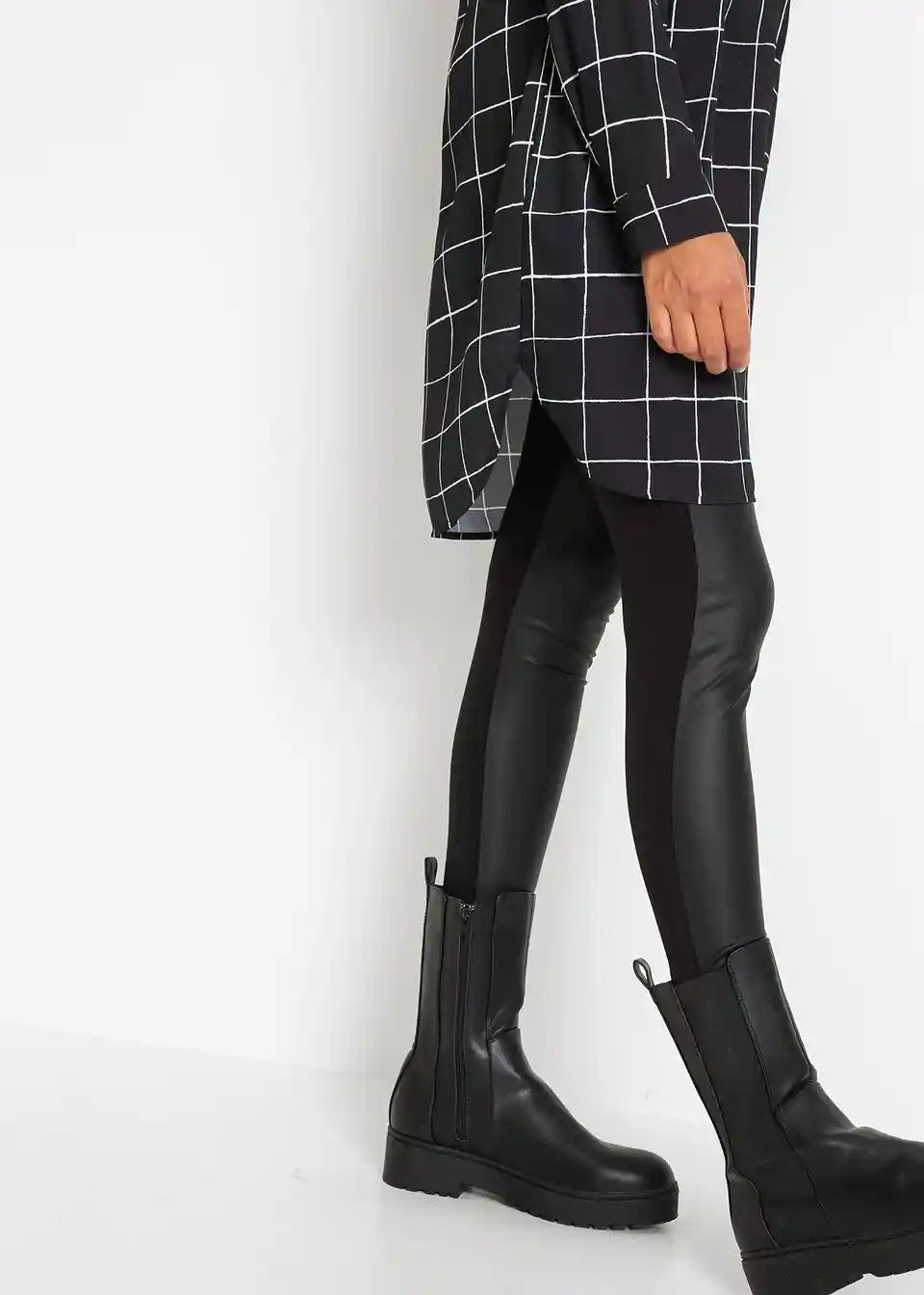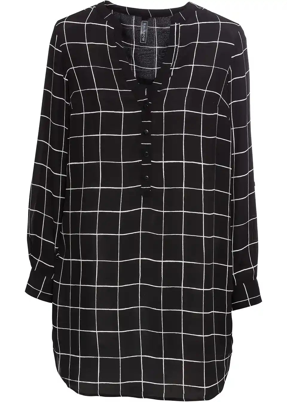Rahlo prosojen, fino tkani material in izjemno širok kroj sta pri tej dolgi bluzi v popolni kombinaciji. Priljubljen karirast vzorec dopolnjuje oblikovanje. Model brez ovratnika ima globok V-izrez, ki se nadaljuje v gumbnico. Rokavi imajo manšete, dolgi rokavi pa se lahko fiksirajo z zavihano funkcijo. Kariran model, ki se lahko nosi tudi kot mini obleka, navdušuje v kombinaciji z legicami iz imitacije usnja ali z opazno vzorčastimi hlačnimi nogavicami.