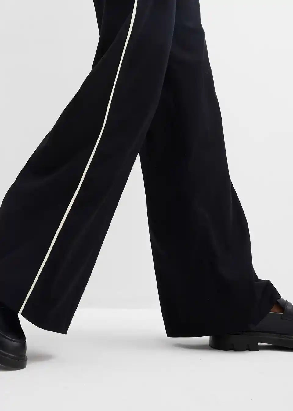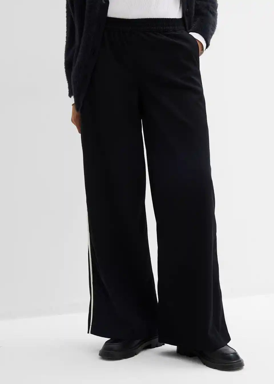 Marlene hlače z udobnim pasom, širokimi hlačnicami in stranskimi črtami