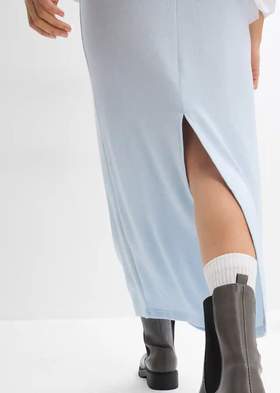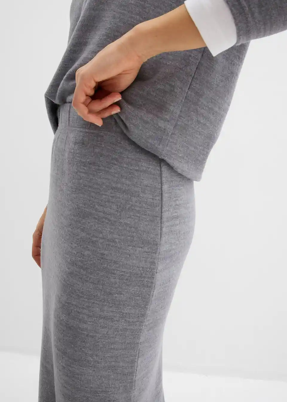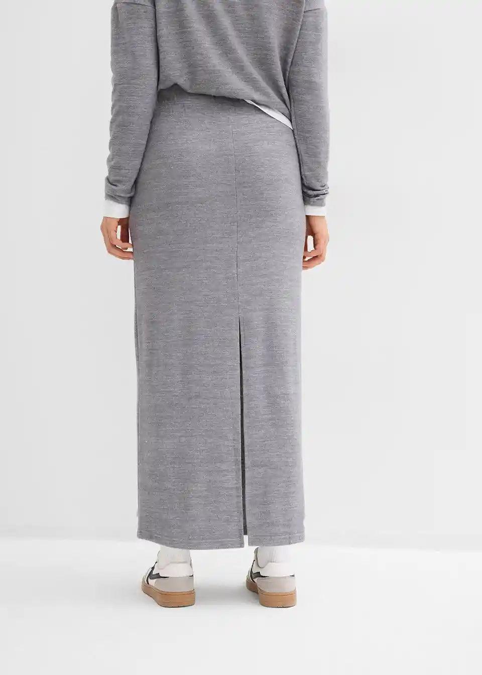 Dolgo krilo v videzu pletenine z visokim elastičnim pasom in razporkom zadaj.