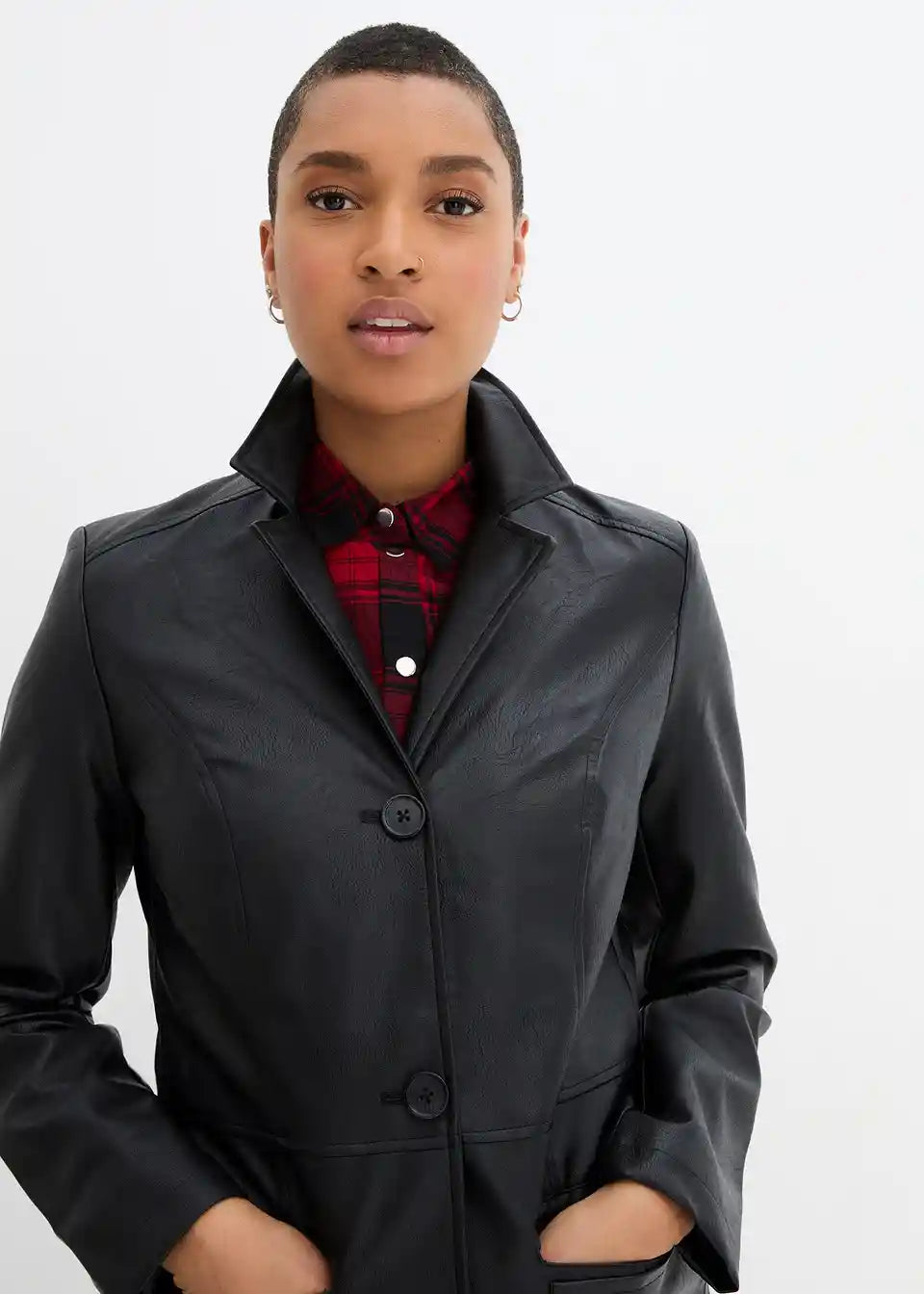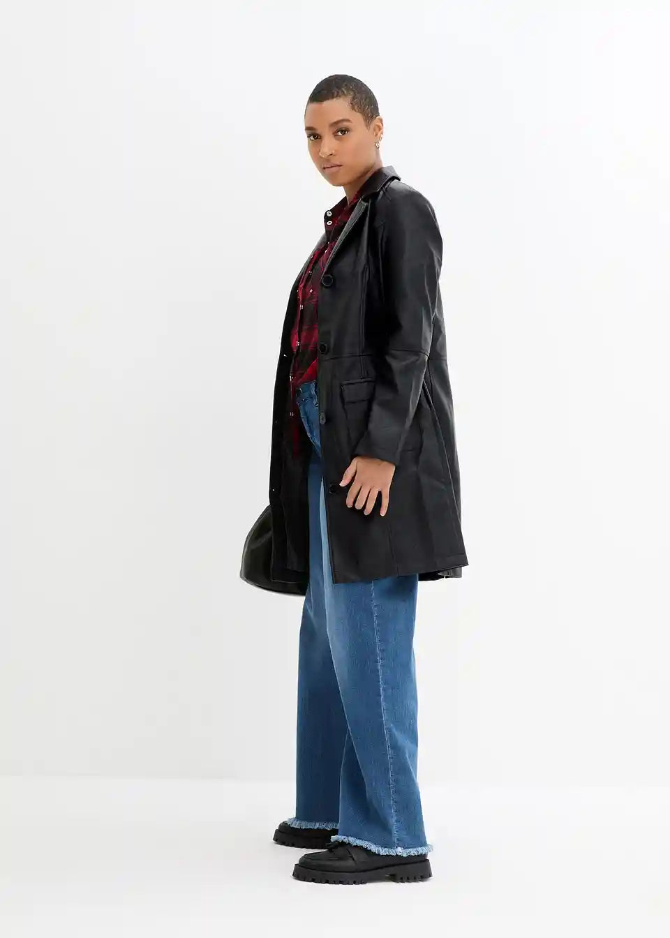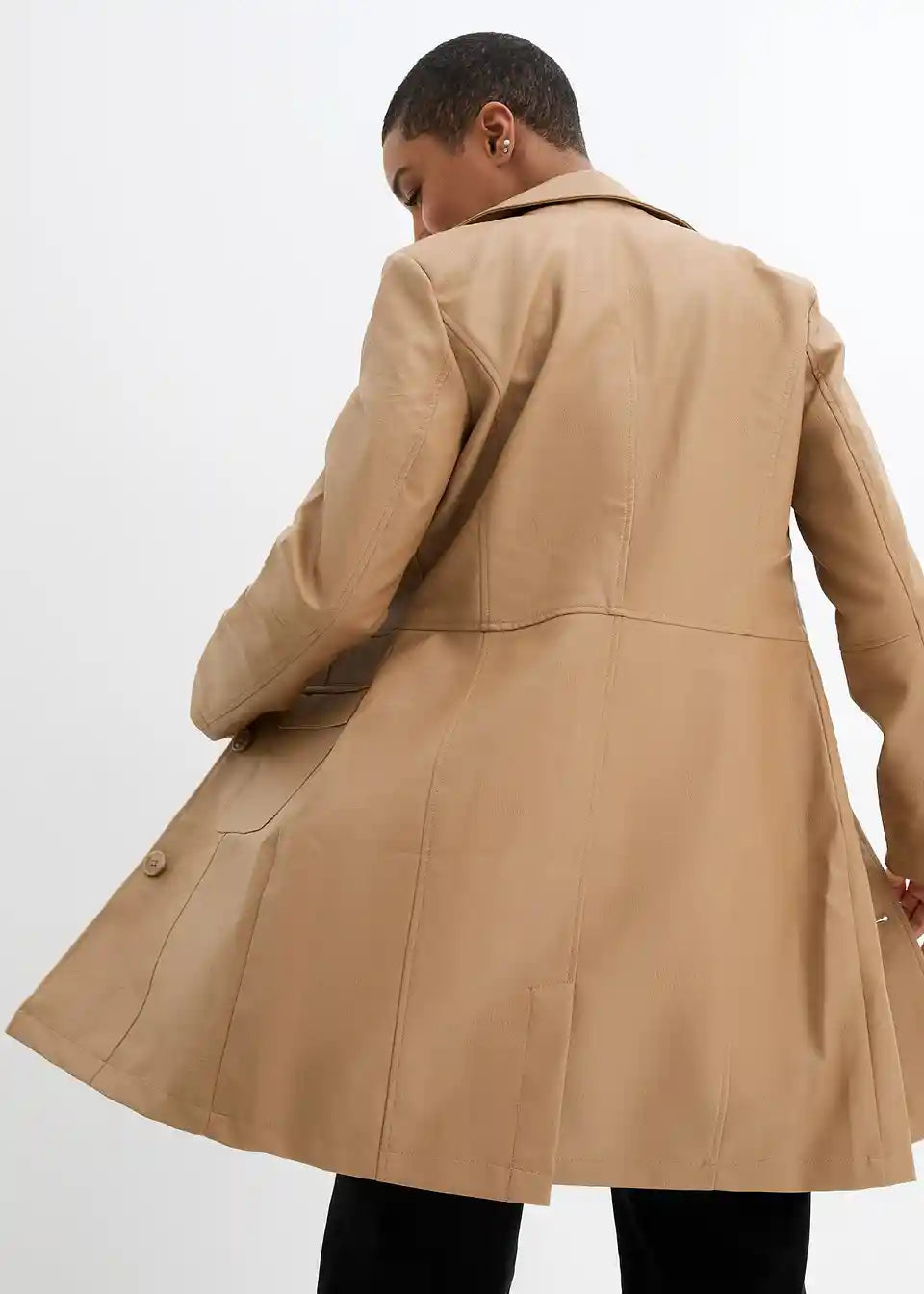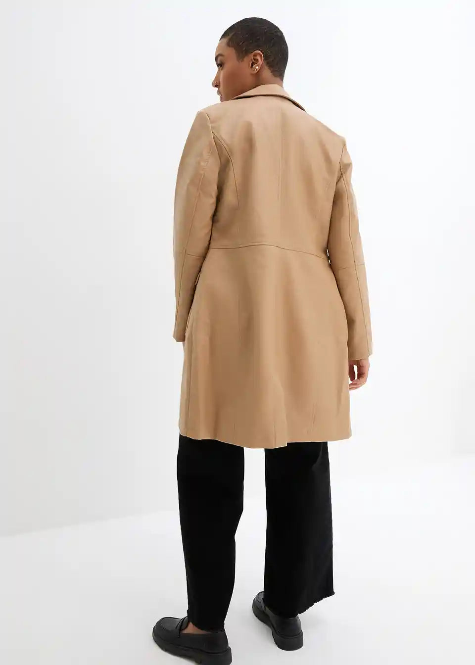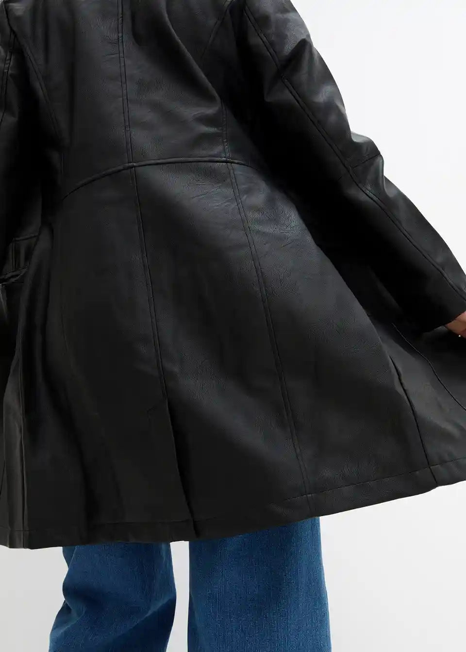 Ta sproščen plašč iz imitacije usnja znamke bpc je pravi privlačnež za oči. Kolenski dolgi plašč je krojen tako, da poudari postavo, in navdušuje s prišitimi poklopnimi žepi ter podaljšanim reverjem. Rever in za usnje značilni deljeni šivi optično podaljšajo in laskajo figuri. Oprijeti plašč se spredaj zapenja s štirimi velikimi gumbi.