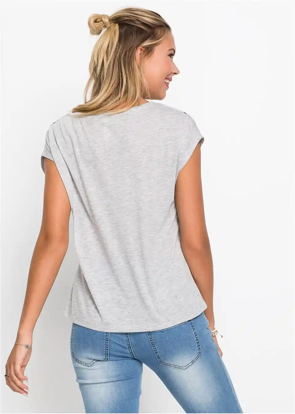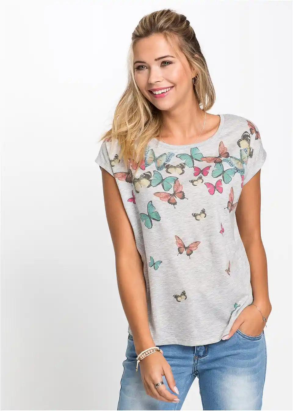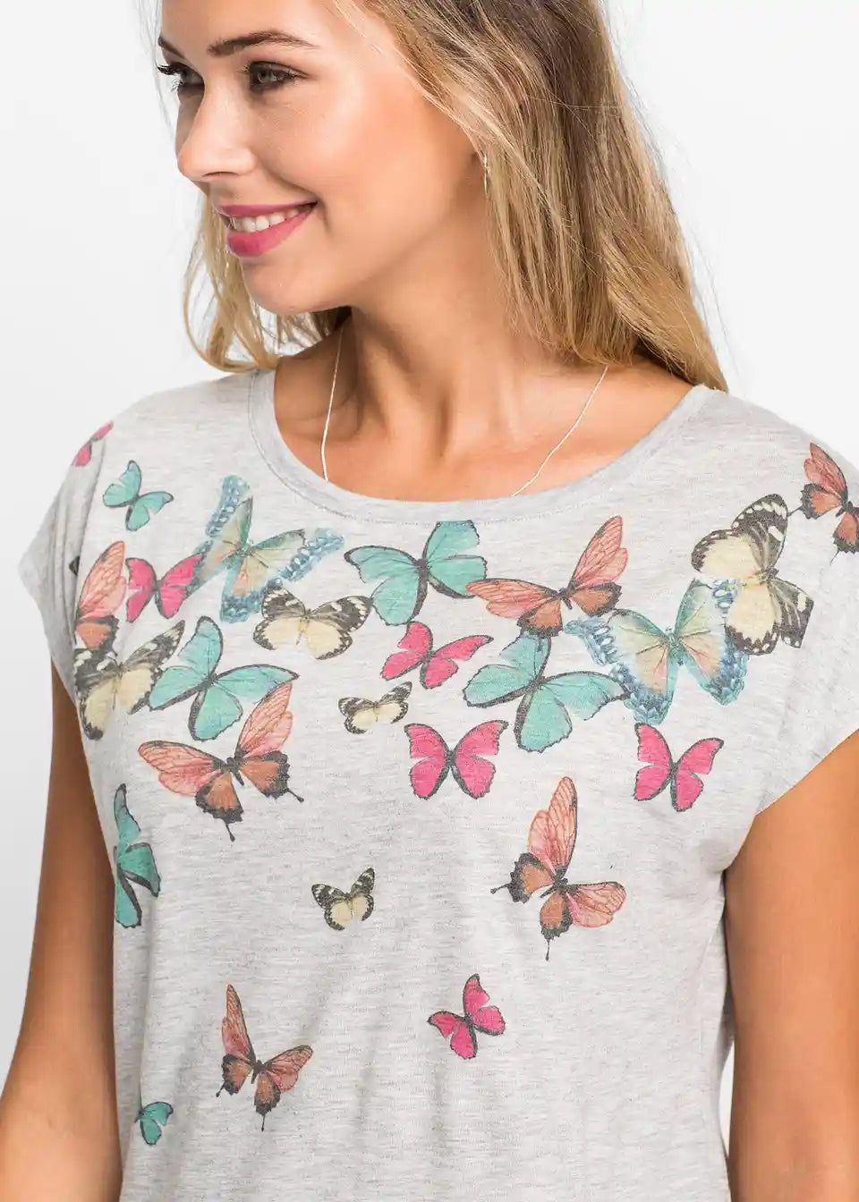 Barviti metulji krasijo to majico. Oblikovanju so dodani majhni krilni rokavi. Ohlapen model z okroglim izrezom navdušuje poleg svojih sanjskih videzov tudi z raznovrstnimi možnostmi kombiniranja. Sproščena oprava uspe z džinsom in supergami. Stilistična majica z metulji prepriča tudi z usnjenimi imitacijami kratkih kril ali dolgimi tilskimi krili. Kardigan ali blazer dopolnita videz.