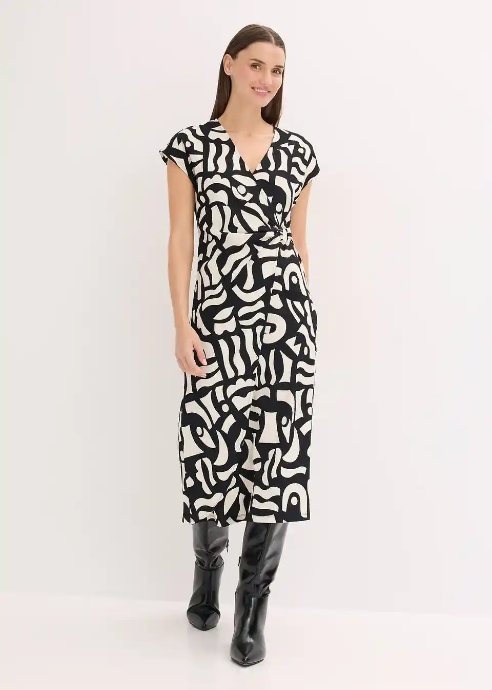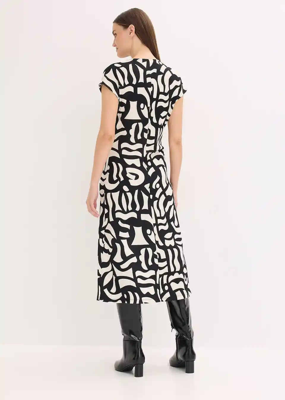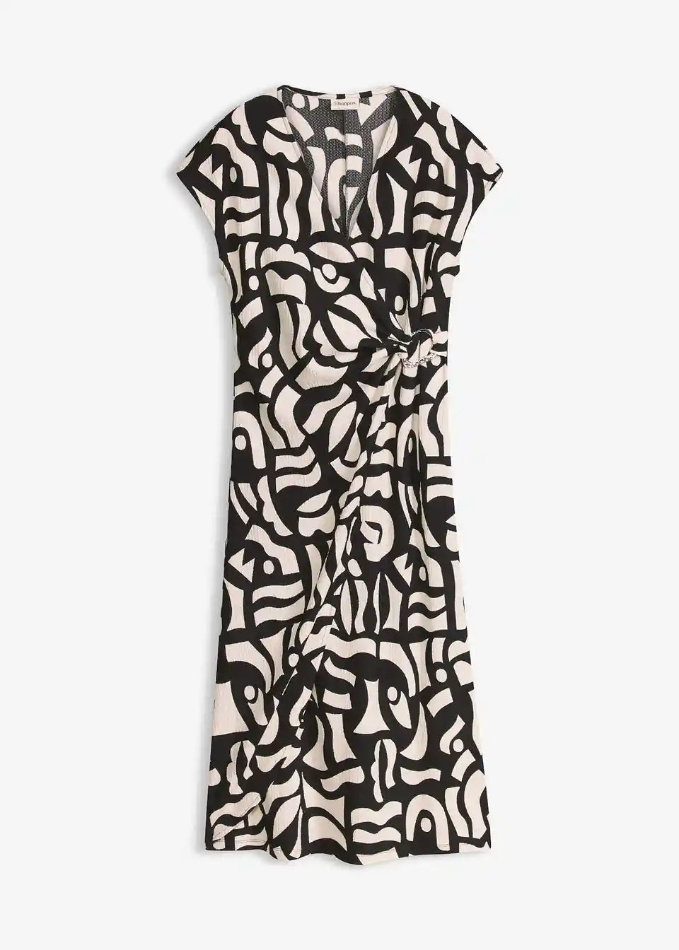 Grafično potiskana midi obleka z okrasnim detajlom obročka na strani v pasu
