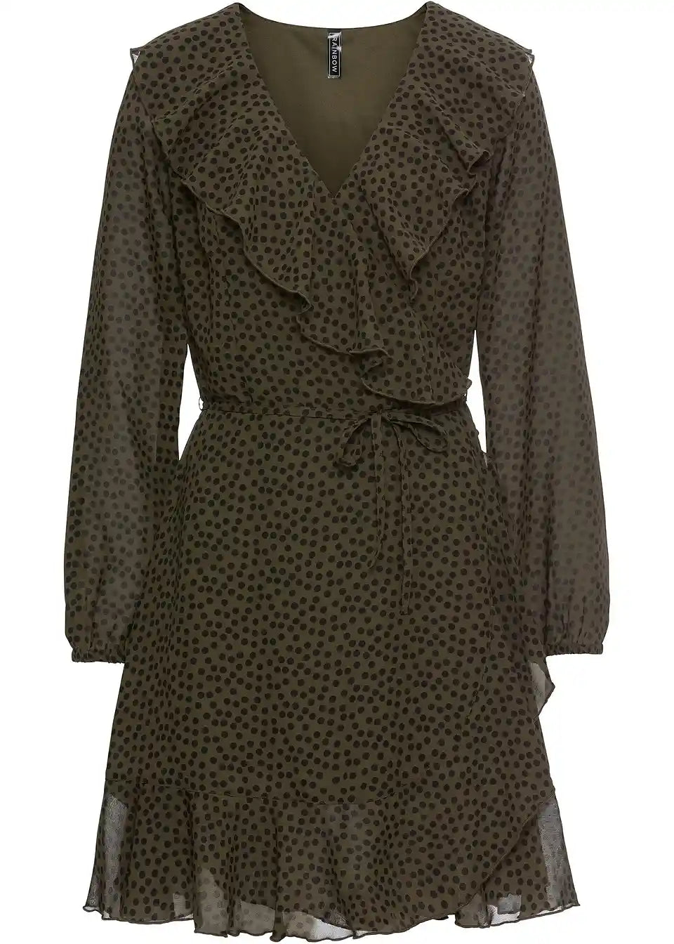 Moderen videz s pikami po celotni površini poskrbi za pravo senzacijo pri tej obleki v zavitem videzu z volančki. Opaznemu dizajnu se pridružujejo široki volančki pri V-izrezu z velikodušno odprtino. Tudi rob dobi s tkaninskim vložkom rafinirano noto. V kombinaciji z zavezovalnim pasom obleka z dolgimi rokavi in zavitim učinkom ter volančki pridobi ženstveno silhueto. Trendovska obleka z volančki in elastičnimi zaključki rokavov očara v kombinaciji s petami ali balerinkami in sanjavo speto pričesko.