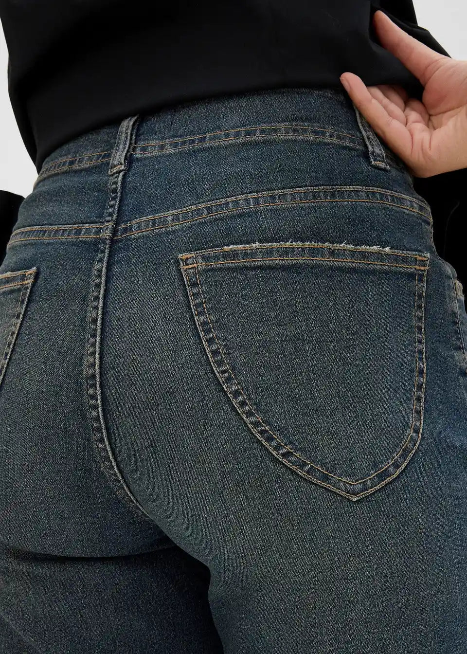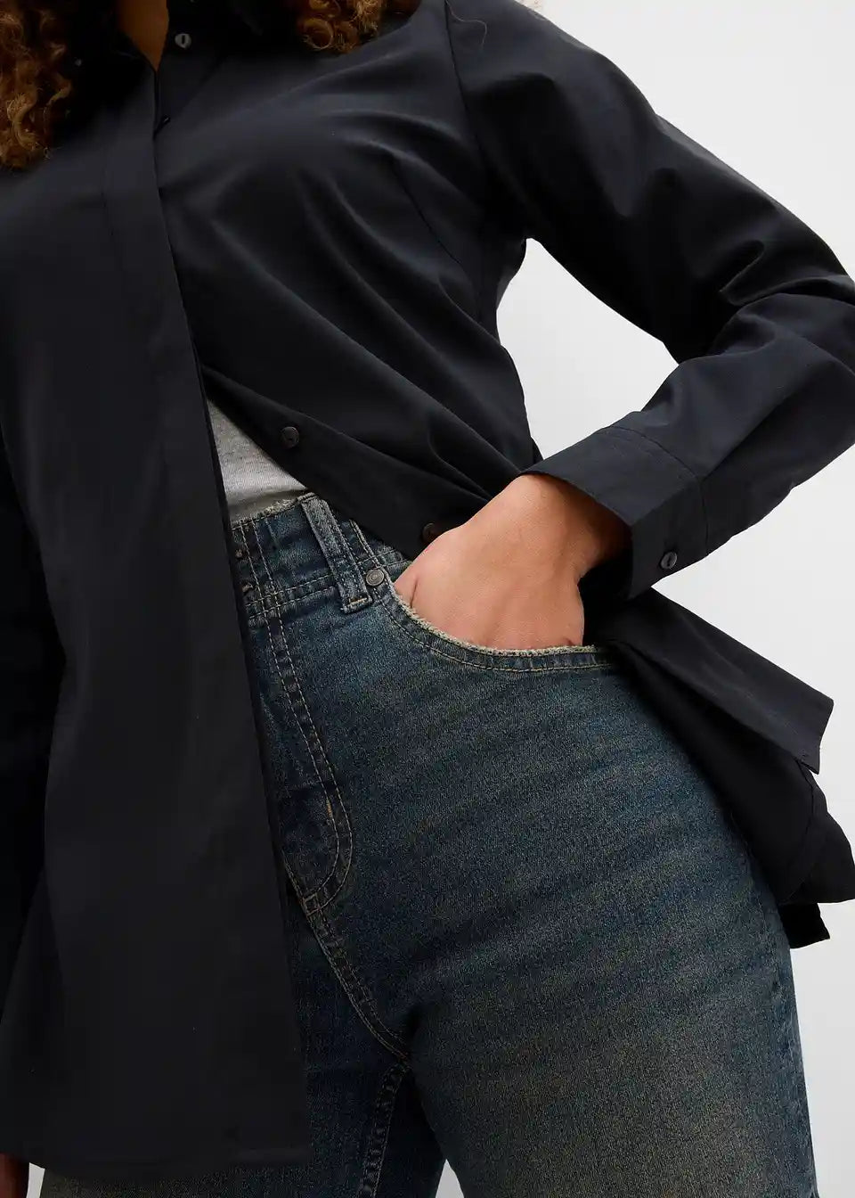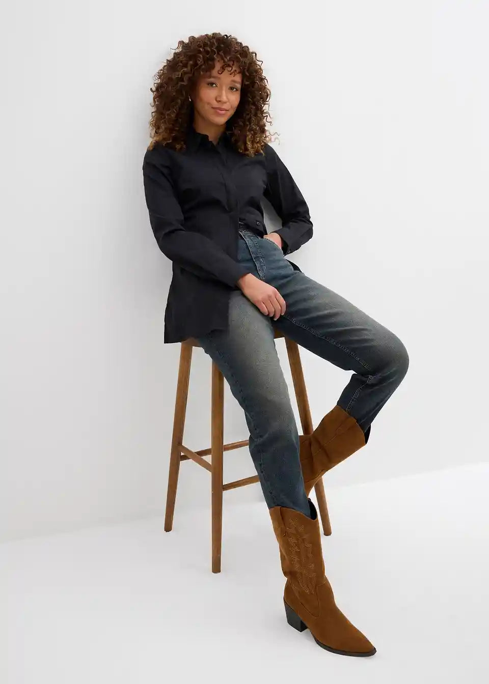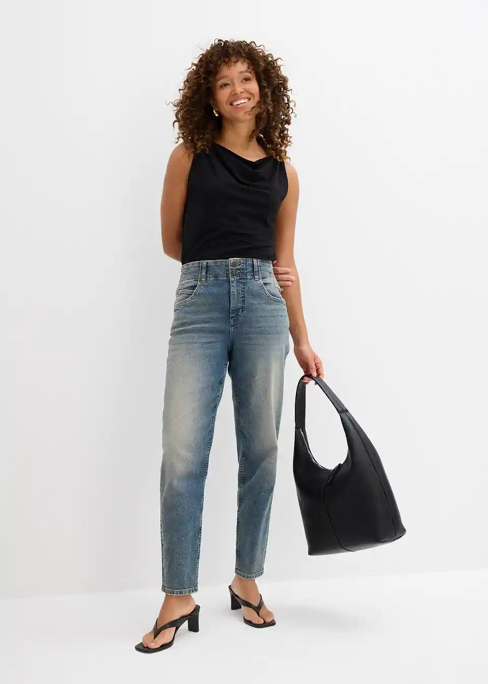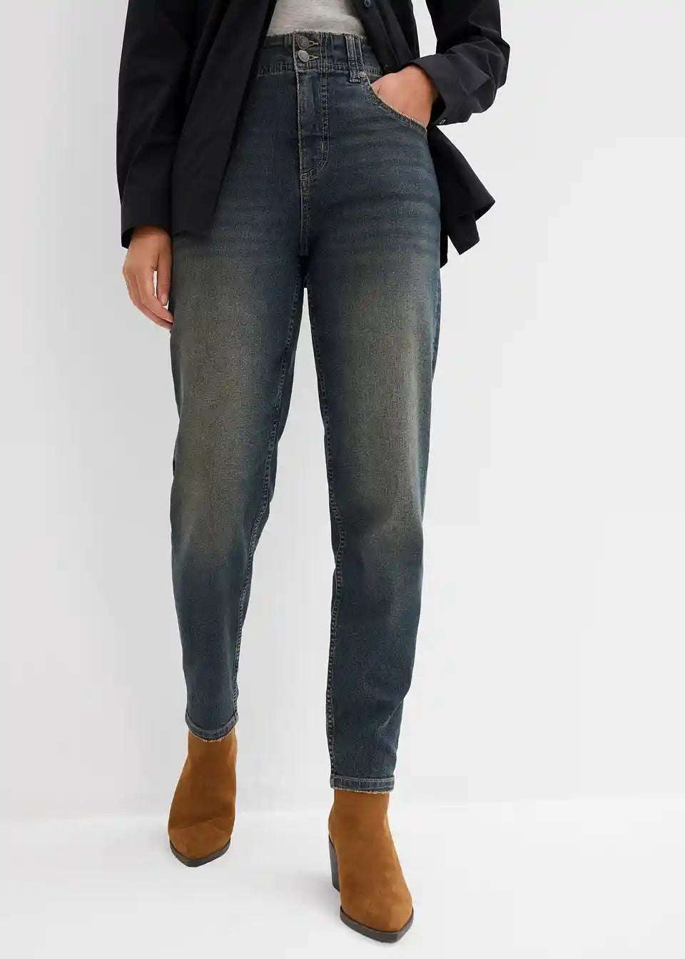 Mom 5-žepne kavbojke z visokim pasom in skrajšano hlačnico. Te kavbojke imajo zaradi spranega videza moderen učinek uporabljenega videza (ponošen look). Rahlo barvno puščanje med nošenjem in pranjem je značilno za te kavbojke. Dolžina v koraku pri št. 42 pribl. 73 cm, pralno v stroju.