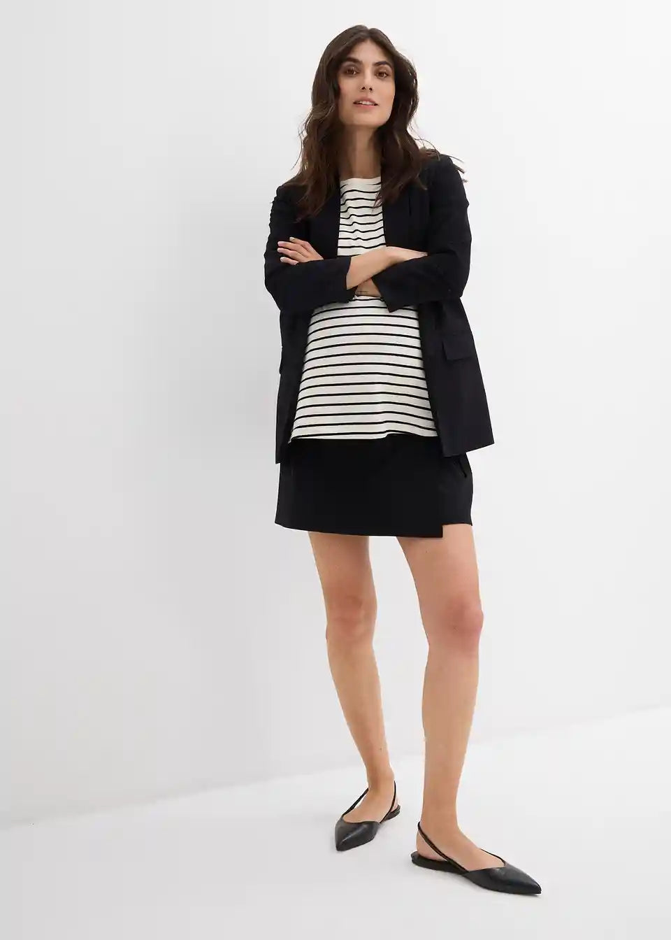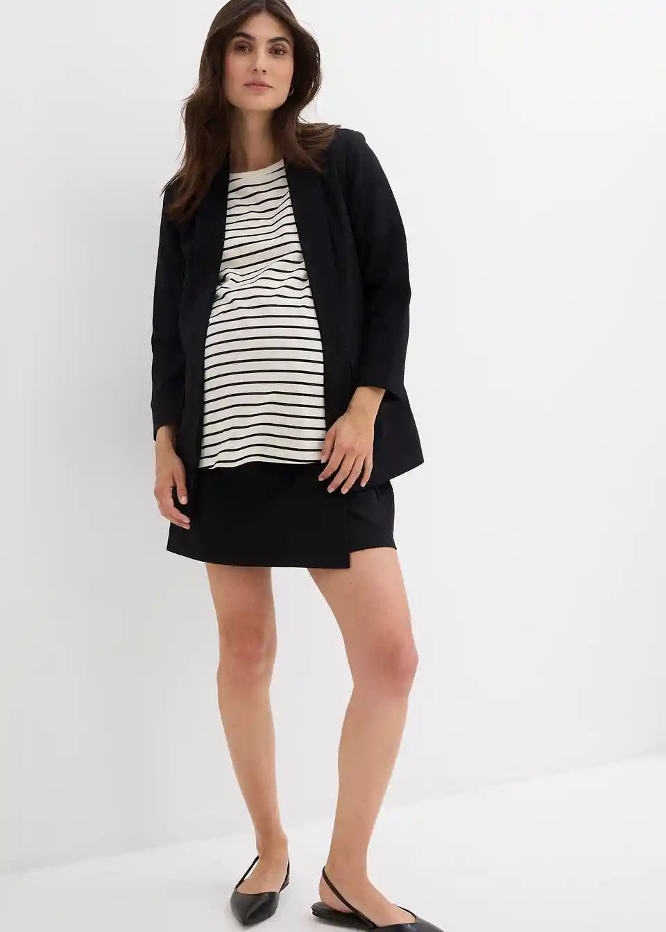 Nosečniško hlačno krilo iz mehkega, gosto tkanega interlocka je na prvi pogled videti kot krilo, vendar ponuja udobje hlač. Sprednji del ima preklopni videz z nastavljivim trakcem za zavezovanje in mehak všit elastičen pas v pasu. Širok pas iz jerseya iz raztegljivega bombaža zagotavlja optimalno prileganje trebušnemu predelu.