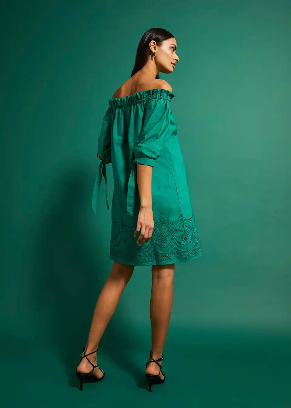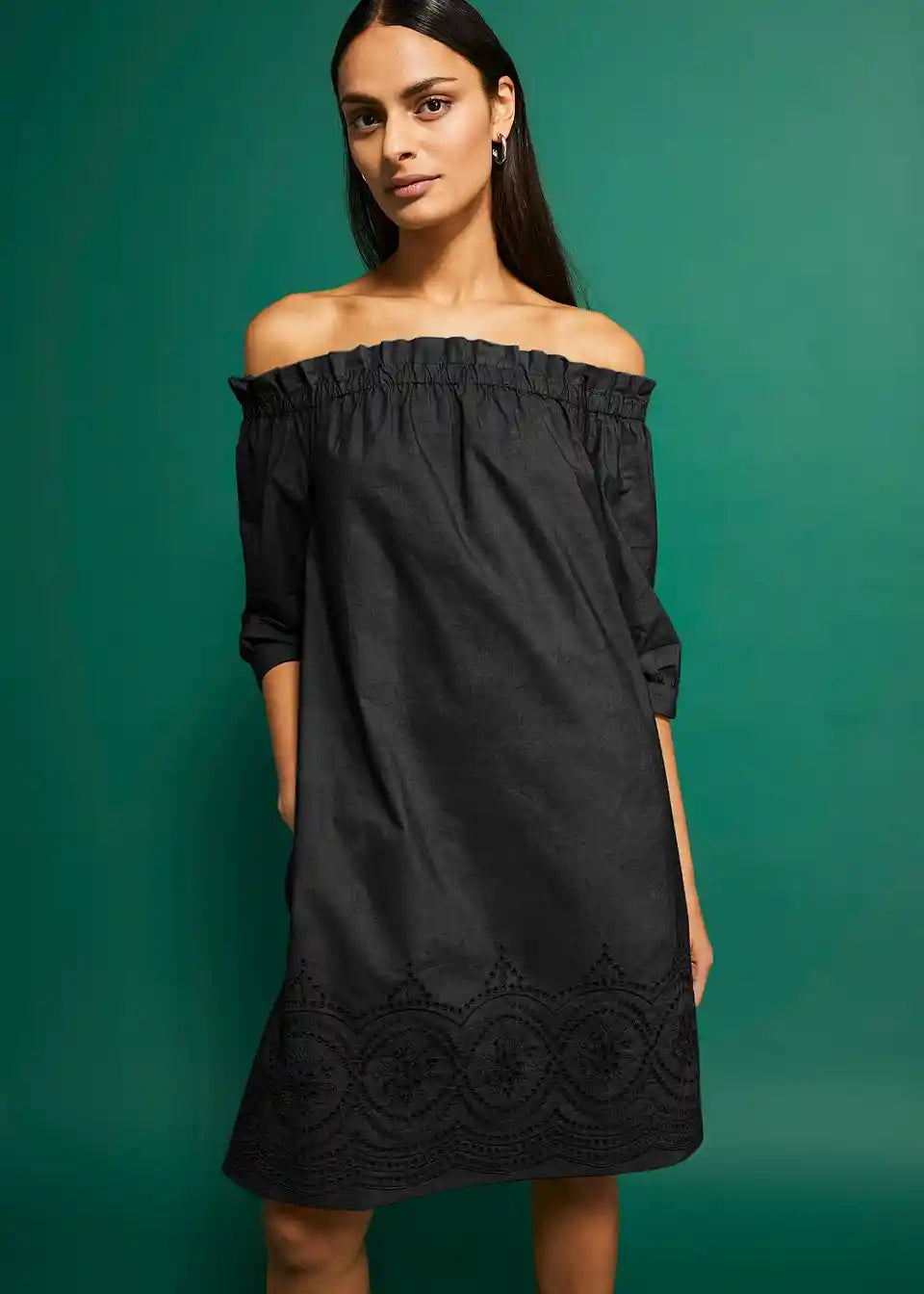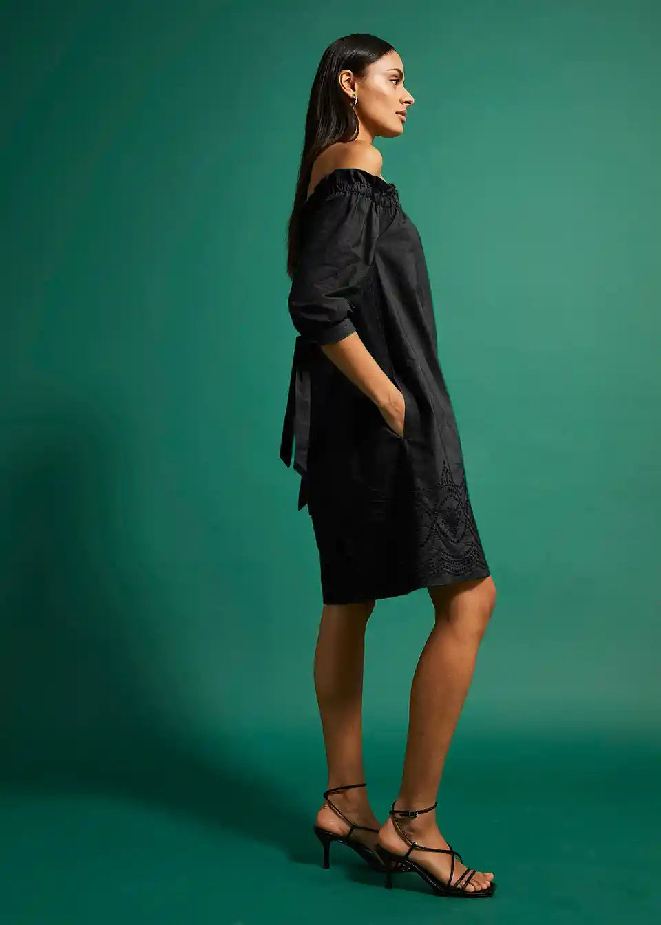 Obleka z odkritimi ramami in vezenino