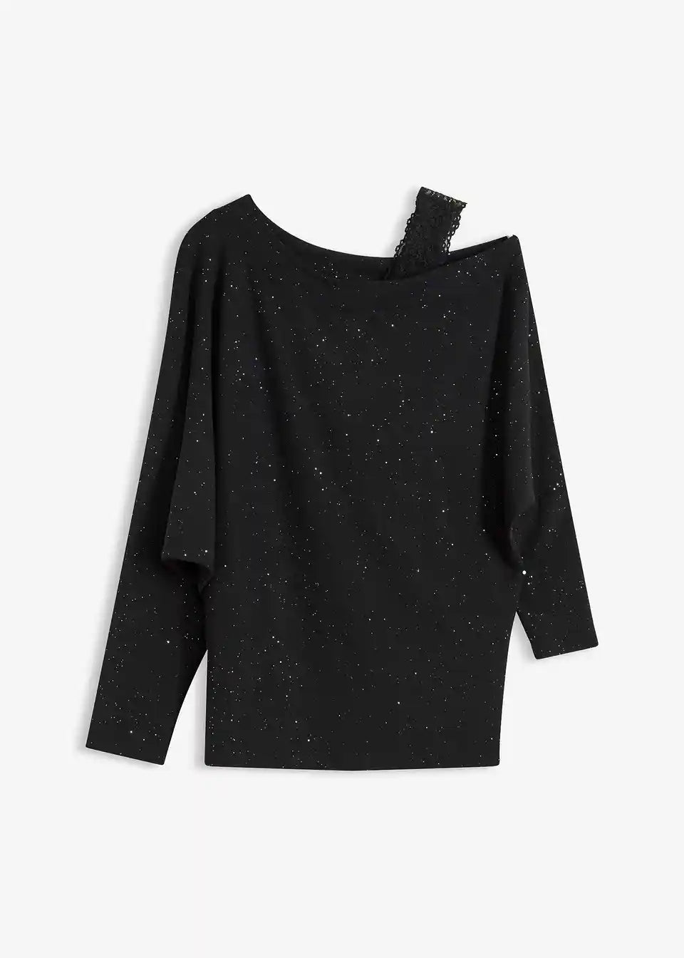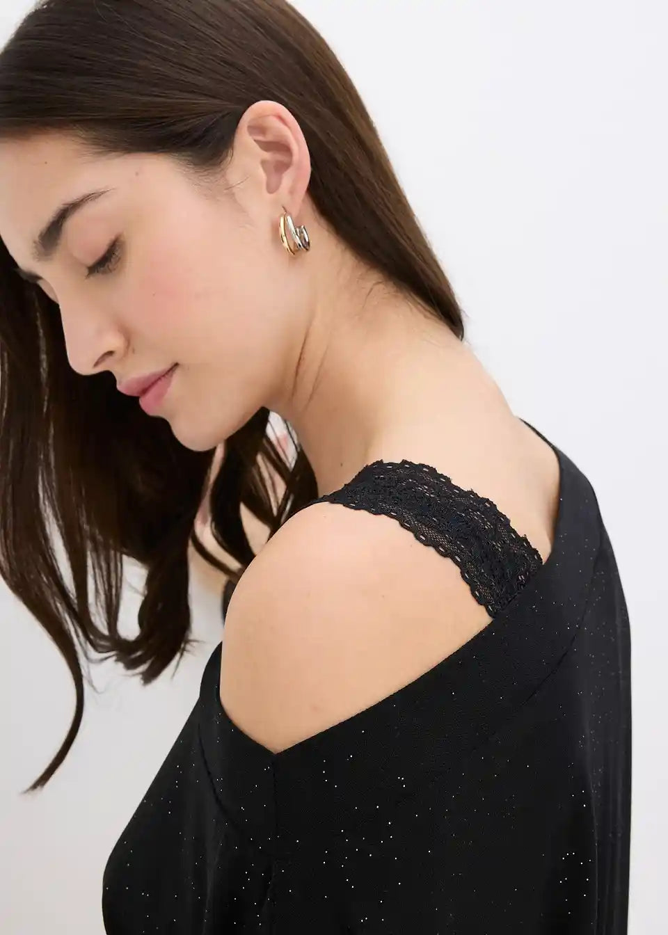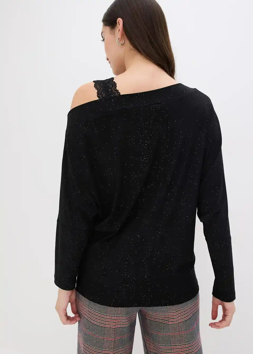 Modna majica z odkrito ramo, bleščicami in detajlom iz čipke