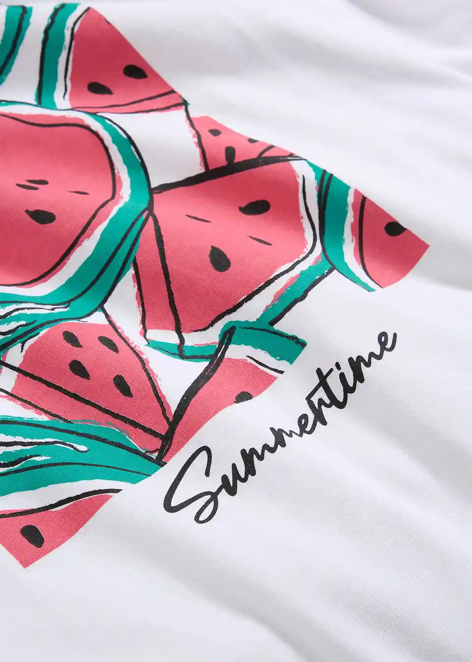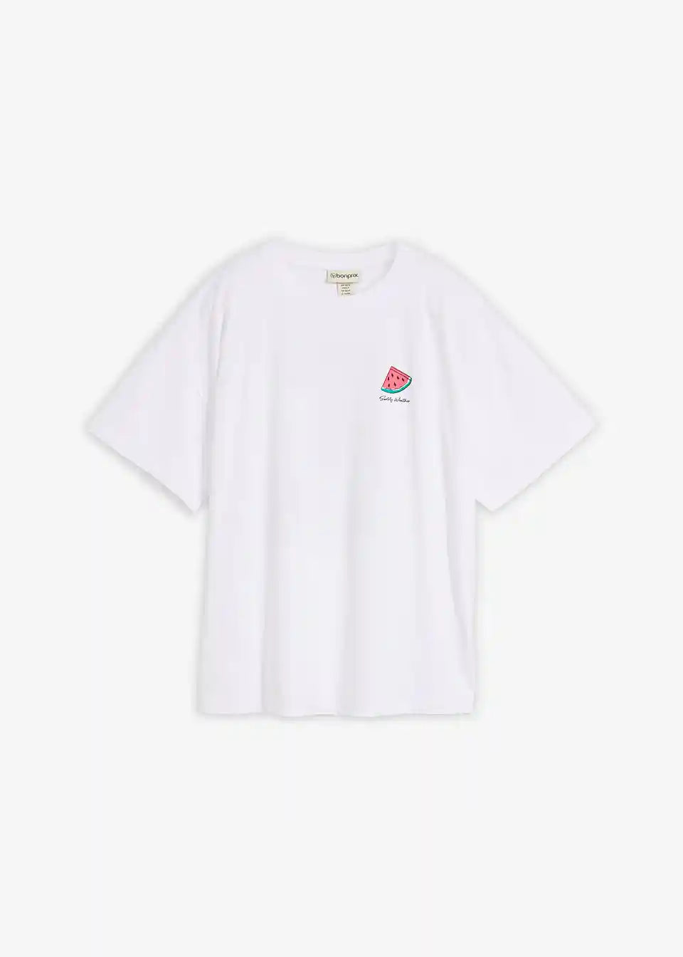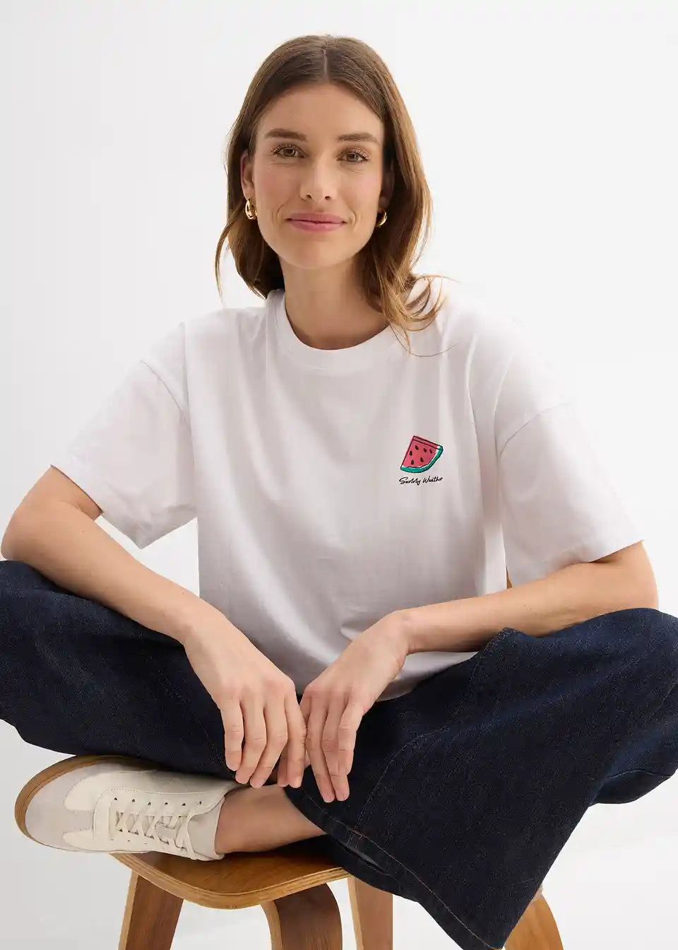 Potiskana T-Shirt majica z v rokave podaljšanimi ramami ter okroglim izrezom v ohlapnem kroju.